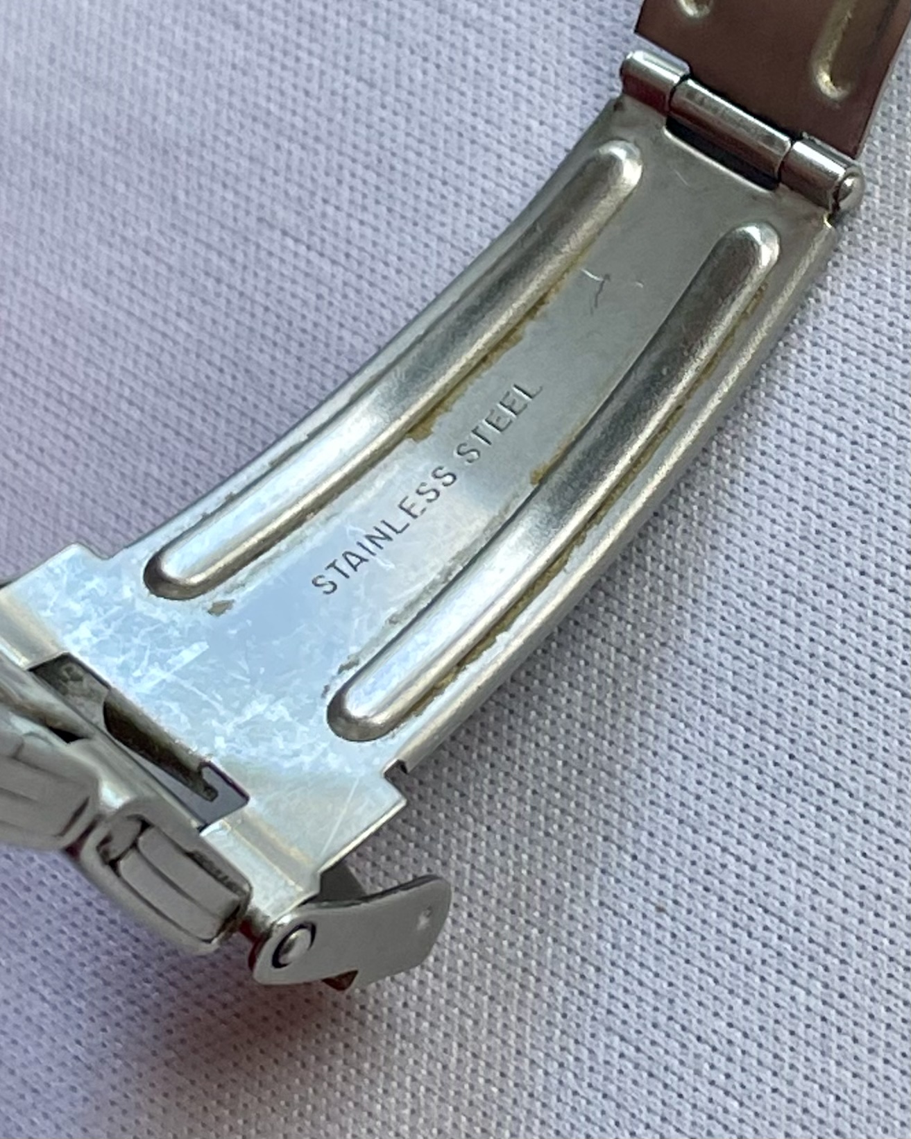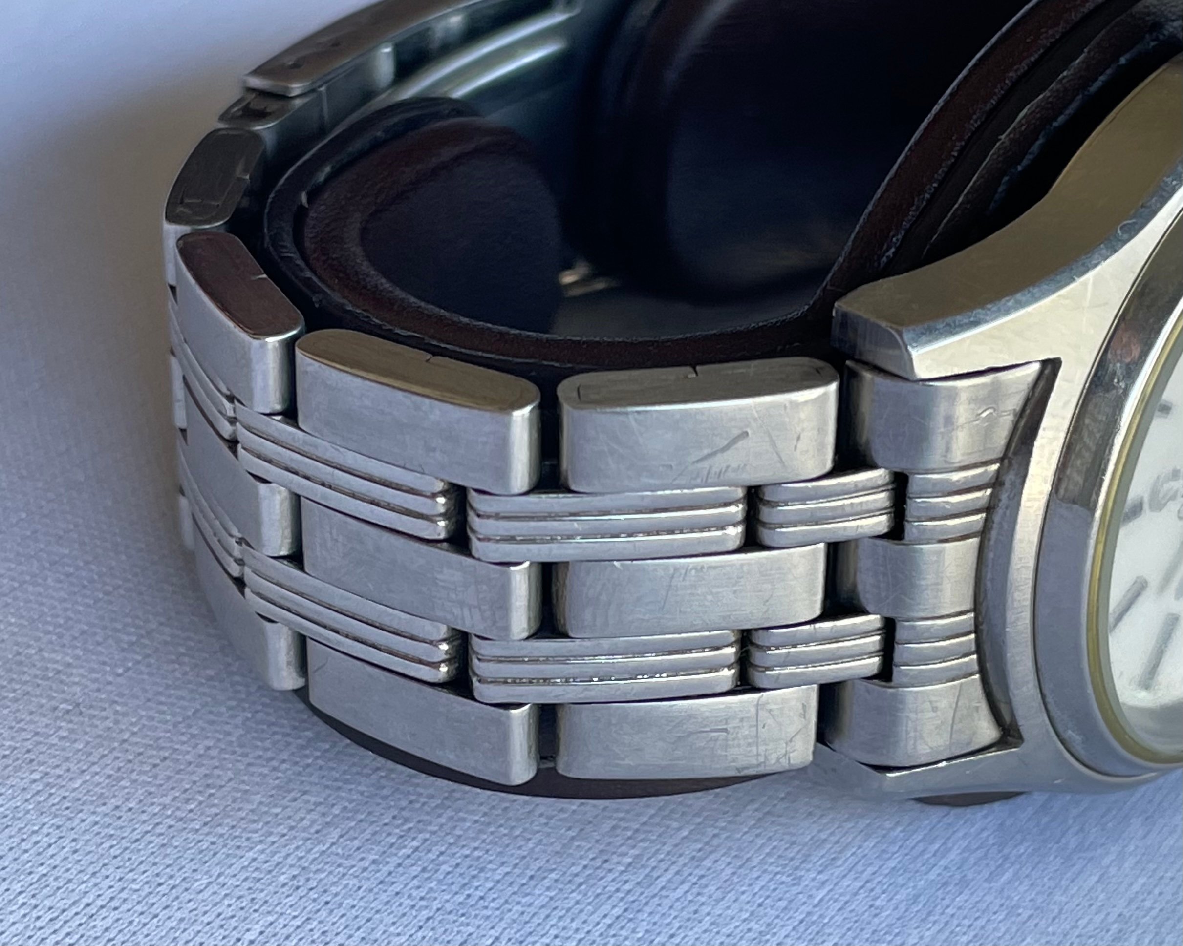 Bracelet: Unknown, apparently aftermarket SS bracelet and clasp. Some hairline scratches, rubs, or dents, as pictured. Stainless steel links and clasp. Bracelet barely fits (too tight) my large 21cm wrist at the shortest clasp-extension setting.