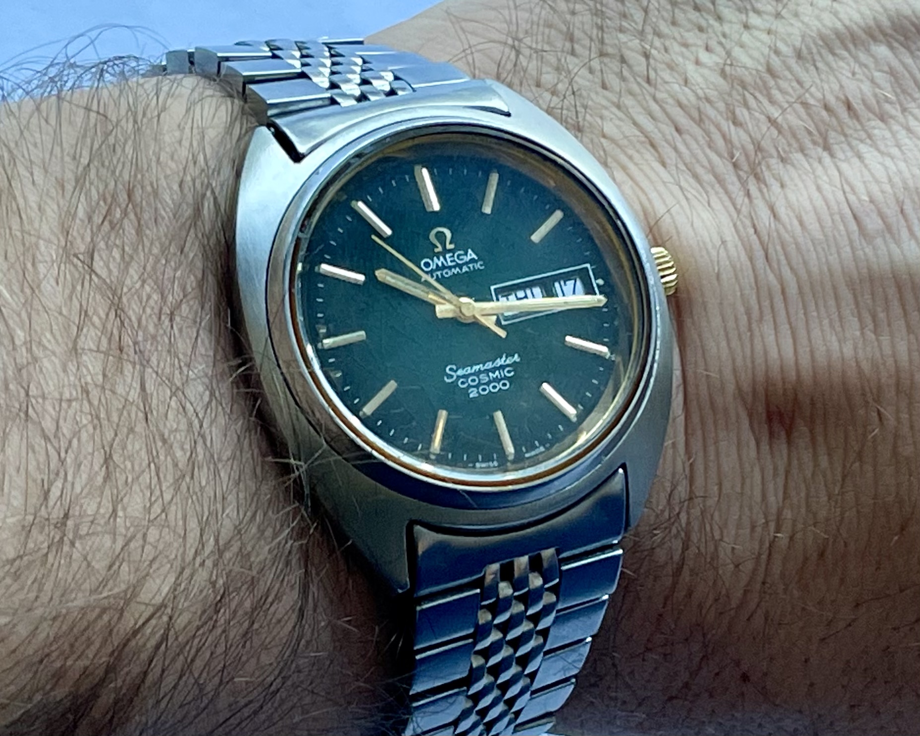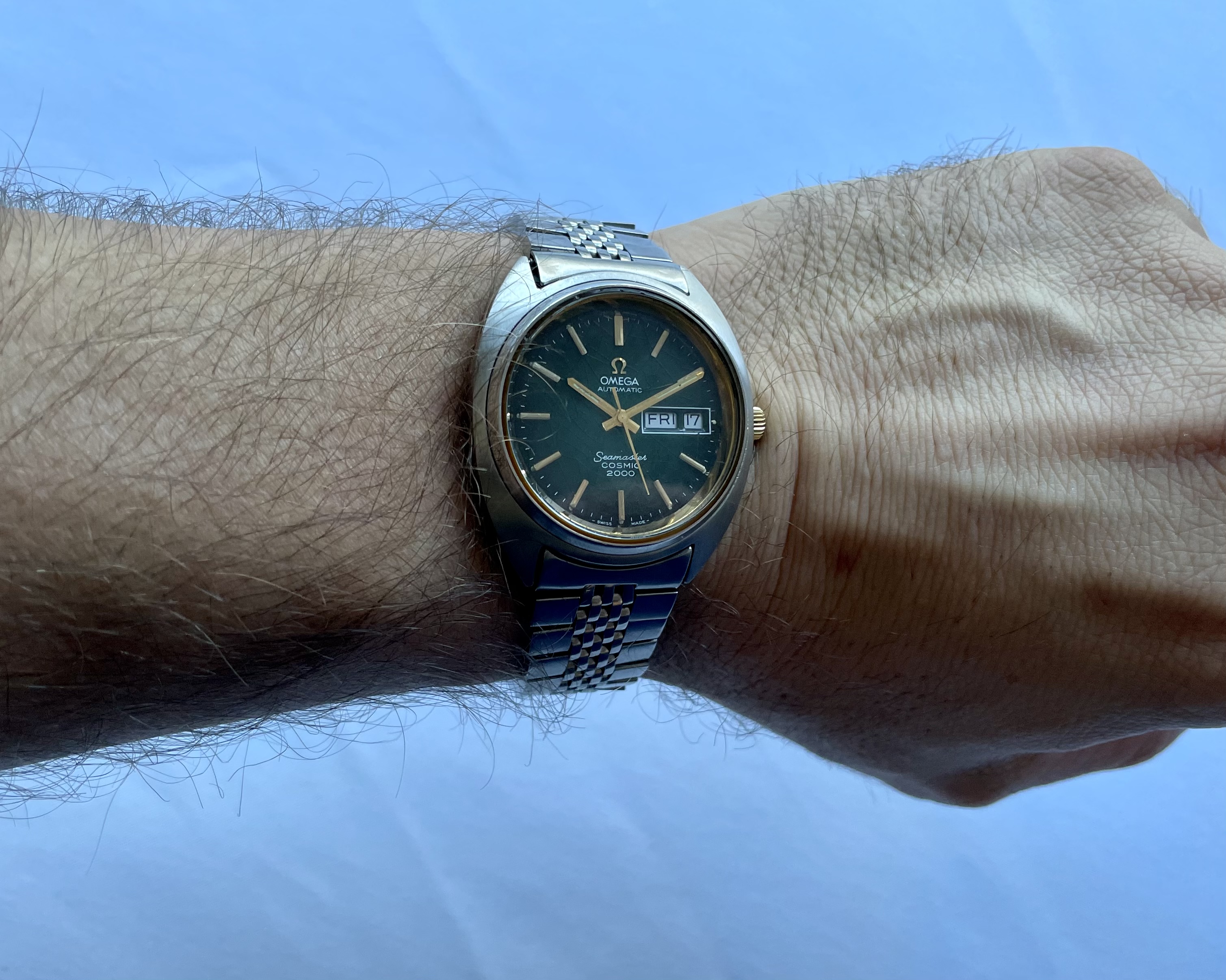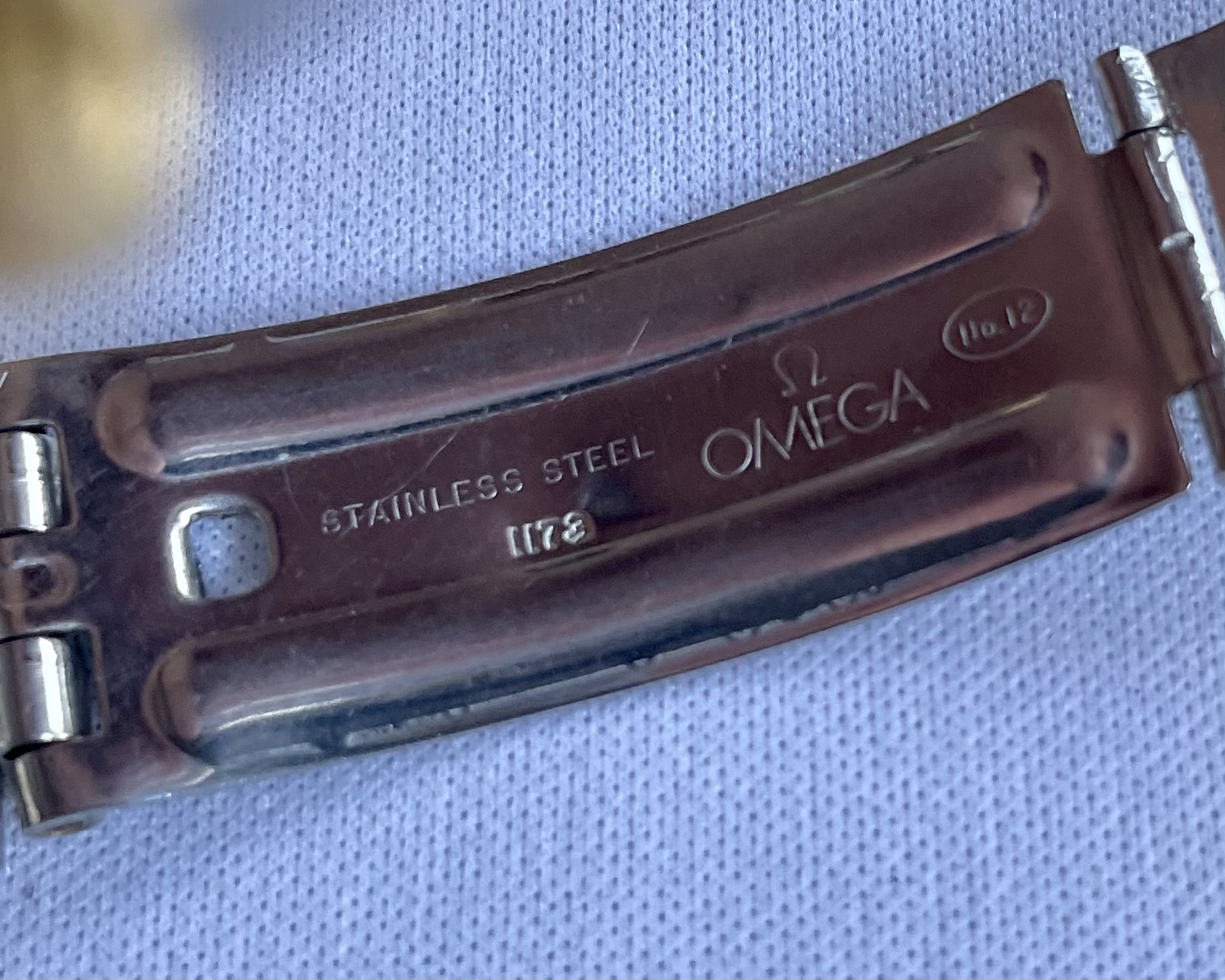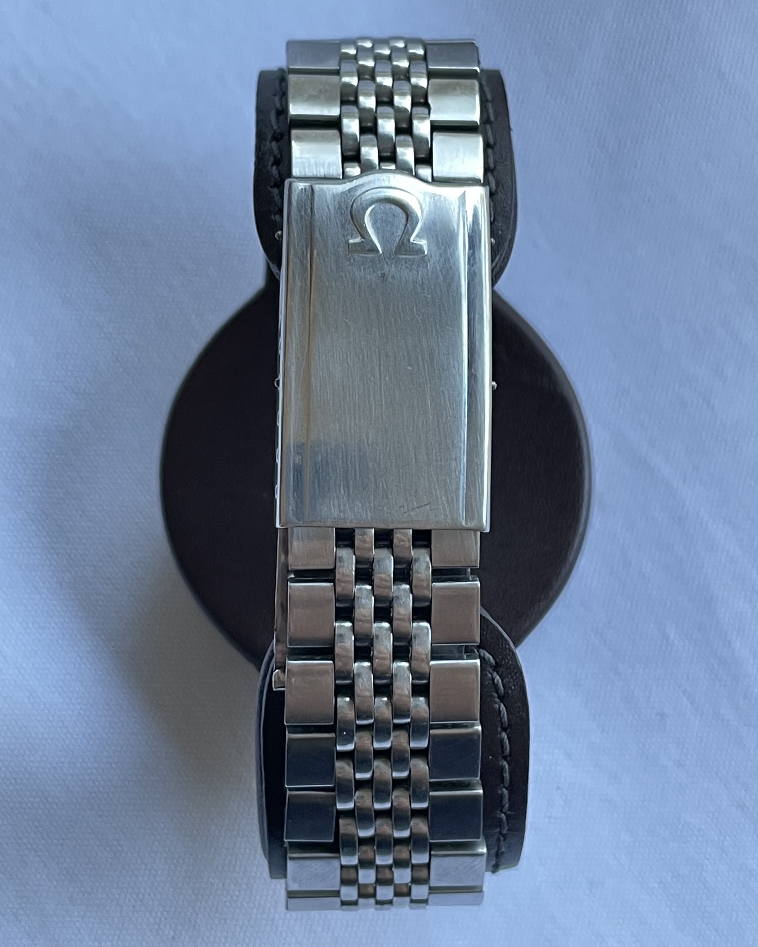 Bracelet: An Omega 1173 bracelet, with uncertain end-links (appear to fit well enough, but not perfectly). Some hairline scratches, rubs, no dents, as pictured. Stainless steel links and clasp. Bracelet barely fits comfortably my large 21cm wrist at the medium clasp-extension setting.