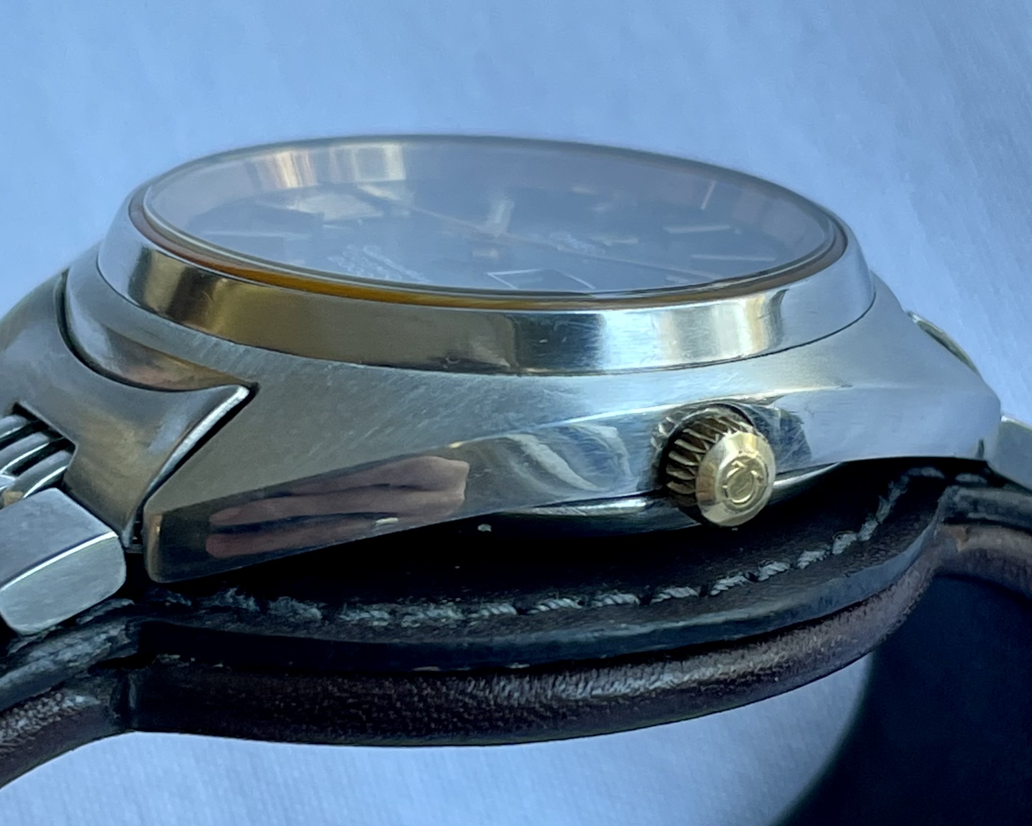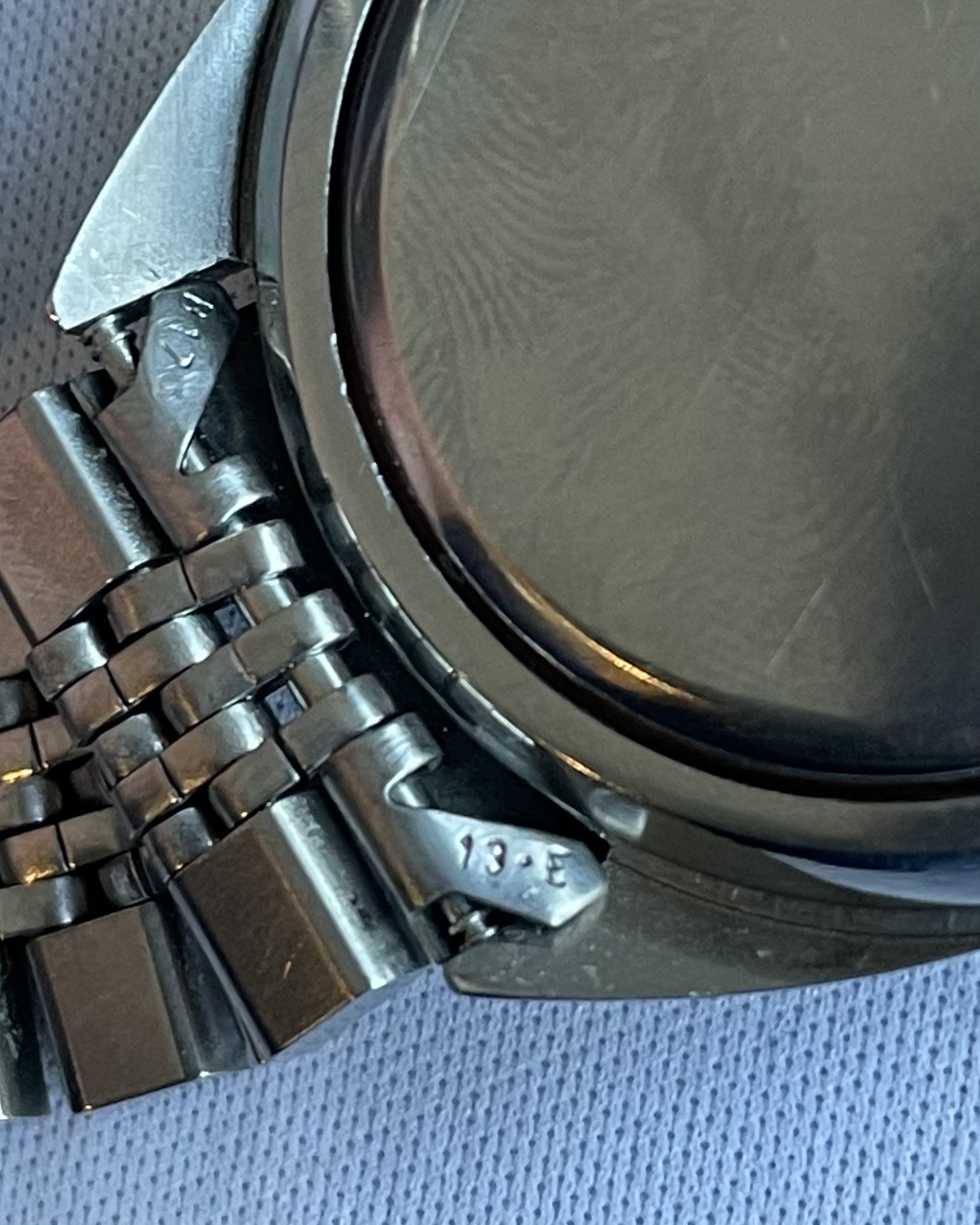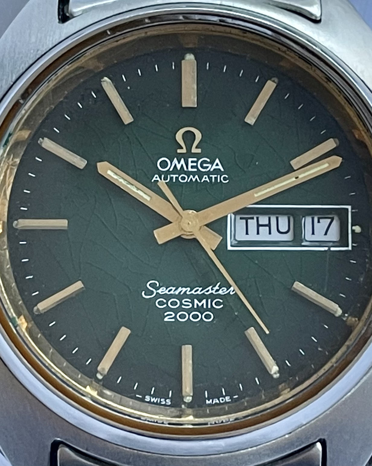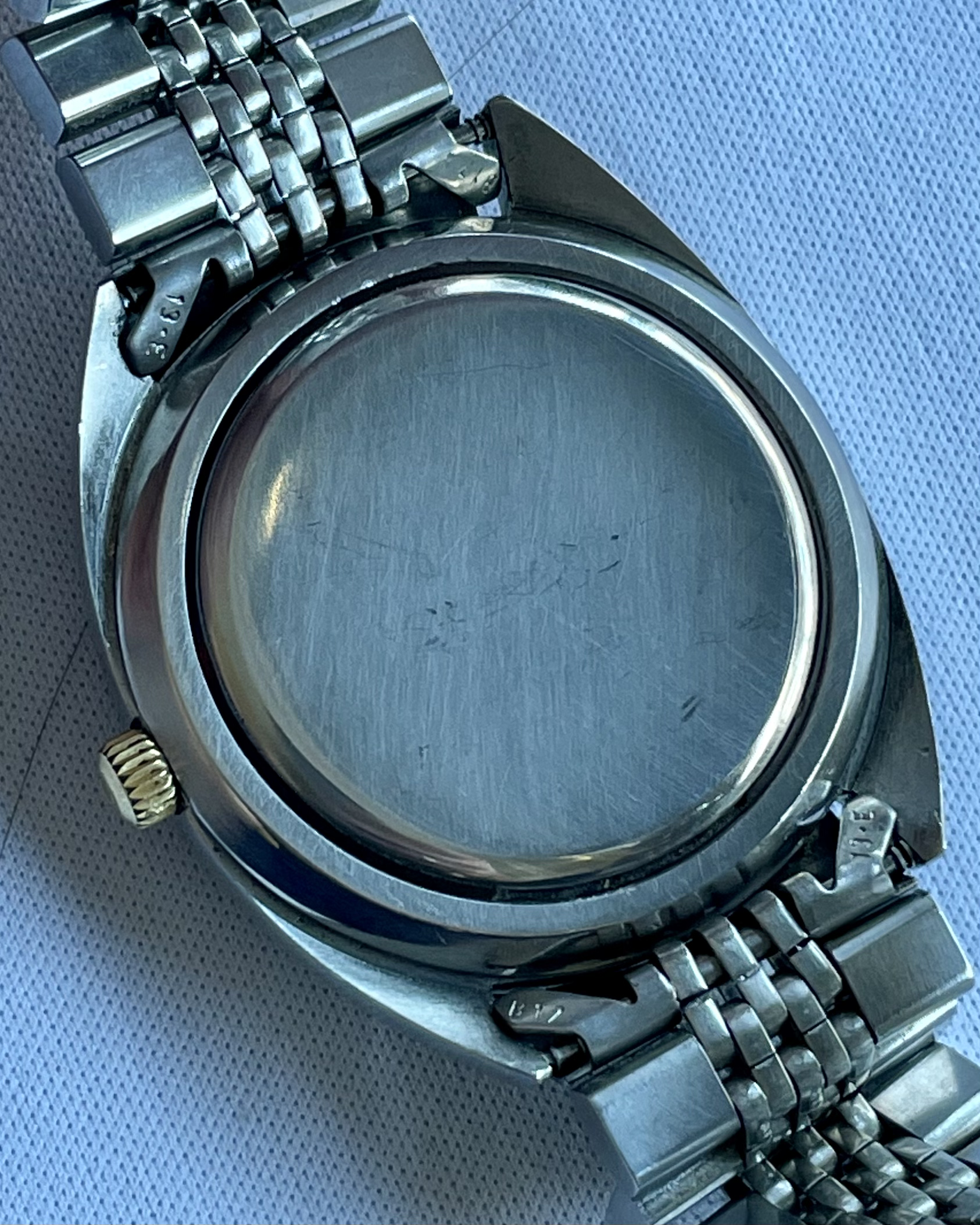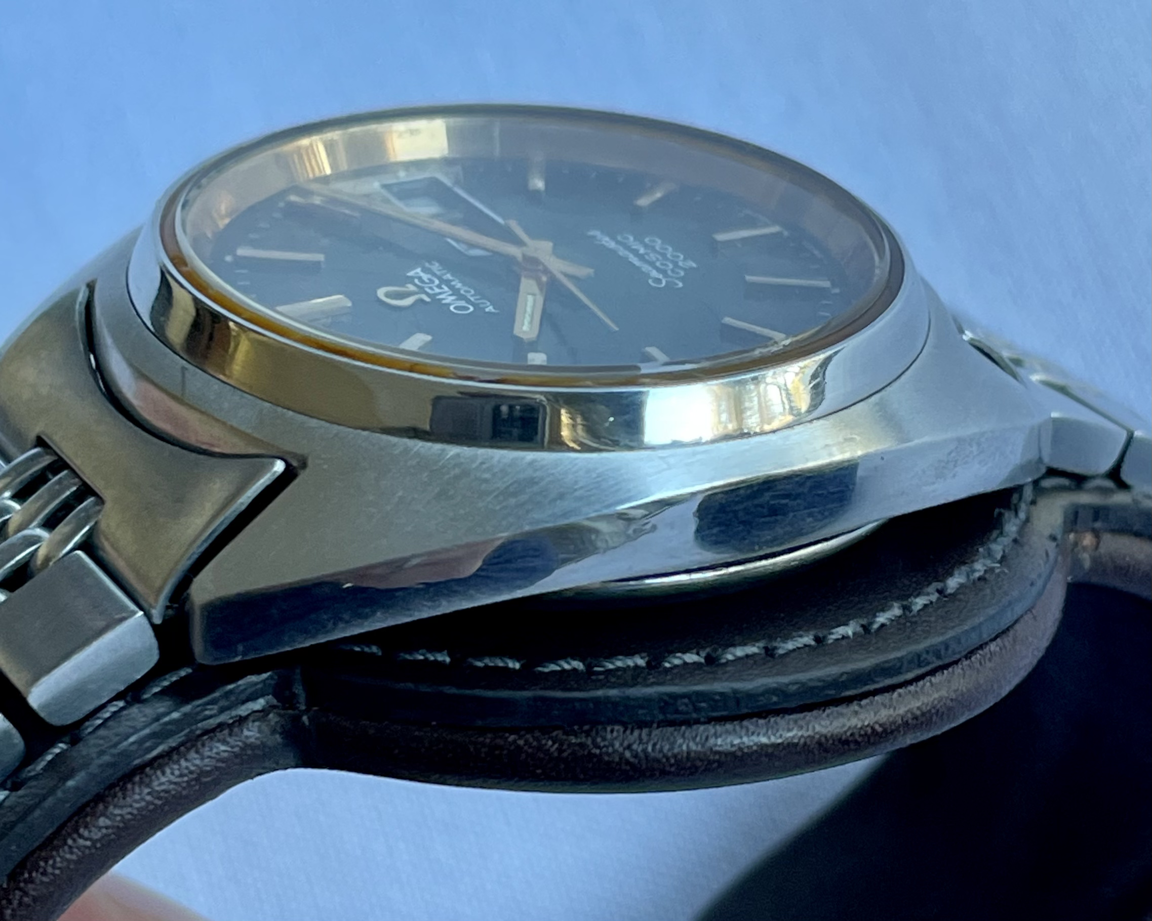 Bracelet: An Omega 1173 bracelet, with uncertain end-links (appear to fit well enough, but not perfectly). Some hairline scratches, rubs, no dents, as pictured. Stainless steel links and clasp. Bracelet barely fits comfortably my large 21cm wrist at the medium clasp-extension setting.