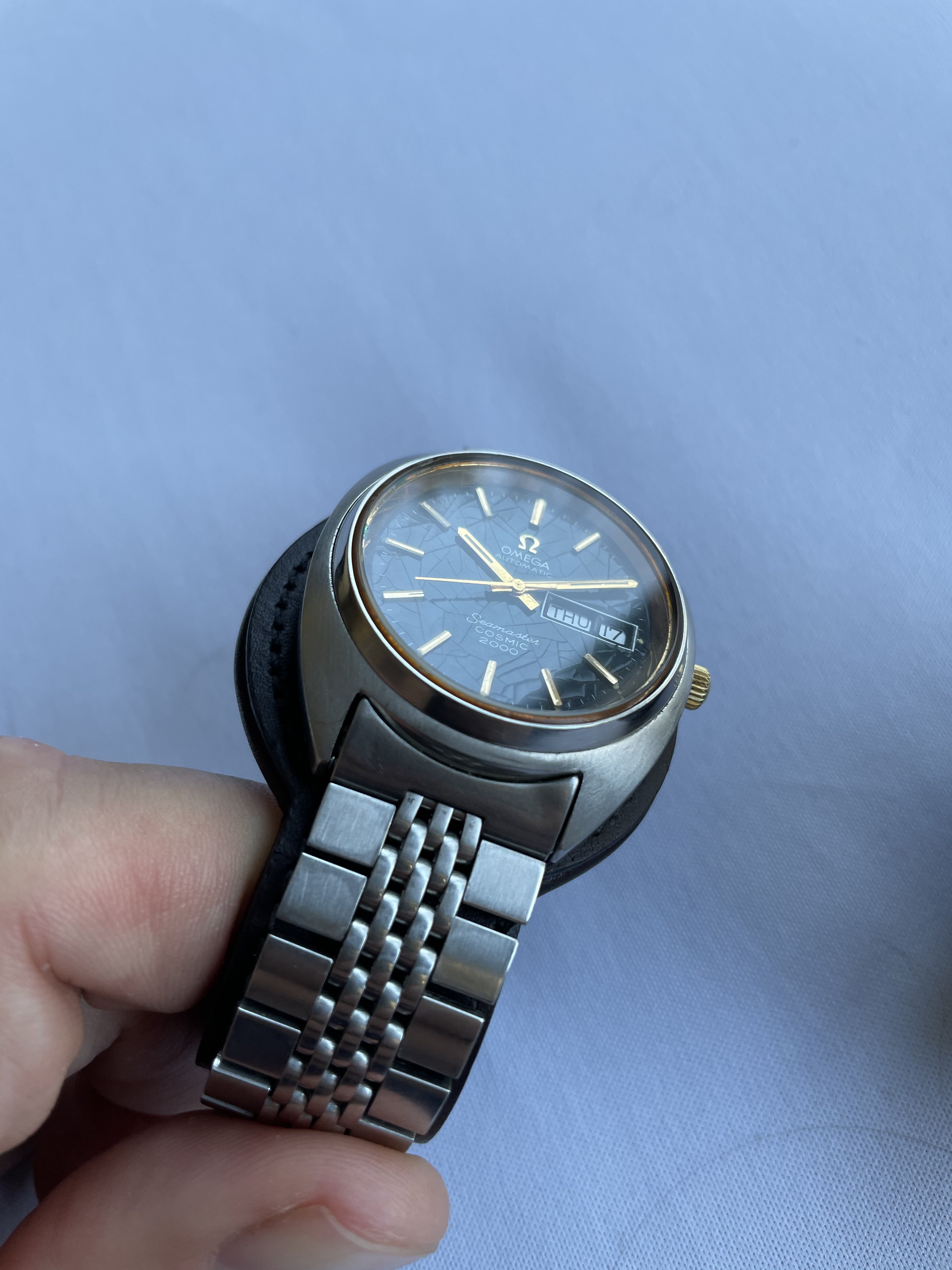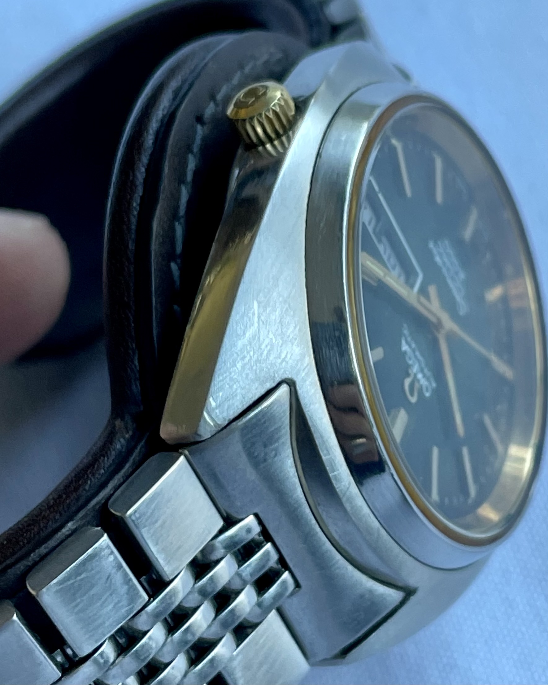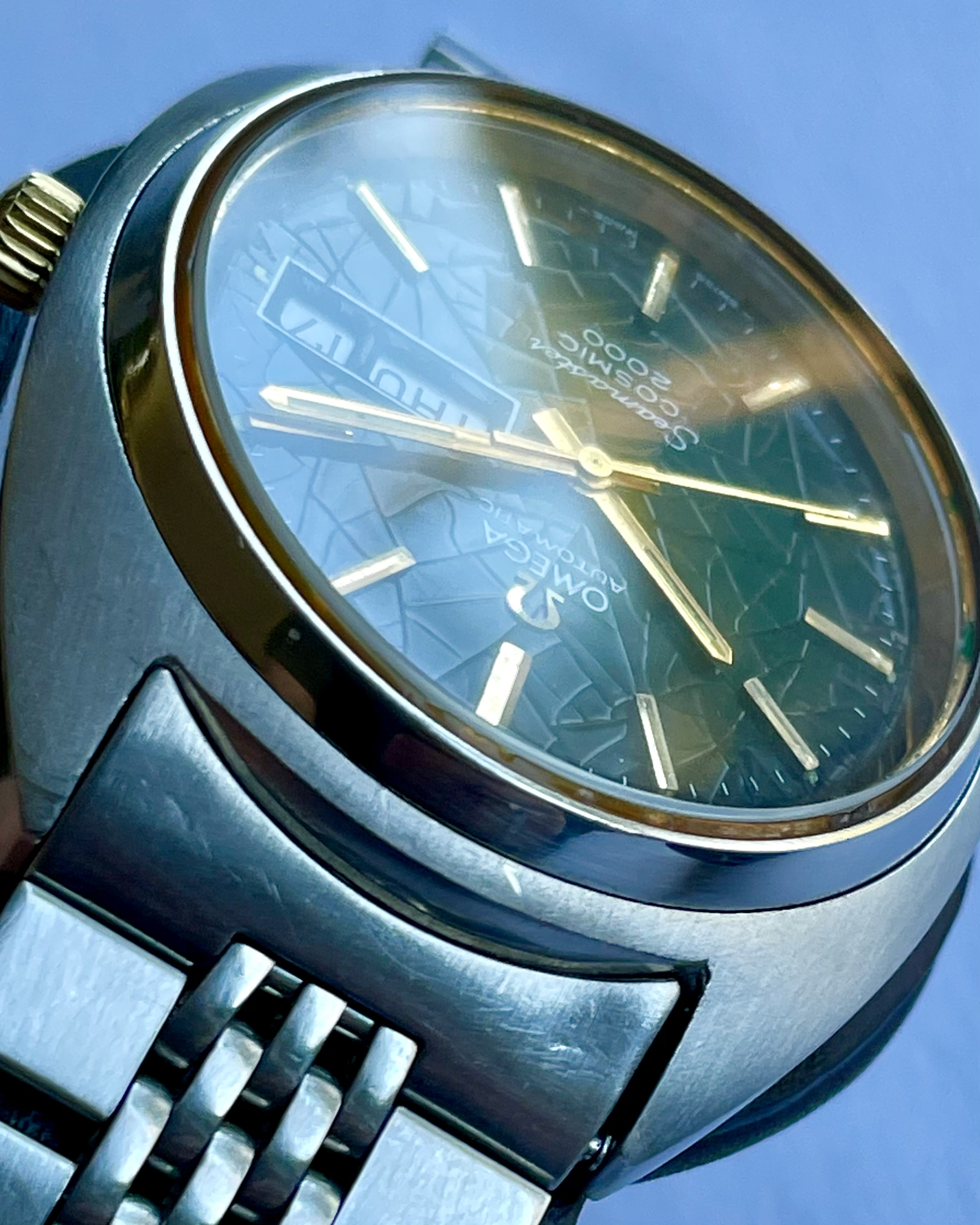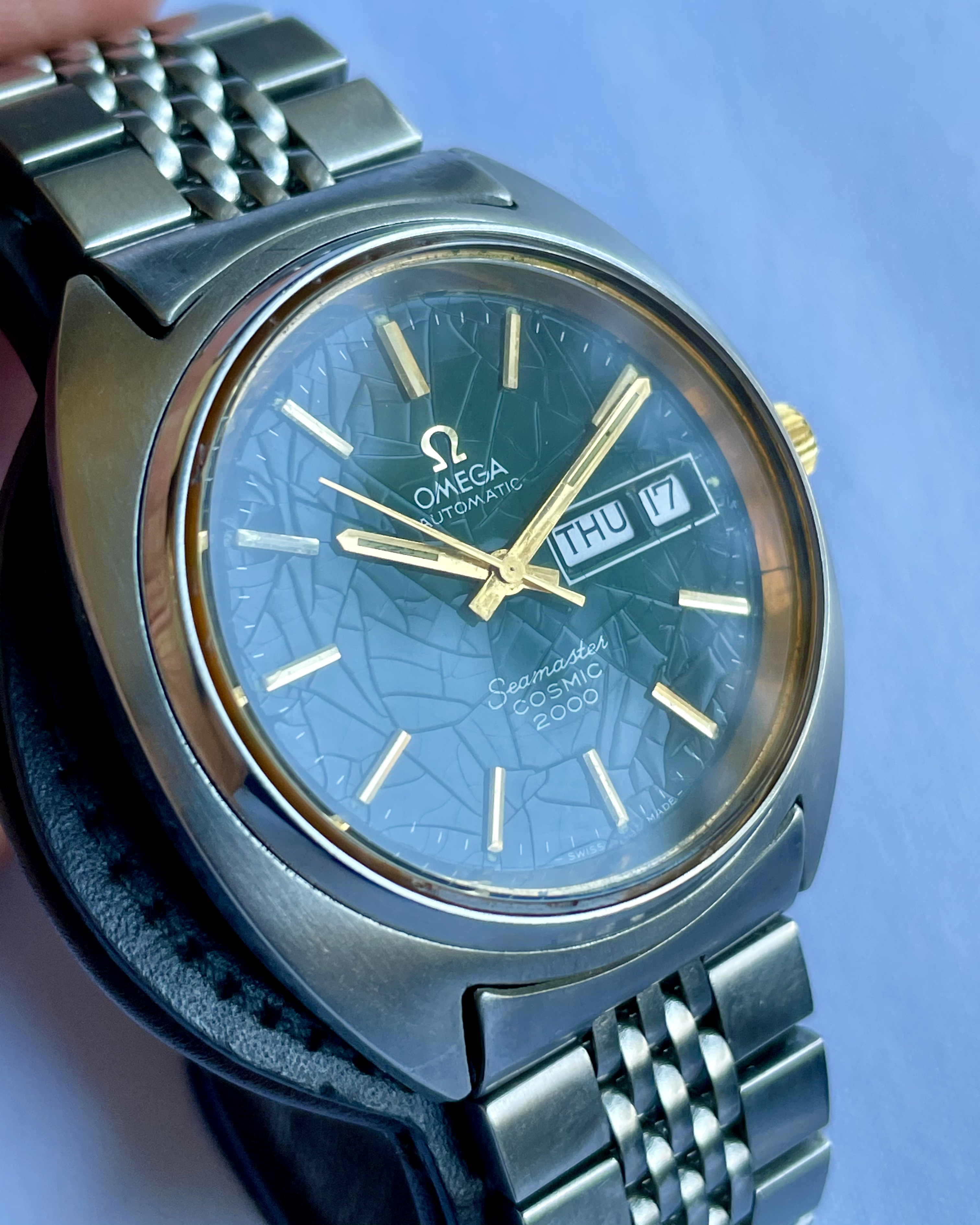 Bracelet: An Omega 1173 bracelet, with uncertain end-links (appear to fit well enough, but not perfectly). Some hairline scratches, rubs, no dents, as pictured. Stainless steel links and clasp. Bracelet barely fits comfortably my large 21cm wrist at the medium clasp-extension setting.