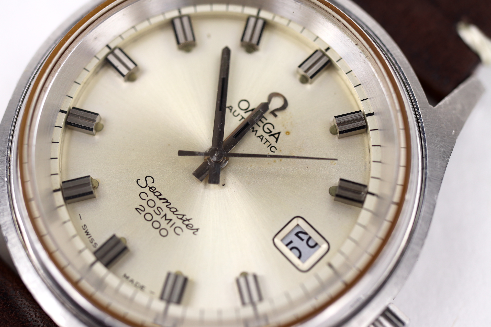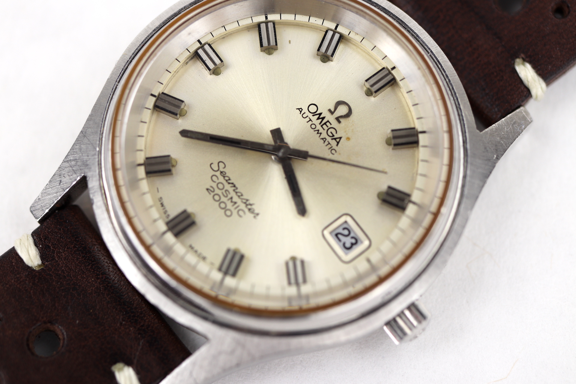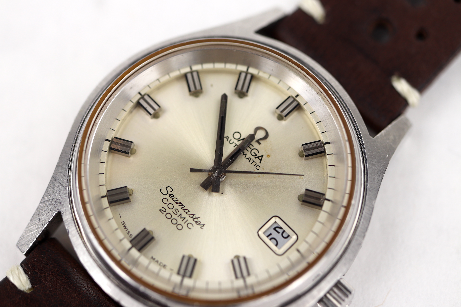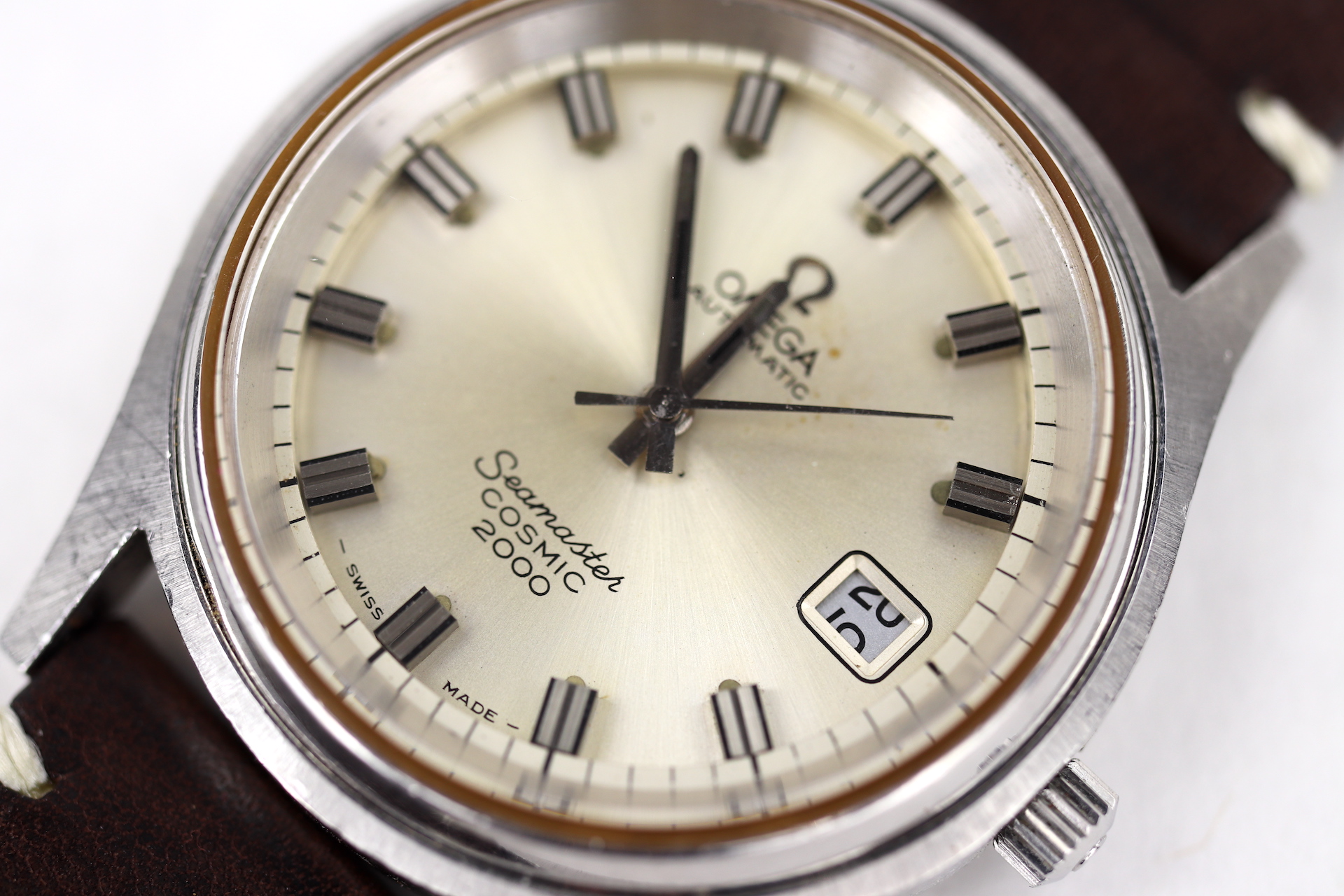 ·For sale, I have an Omega Seamaster Cosmic 2000 Ref: 166.0128 It has the Caliber 1012 which is an automatic movement. From the '70s, this is a very nice size watch for everyday wear. Case measure 38mm without the crown. Watch just came back from service. The Crown and Crystal were replaced. There are a couple of blemishes on the dial close to the applied logo. I can't open this type of case so unfortunately, I can not provide any movement pictures. The watch will come with a new leather strap.