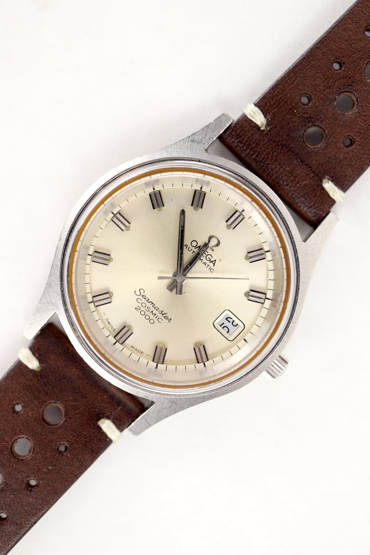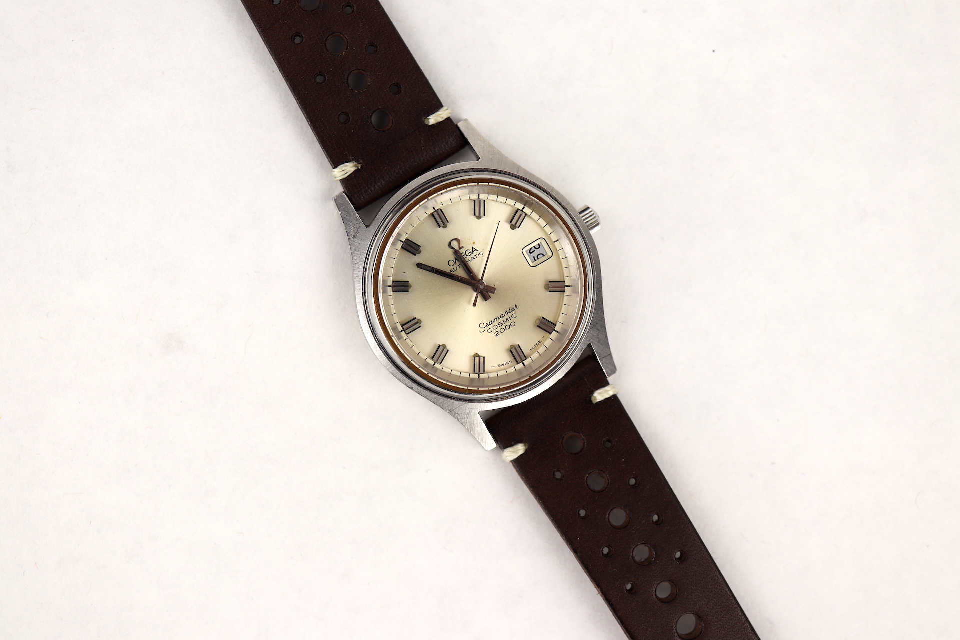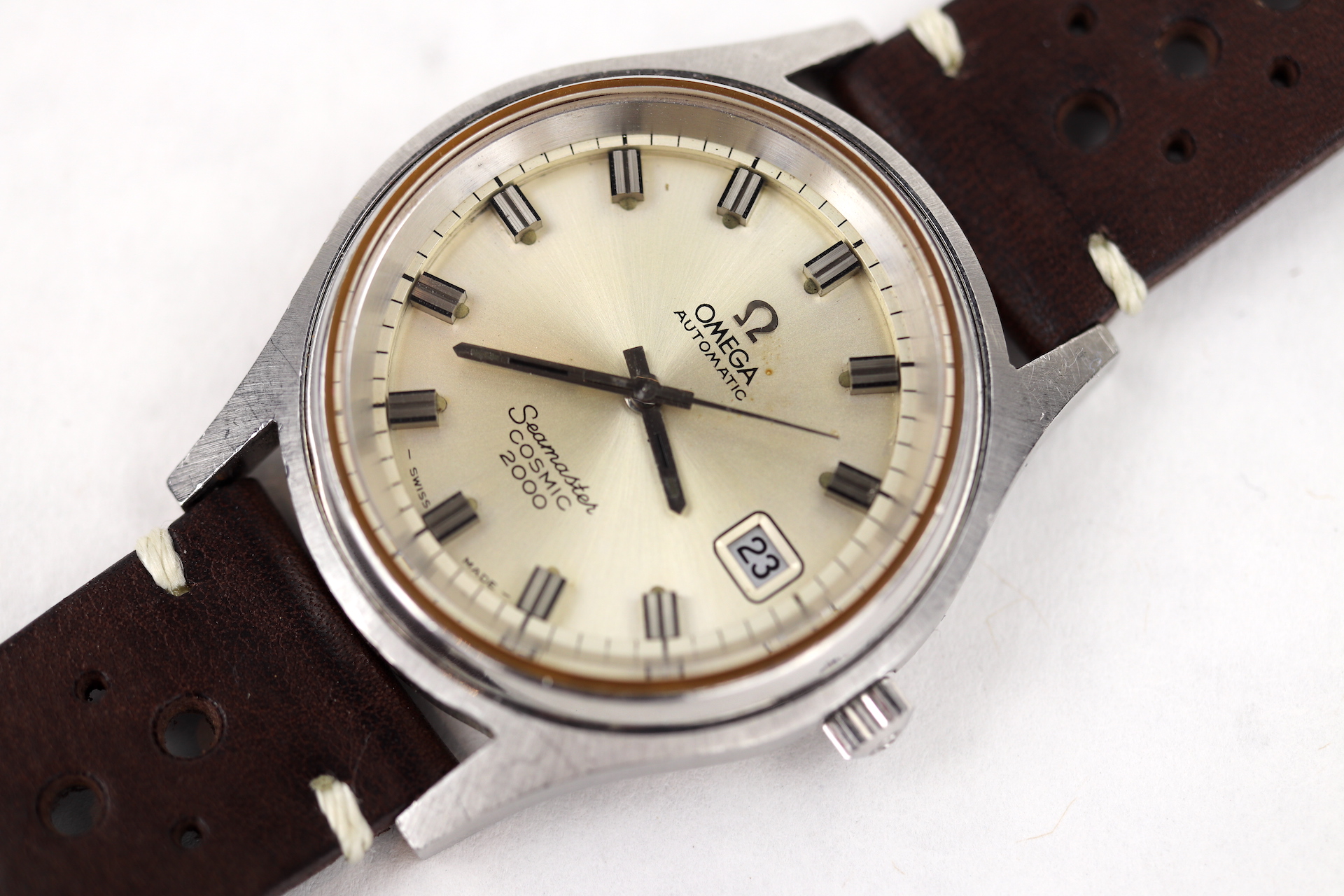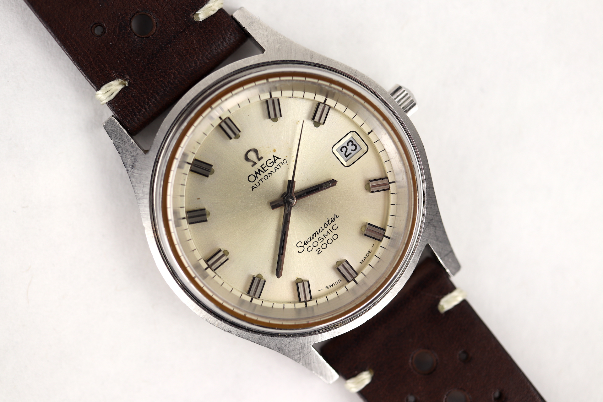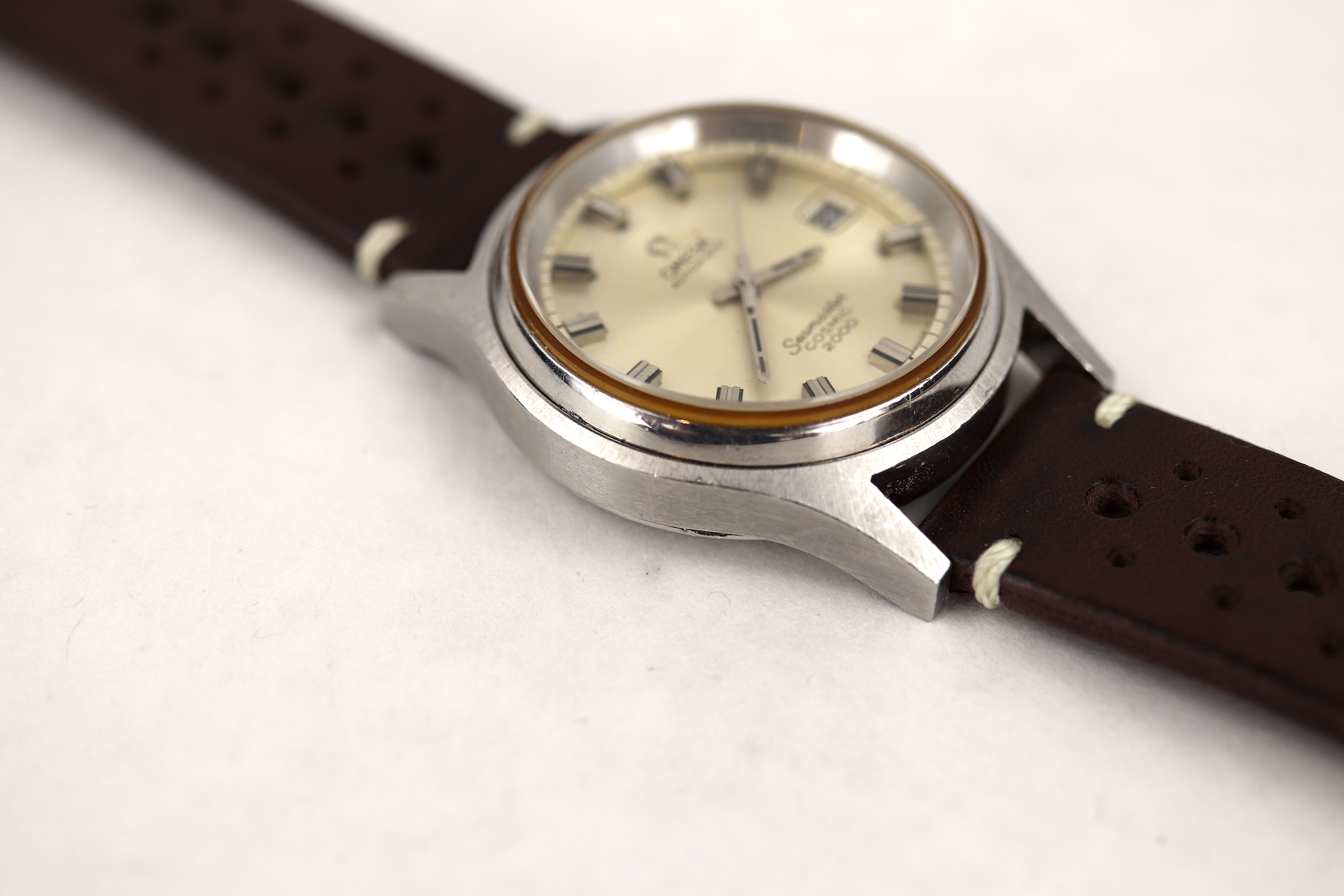 ·For sale, I have an Omega Seamaster Cosmic 2000 Ref: 166.0128 It has the Caliber 1012 which is an automatic movement. From the '70s, this is a very nice size watch for everyday wear. Case measure 38mm without the crown. Watch just came back from service. The Crown and Crystal were replaced. There are a couple of blemishes on the dial close to the applied logo. I can't open this type of case so unfortunately, I can not provide any movement pictures. The watch will come with a new leather strap.