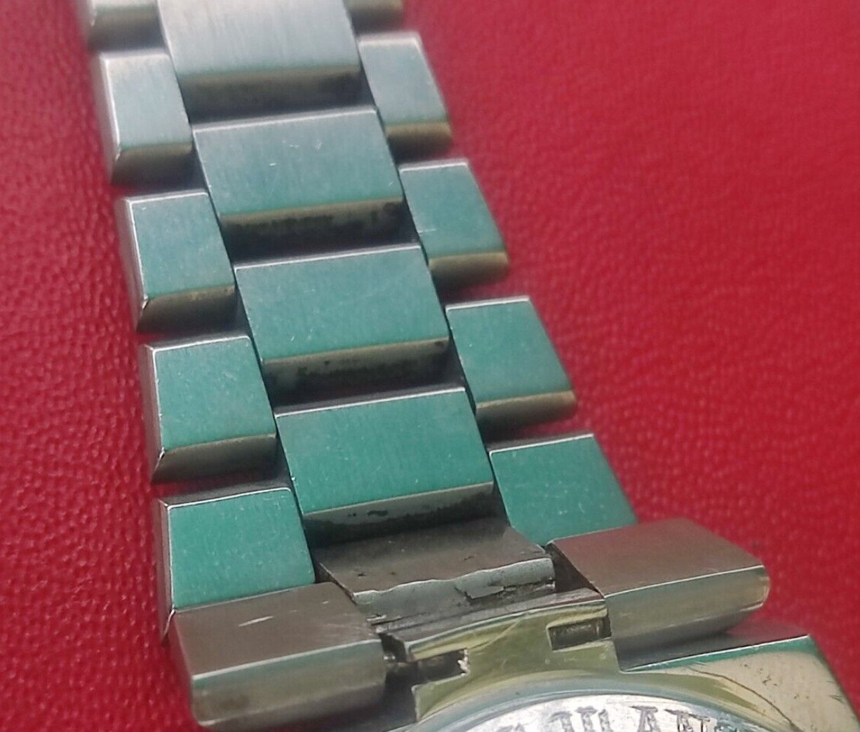 So links are missing, many links are re-attached in the wrong way, like upside down. How? Really no idea, the upper part is really pressed together. That must have been done with good tools. So it took quite a bit to get this tire back in good shape. In Brussels I was able to buy half of a bracelet. That solved half the problem. We started to refurbish the other part of the tire. The attachment to the case had become loose and had a lot of wear. There we filed, sanded and glued with two component glue. To loosen the links of the strap we used a dremel but also water and ultrasonic cleaner. The result was pitch black water and stuck links. I suspect that the previous owner worked somewhere in the oil industry or at least somewhere where a lot of dust was the order of the day, because it is really stuck. The reversed links were sawn off and there it turned out that it was not attached with push pins but pressed together. So no possibility of re-use. The bracelet has special push pins, which fortunately are still available. With normal pins it hangs together like loose sand: