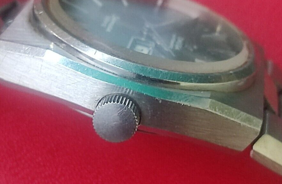 So bought it as not working but it does run. Day and date was defective only. Plate looked ugly due to water but it wasn't too bad in the end, so that was lucky. Opened watch together with a watchmaker friend and he quickly saw things were wrong. Crown and tube had been filed off and sort of fitted by a local Venozolan watchmaker, but there should be a screw-down crown on it.