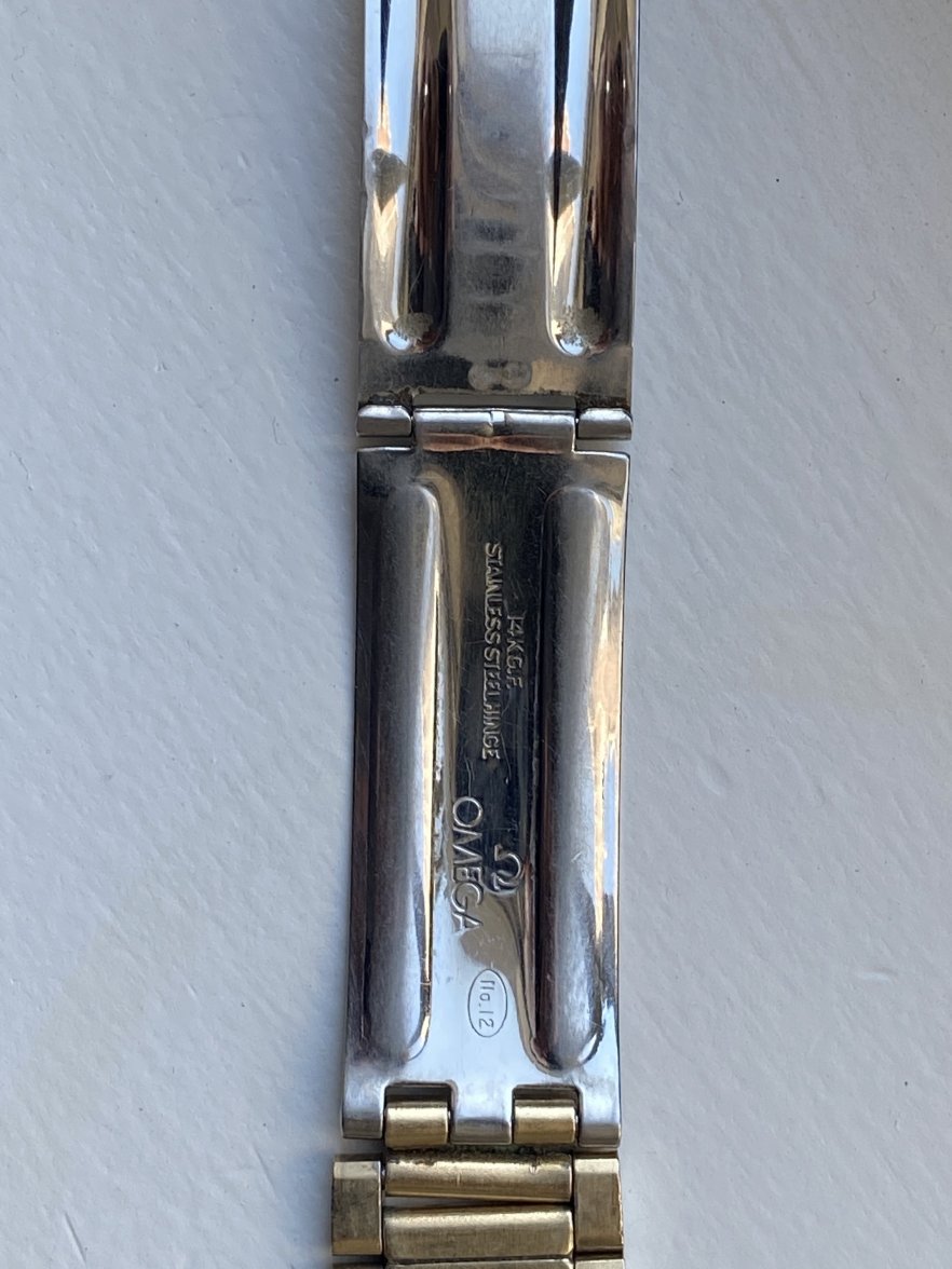 Bracelet CLASP inscription is 14K G.F., STAINLESS STEEL HINGE; Omega symbol & Omega; No.12