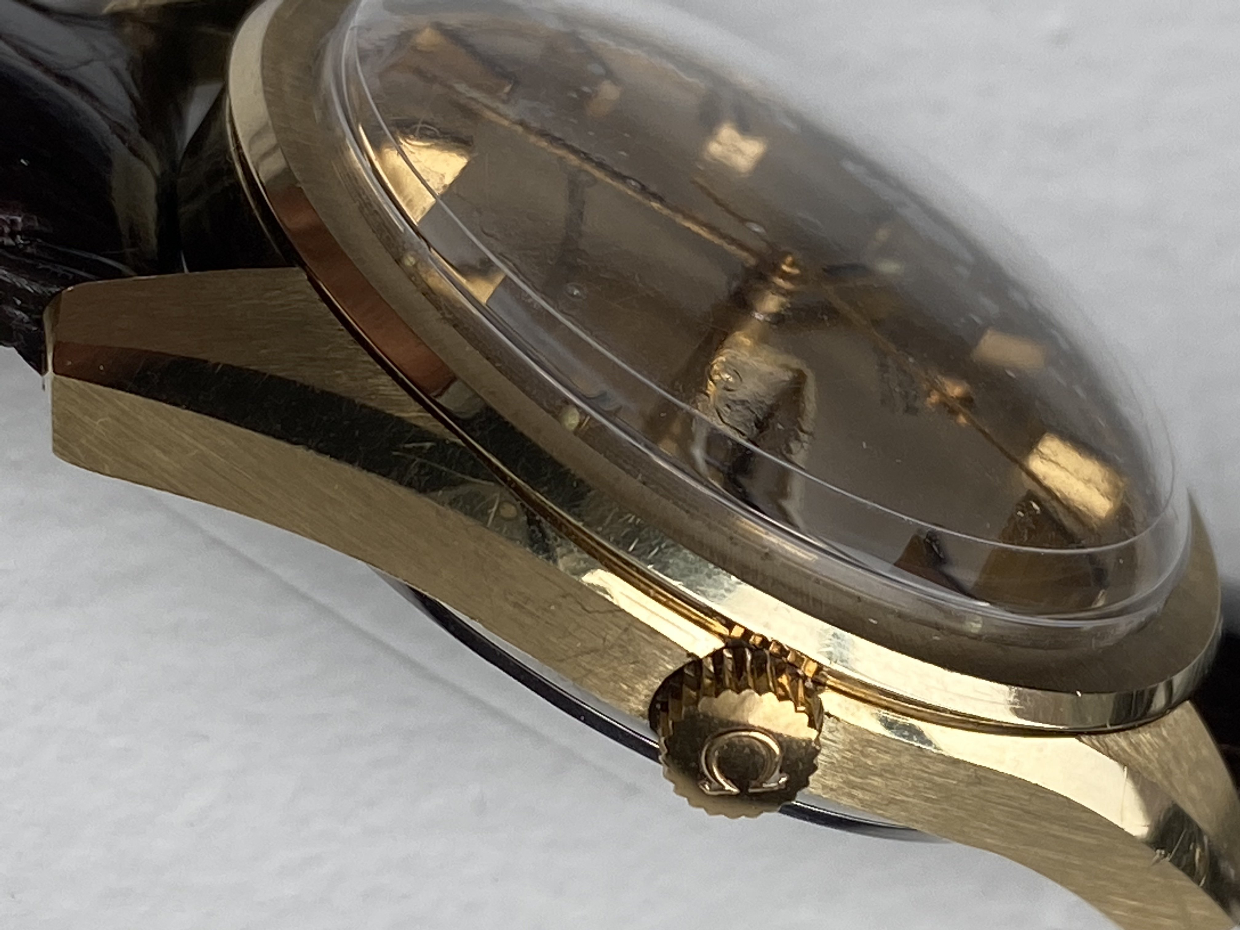 Great condition although has wearing marks due to age and caseback seems polished to my eye. Just the same, a lovely example. Original brushing is visible on case ... still visible! Watch works as should; no vintage watch is perfect though this is a VERY NICE EXAMPLE. Photos reflect condition. Note the service plastic is still covering the plexi.