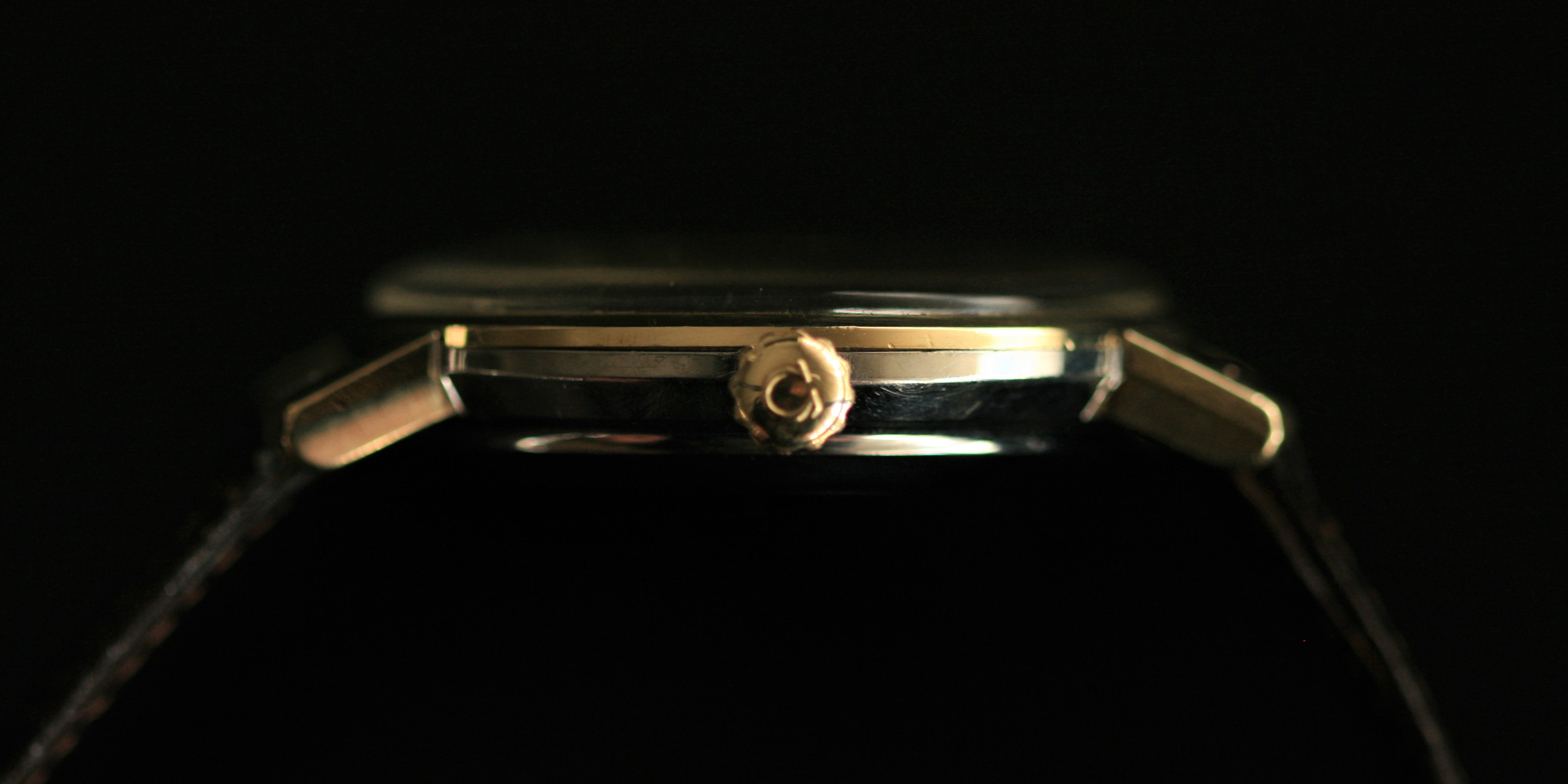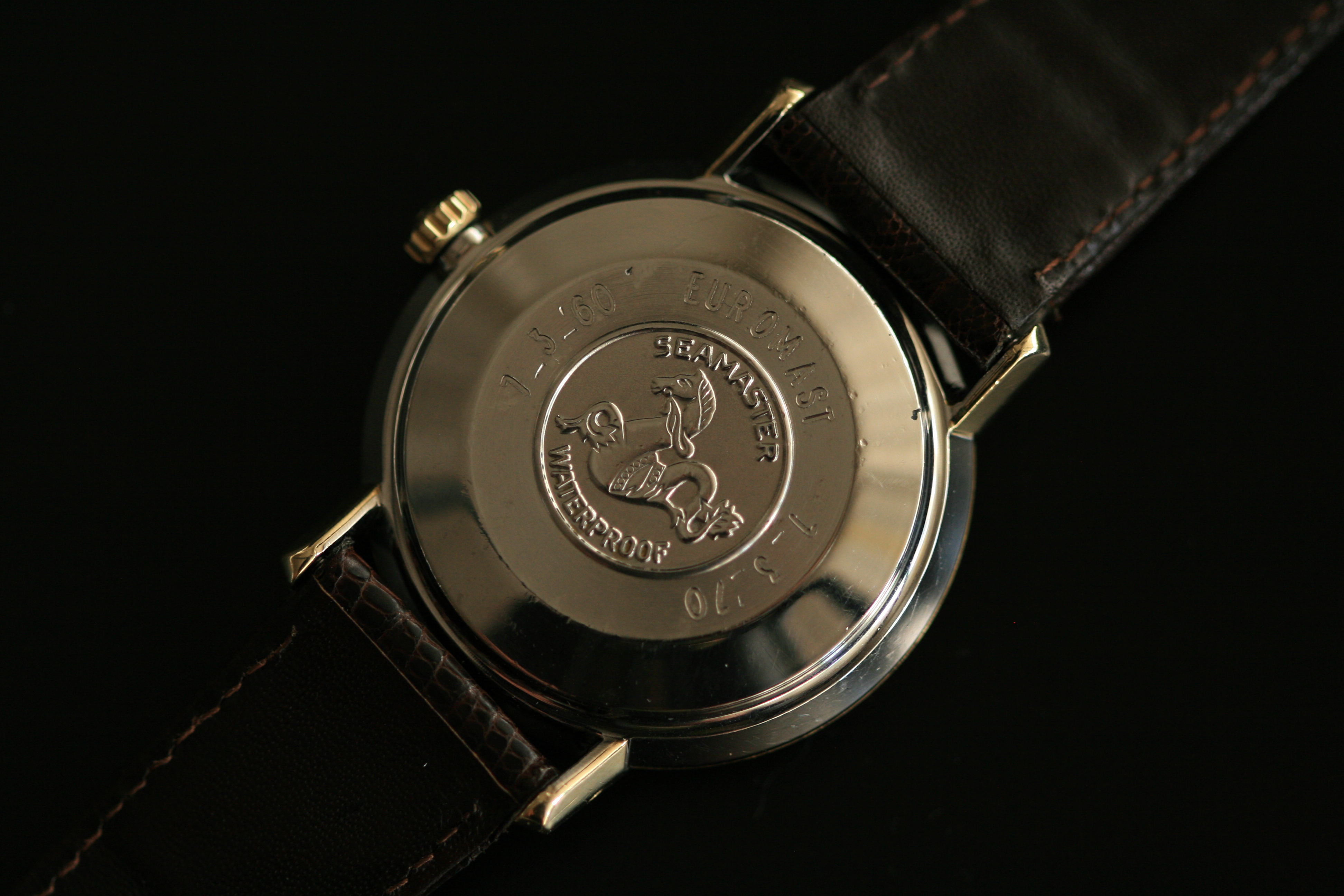 The gold top case is in very good shape with the original scallop crown and a well defined Seamonster on the case back. There is a light engraving which offers some provenance to the watch and it has an Omega signed crystal.