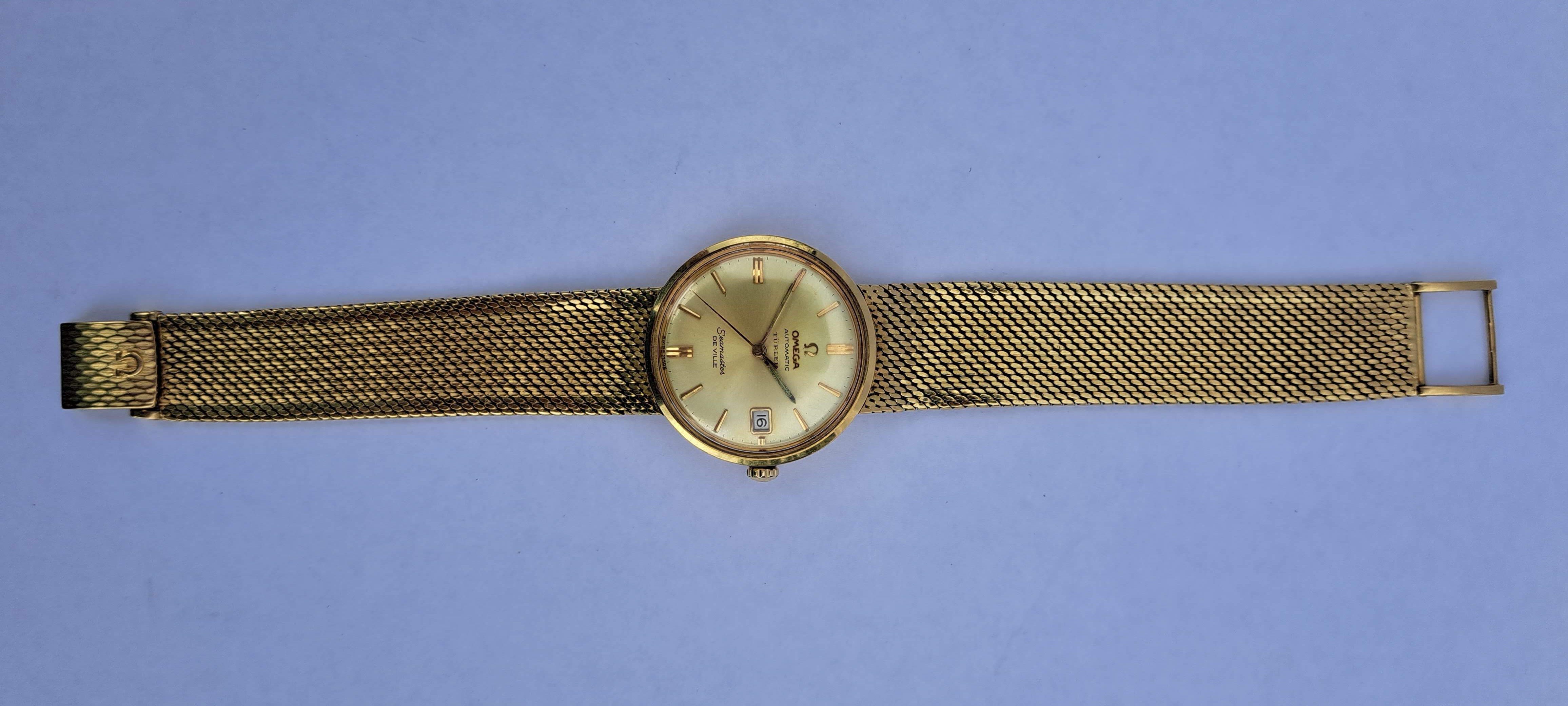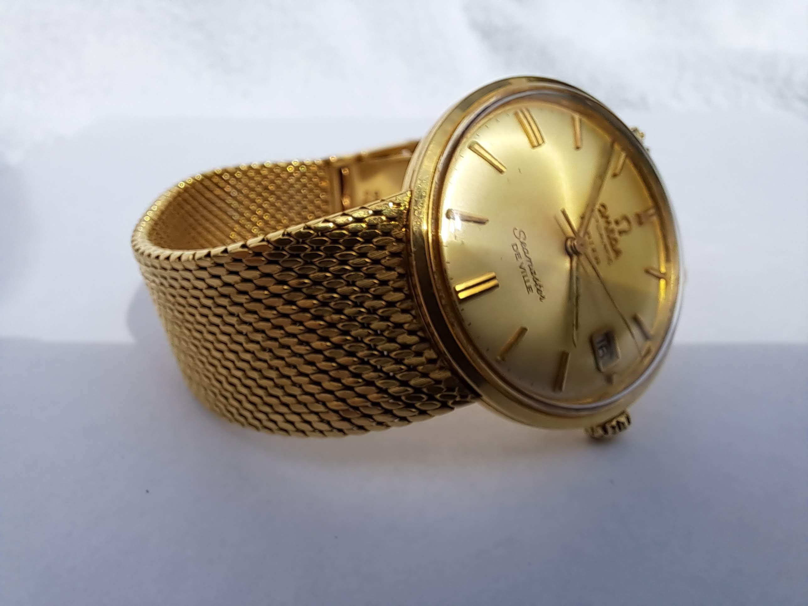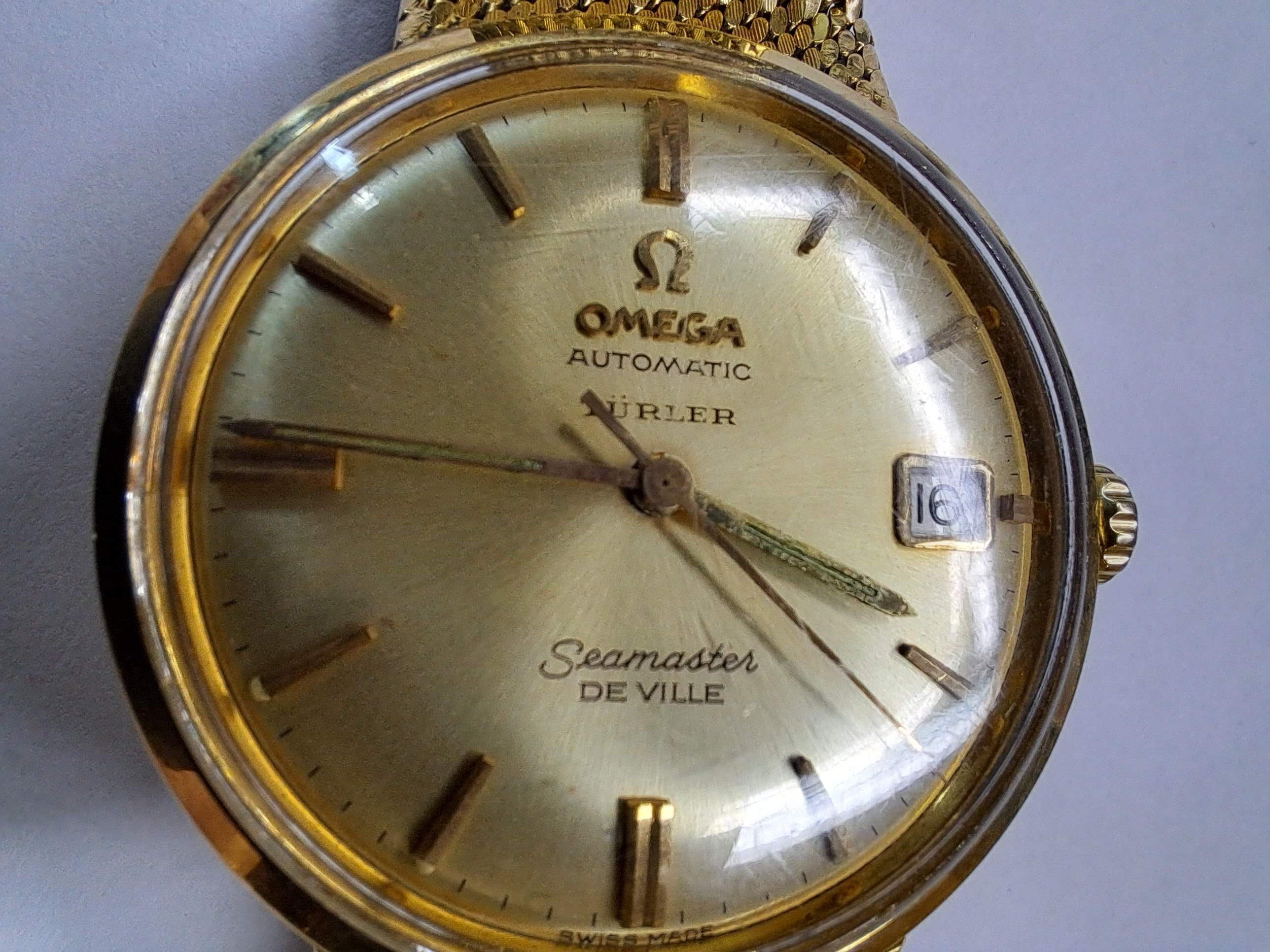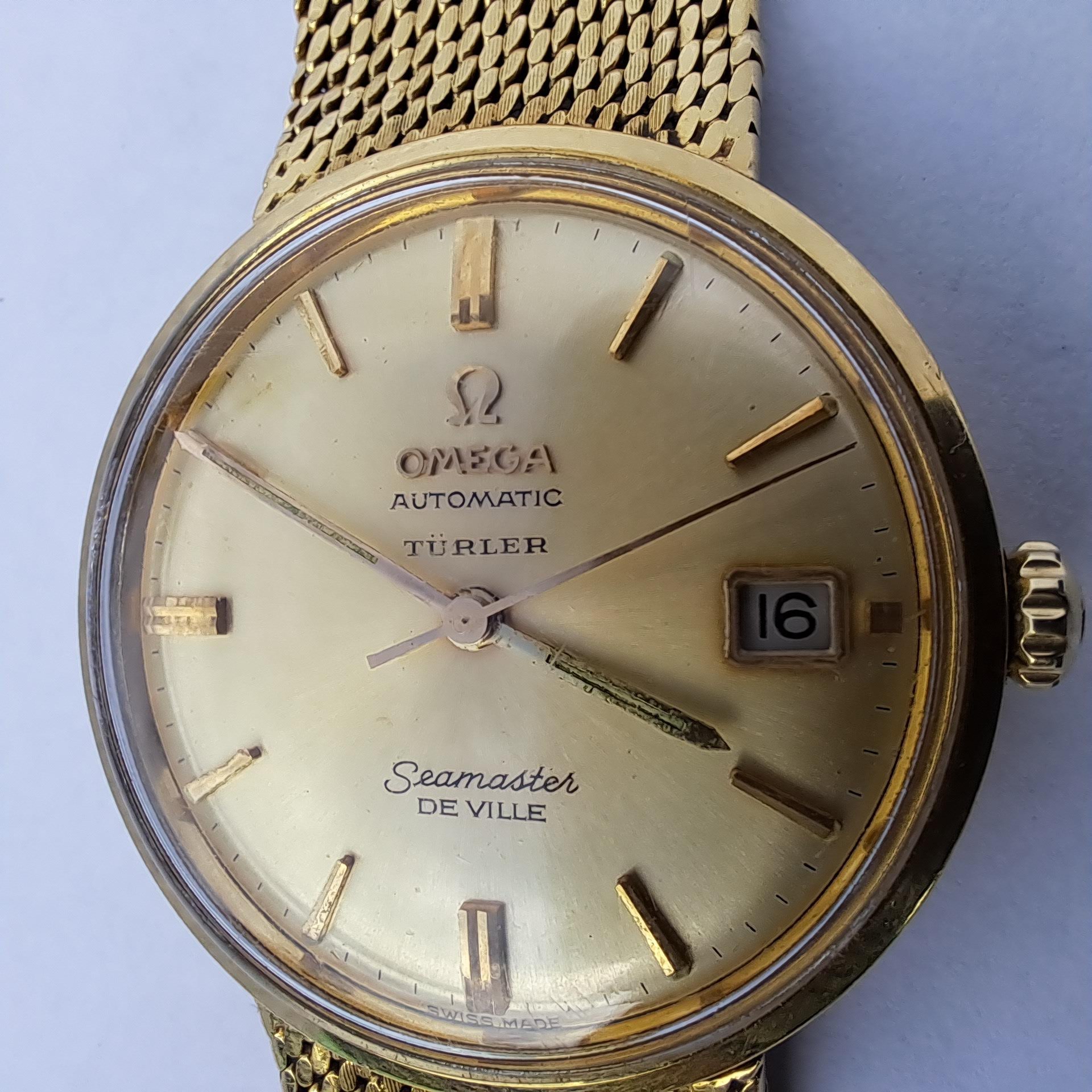 Well, I did buy the watch which is Omega Seamaster De Ville 18k automatic with integrated gold bracelet. I have studied the reference numbers, @PlainVanilla has amazing thread of SMDV's https://omegaforums.net/threads/the-ultimate-seamaster-de-ville-thread.159035, and Swiss 7161 might be the correct reference, but I'll of course have to check it from the inside to be sure. It's from early 60's judging from the "no t's in the dial" but with tritium lume in batons and hands, lume actually works but only for a few seconds. It has the movement with quick set date, should be caliber 562. Double signed "Turler" dial seems original and matches the Turler box that it came in. Crown is original, crystal is not - no omega logo in crystal. Hands are correct although bit suffered. I can't tell if it has been polished, at least not judging from the scratches. Photos of my watch attached. I really tried to get good quality pictures in natural light but I'm clearly not a professional and found it really difficult to prevent reflections and shadows.