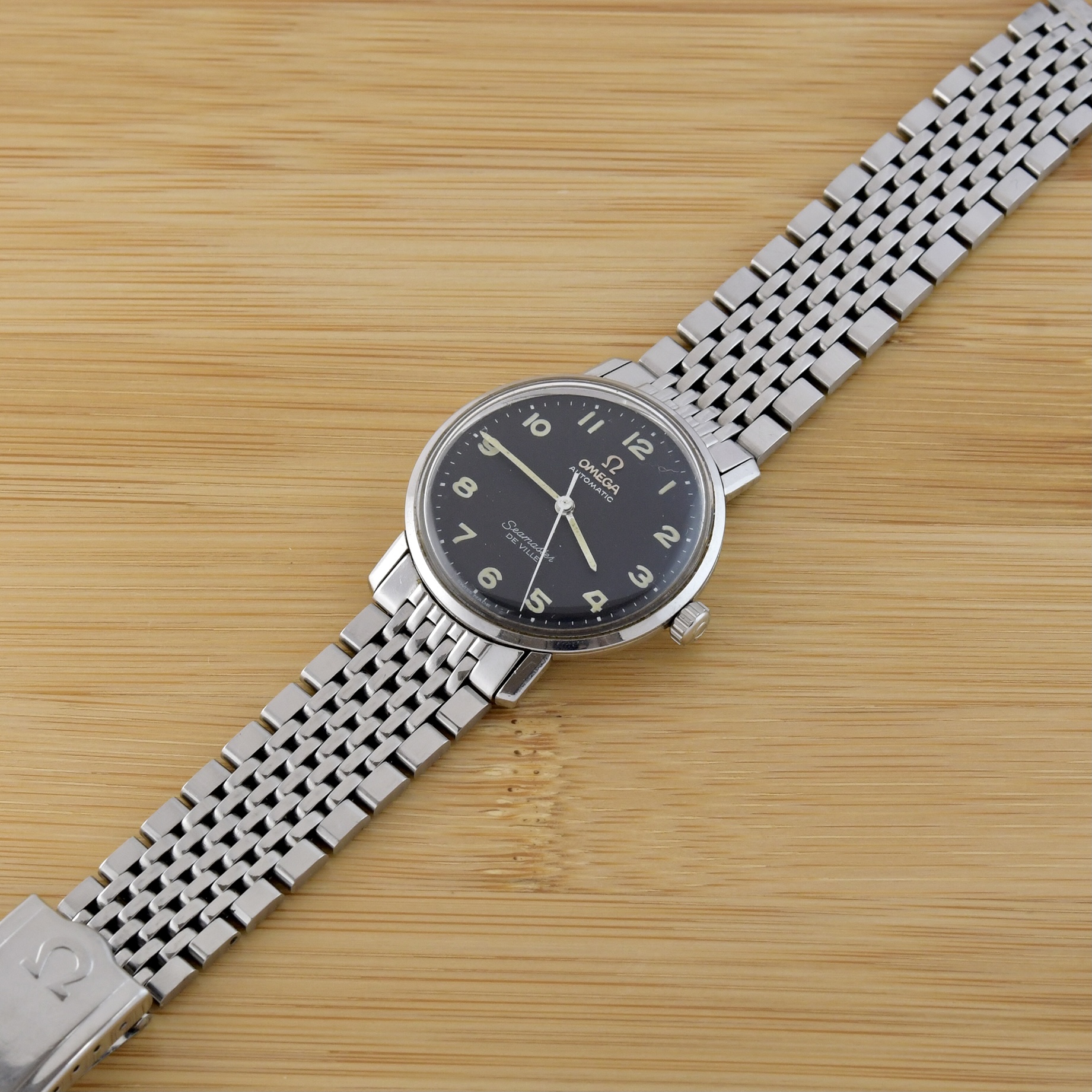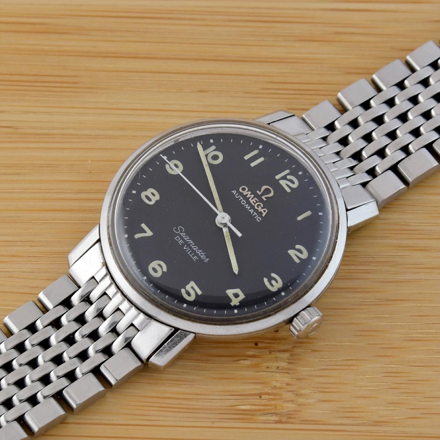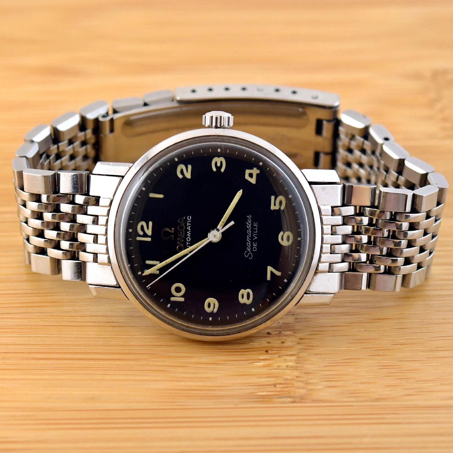 here for sale this very nice Omega Seamaster Deville. This example has a very rare black dial with applied metal logo end arabic numerals.