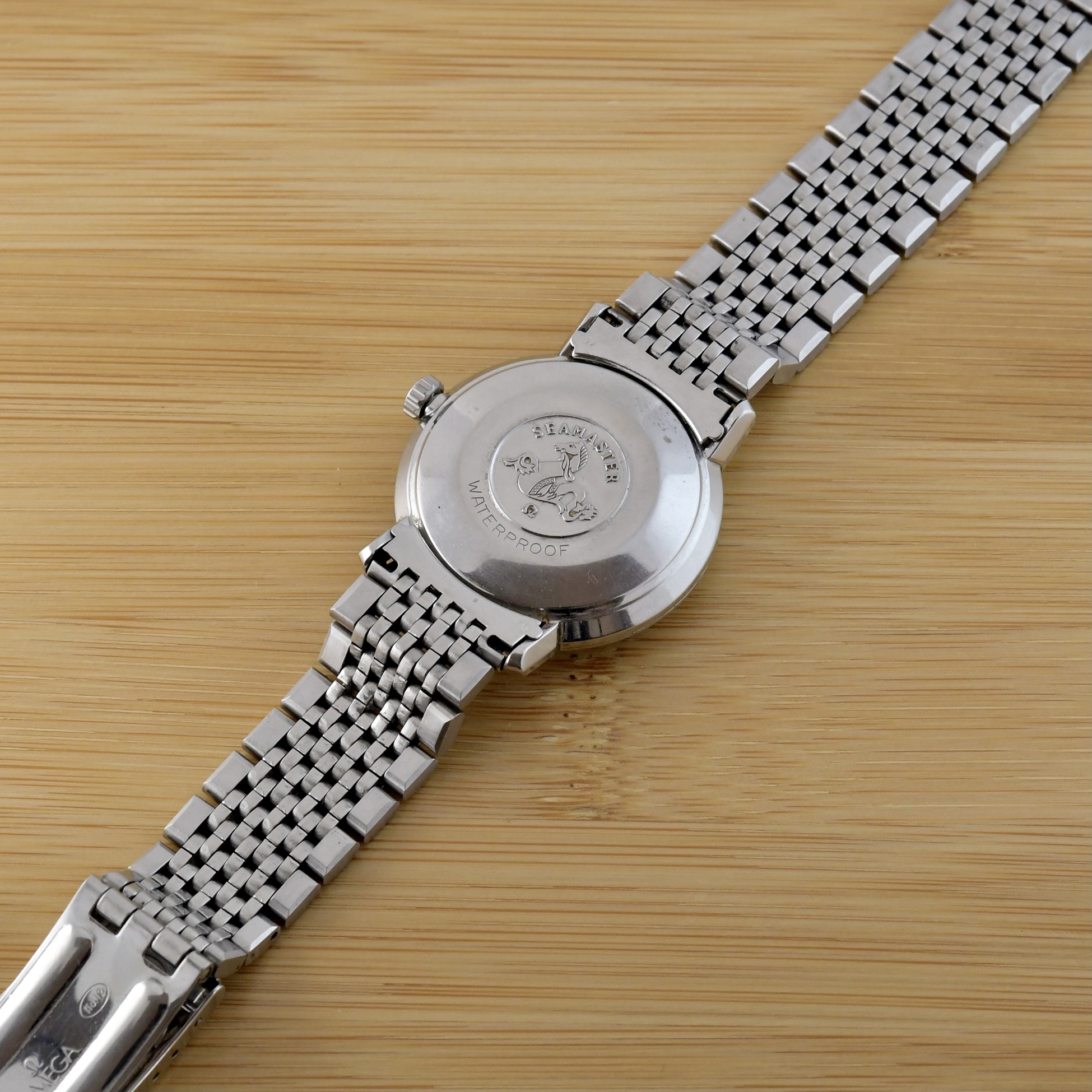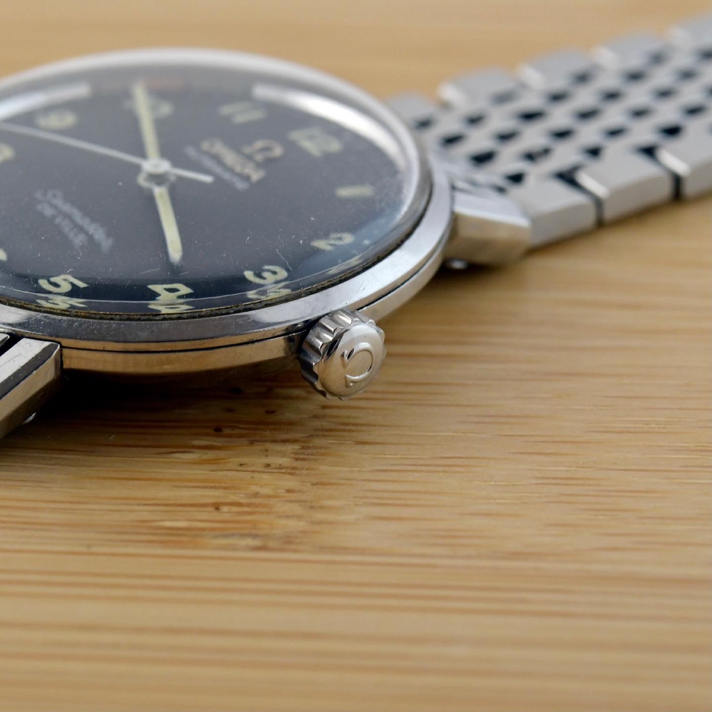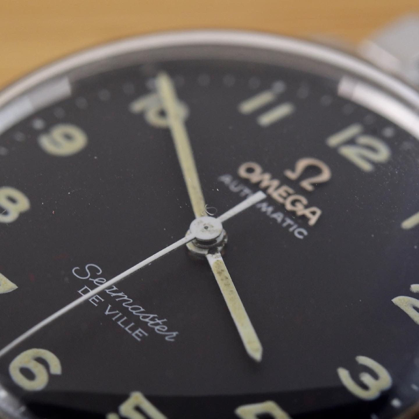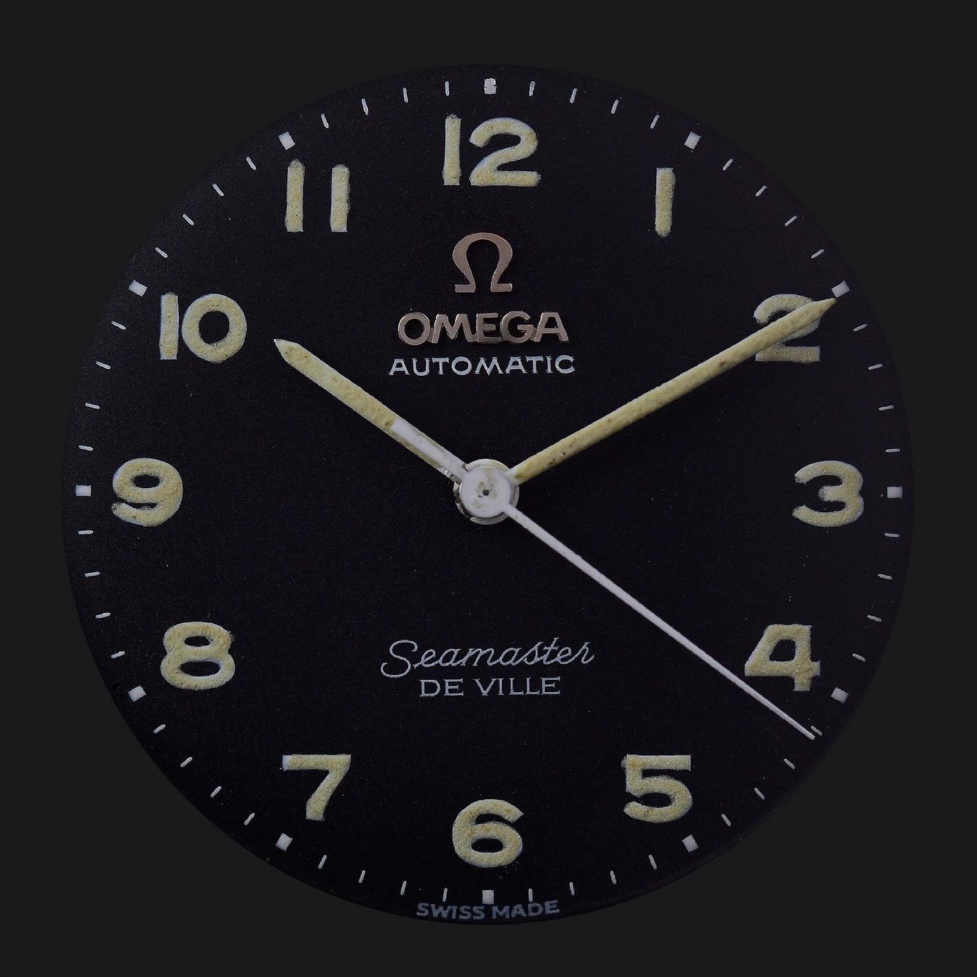 here for sale this very nice Omega Seamaster Deville. This example has a very rare black dial with applied metal logo end arabic numerals.