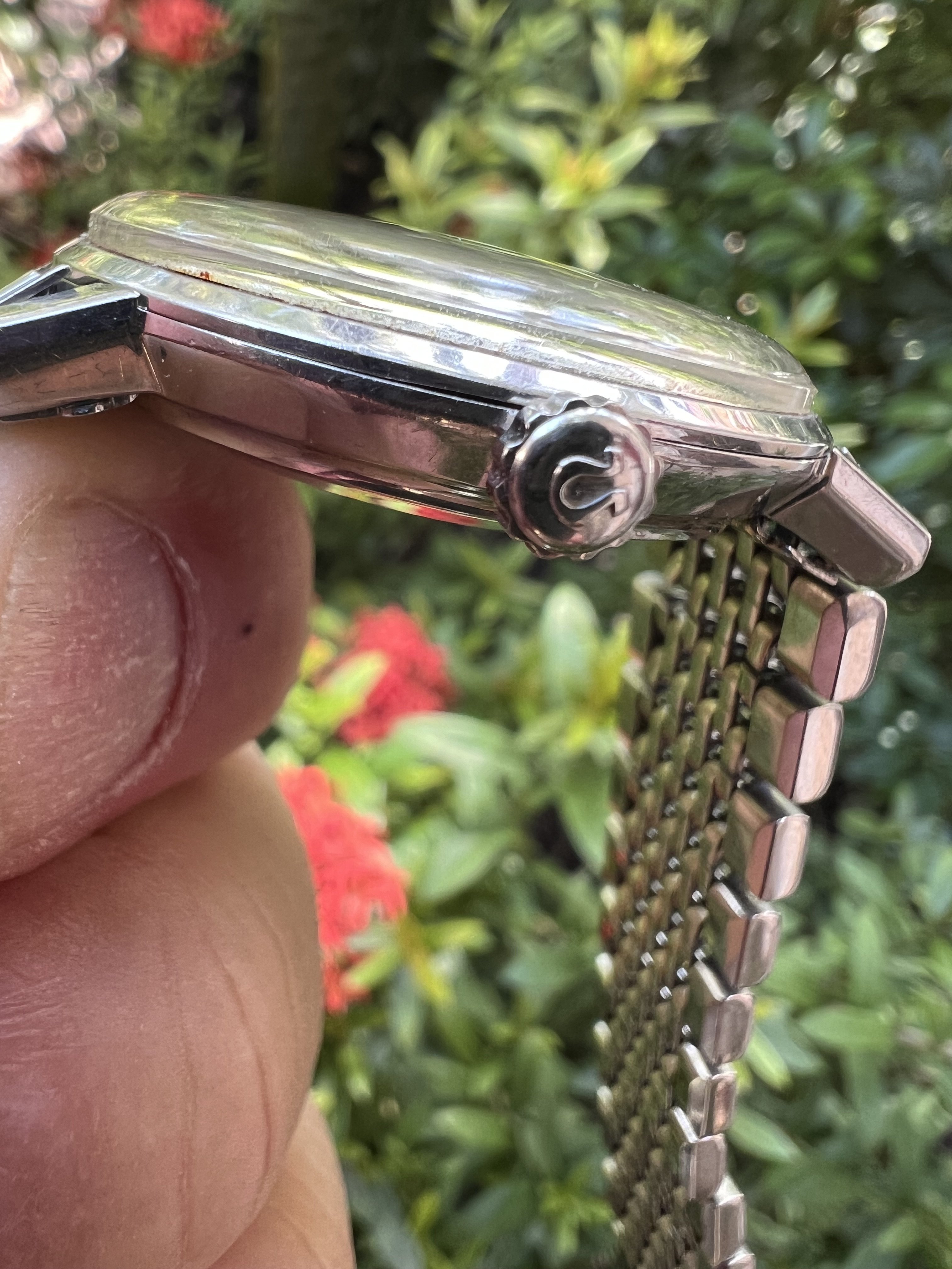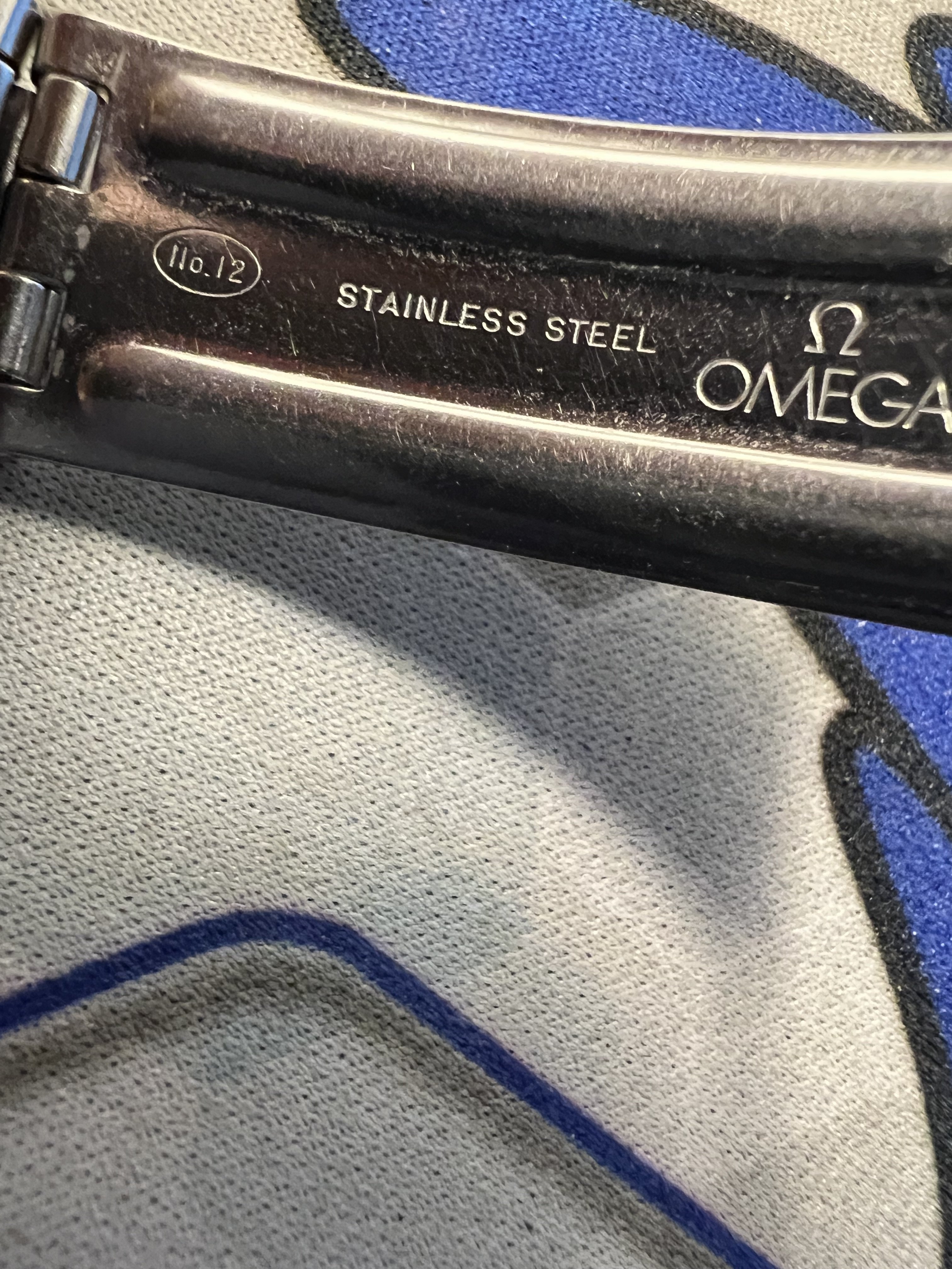 CROWN: Original flat foot Omega signed, functioning well. Pull in and out for quicket date, working.