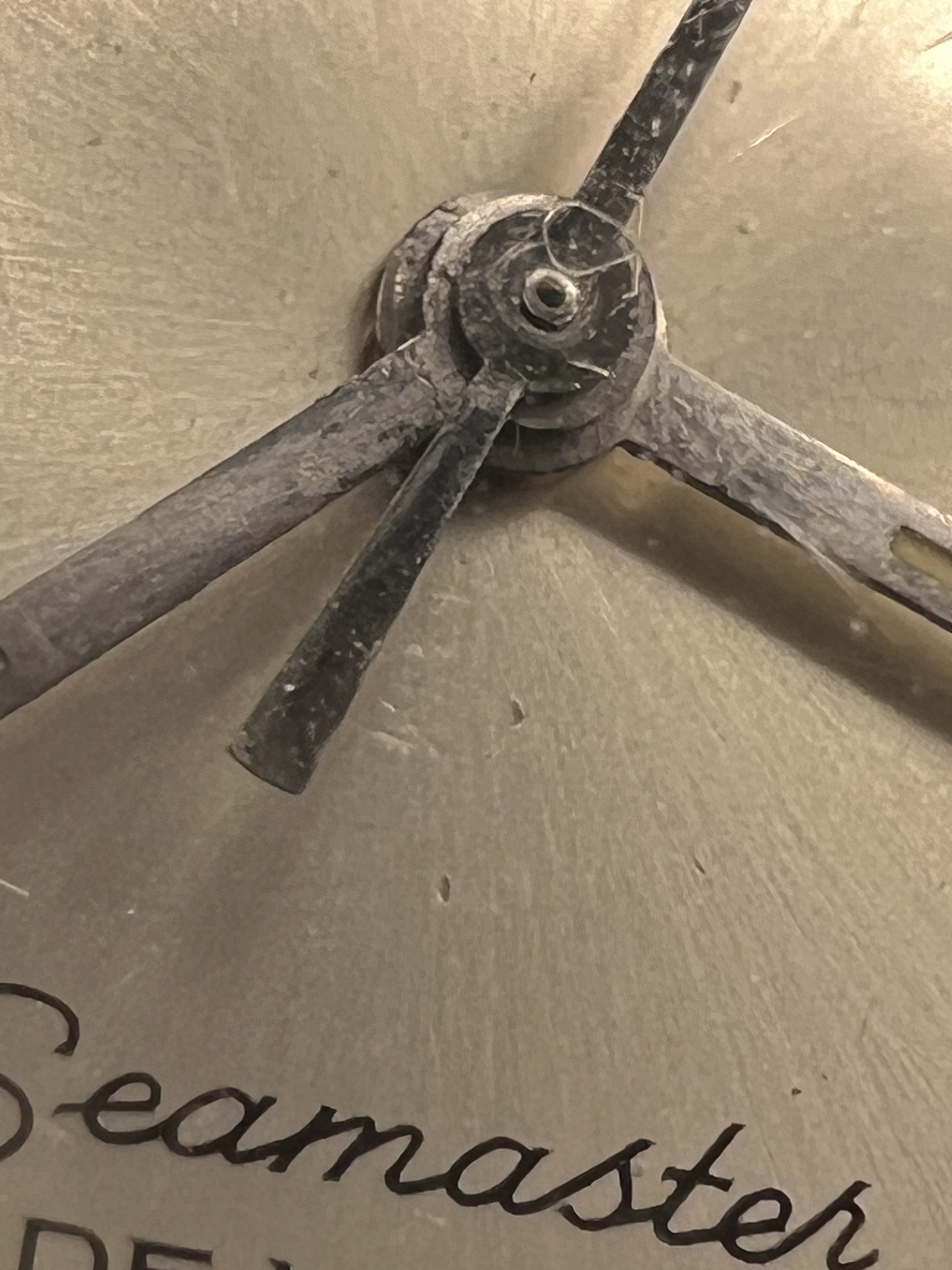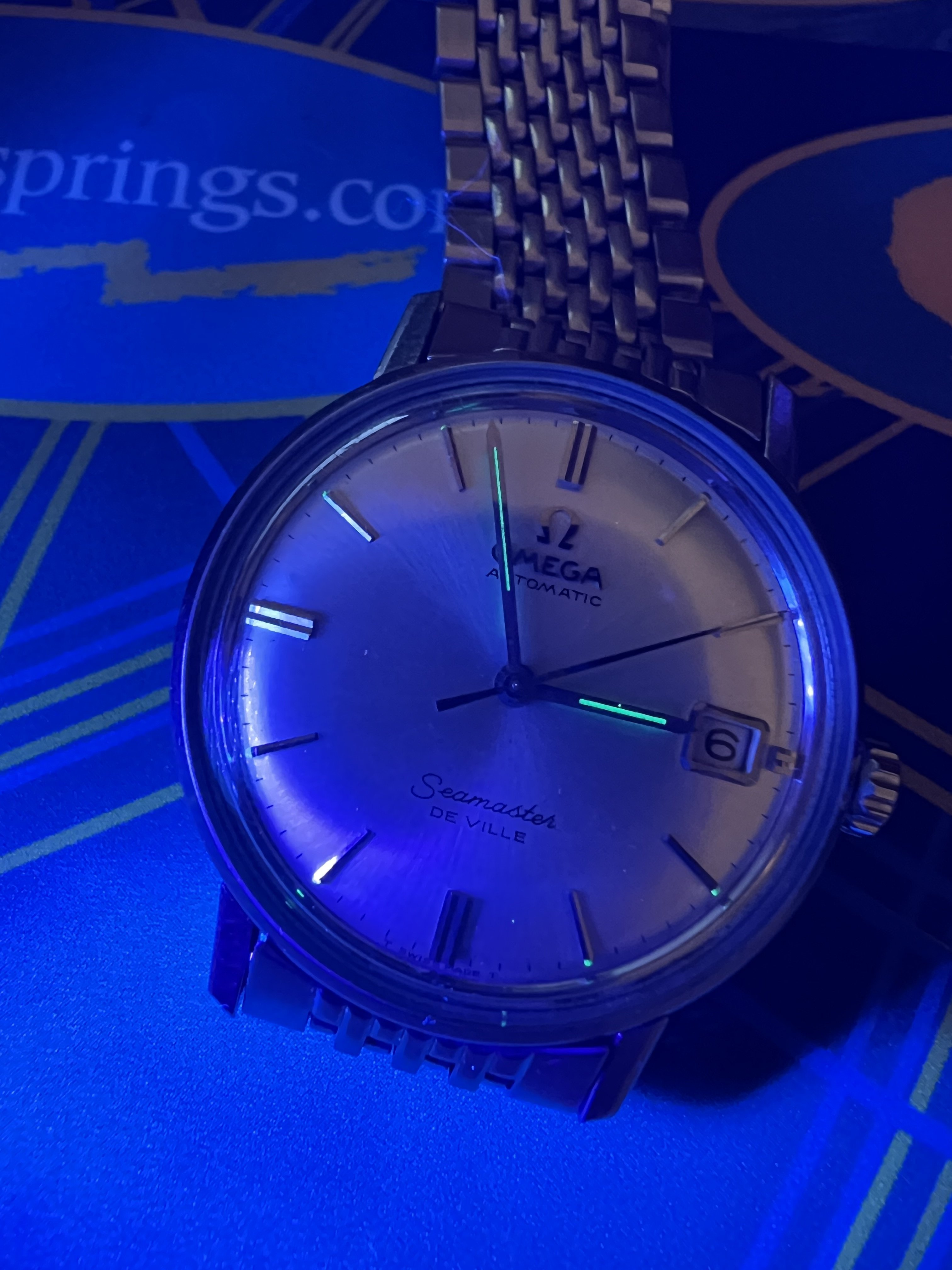 DIAL: Silver starburst dial in excellent vintage condition, almost no age spotting only minor imperfections seen with loupe. All original with applied Omega logo and stick indices. Tritium lume pips at periphery of all indices, seen with UV light on photo. Date window at 3:00. Dial is almost perfect, with a slight dimple noted between 9-10 indices on periphery. Only seen on some angles if I didn’t point it out probably never notice. But I prefer full disclosure.