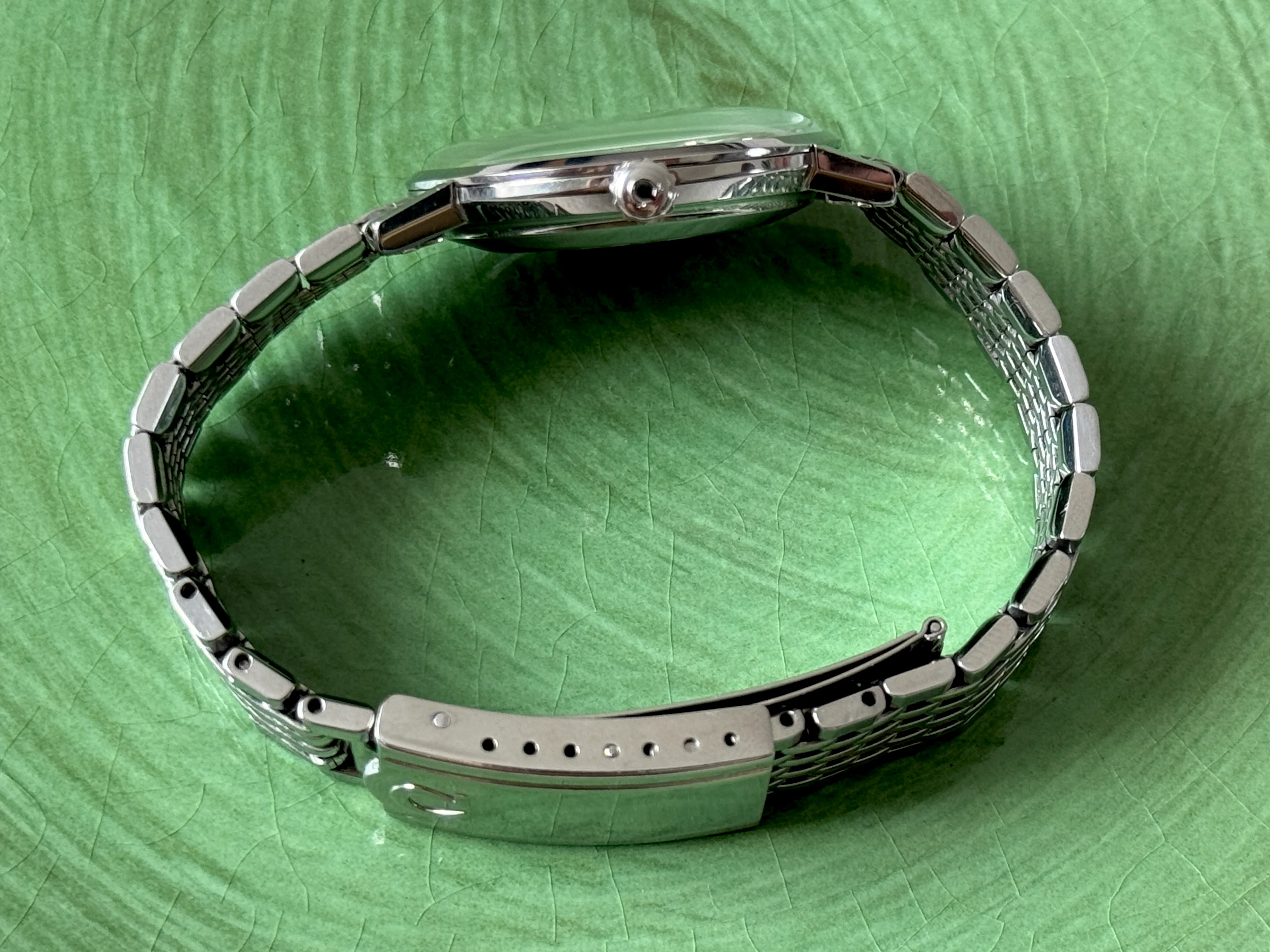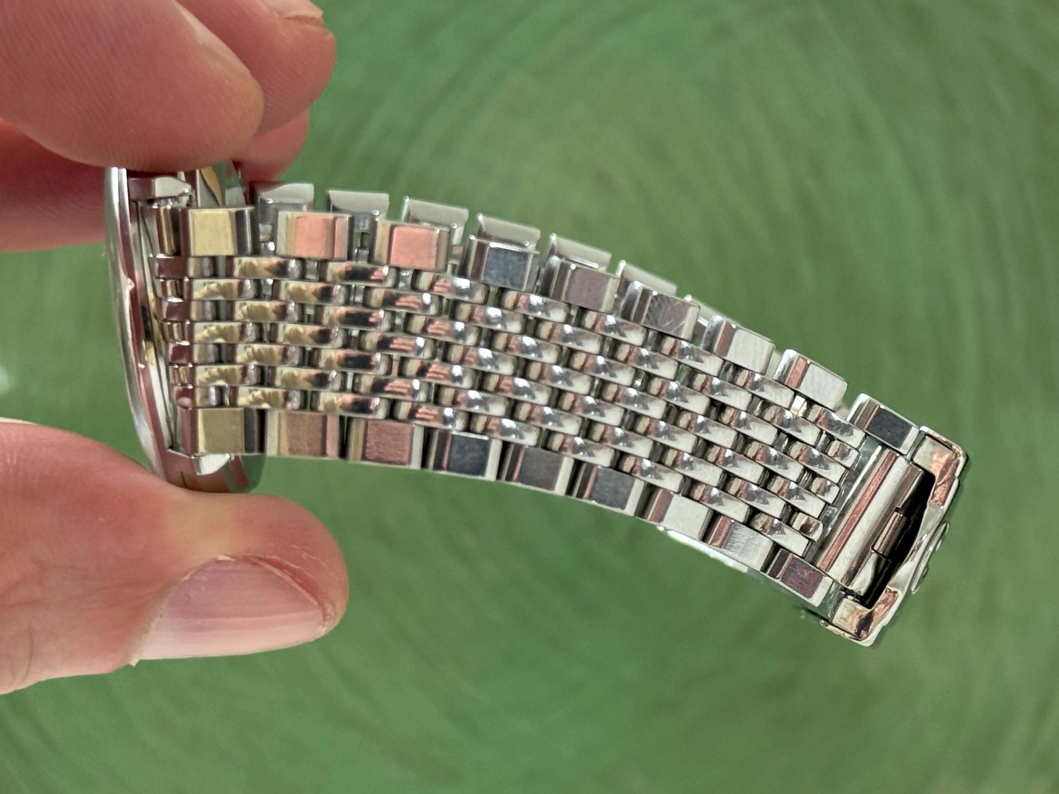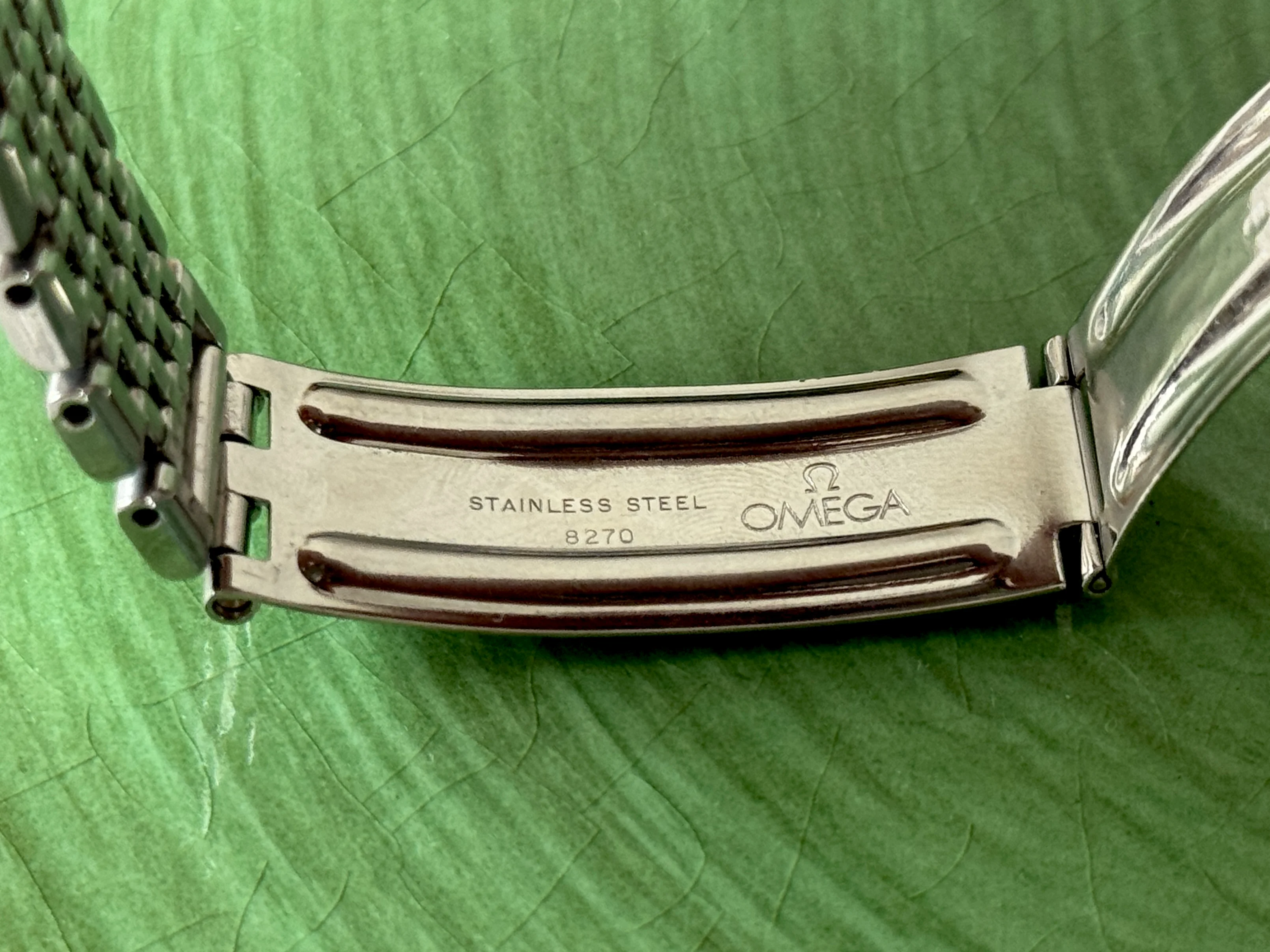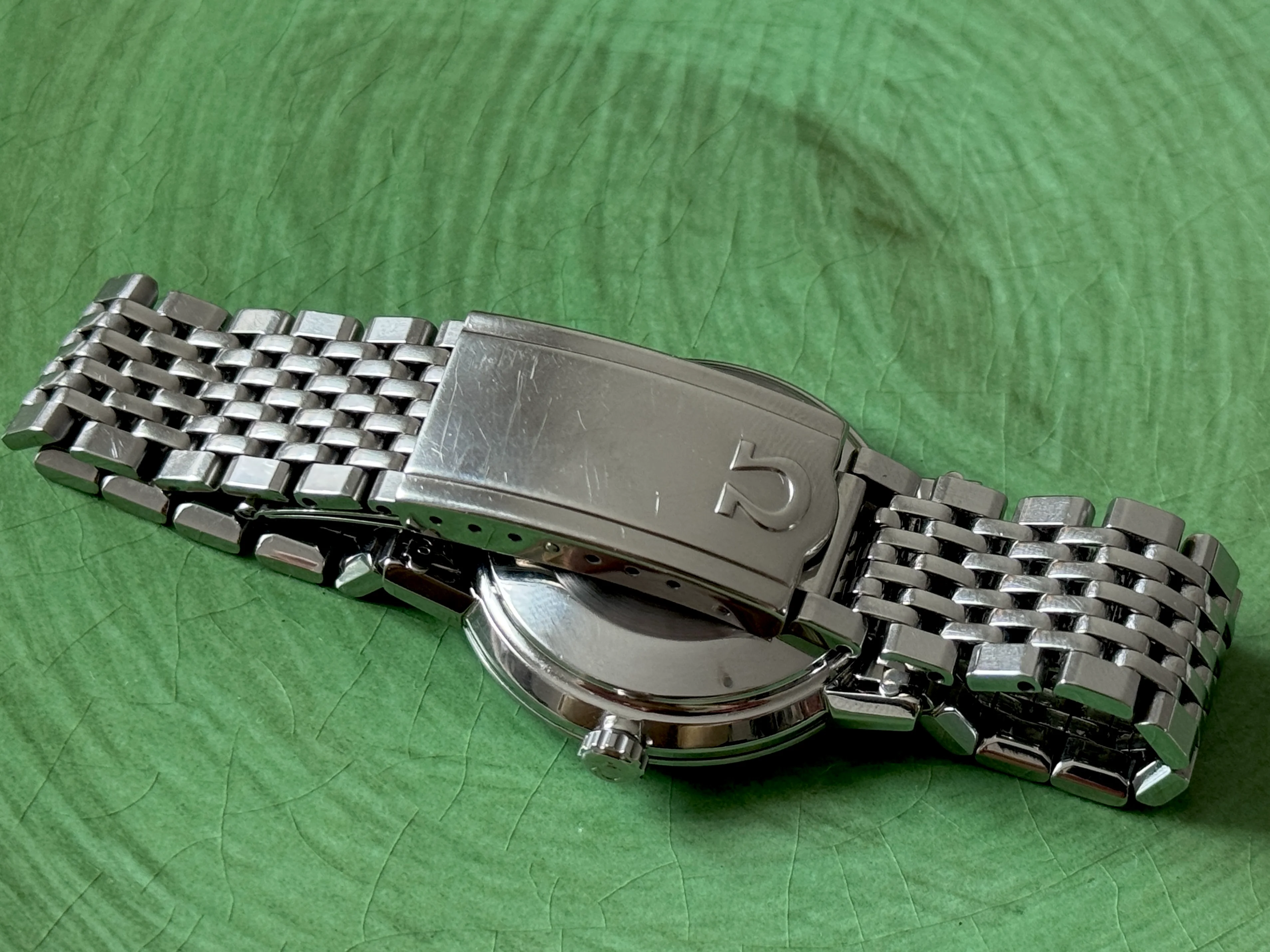 Bracelet: Original Omega Beads of Rice bracelet, ref. 8270 with #70 endlinks. Those 7-row BoRs are the correct style for Seamaster DeVilles and are a great fit. It shows some scratches on the clasp, of course, but is in good shape overall, with a stretch level I would consider very low for BoRs. Length is great, I have a 18.5cm wrist and use the middle oft he 7 holes on the clasp. 20cm wrists will definitely work, if you need me to measure more precisely let me know.