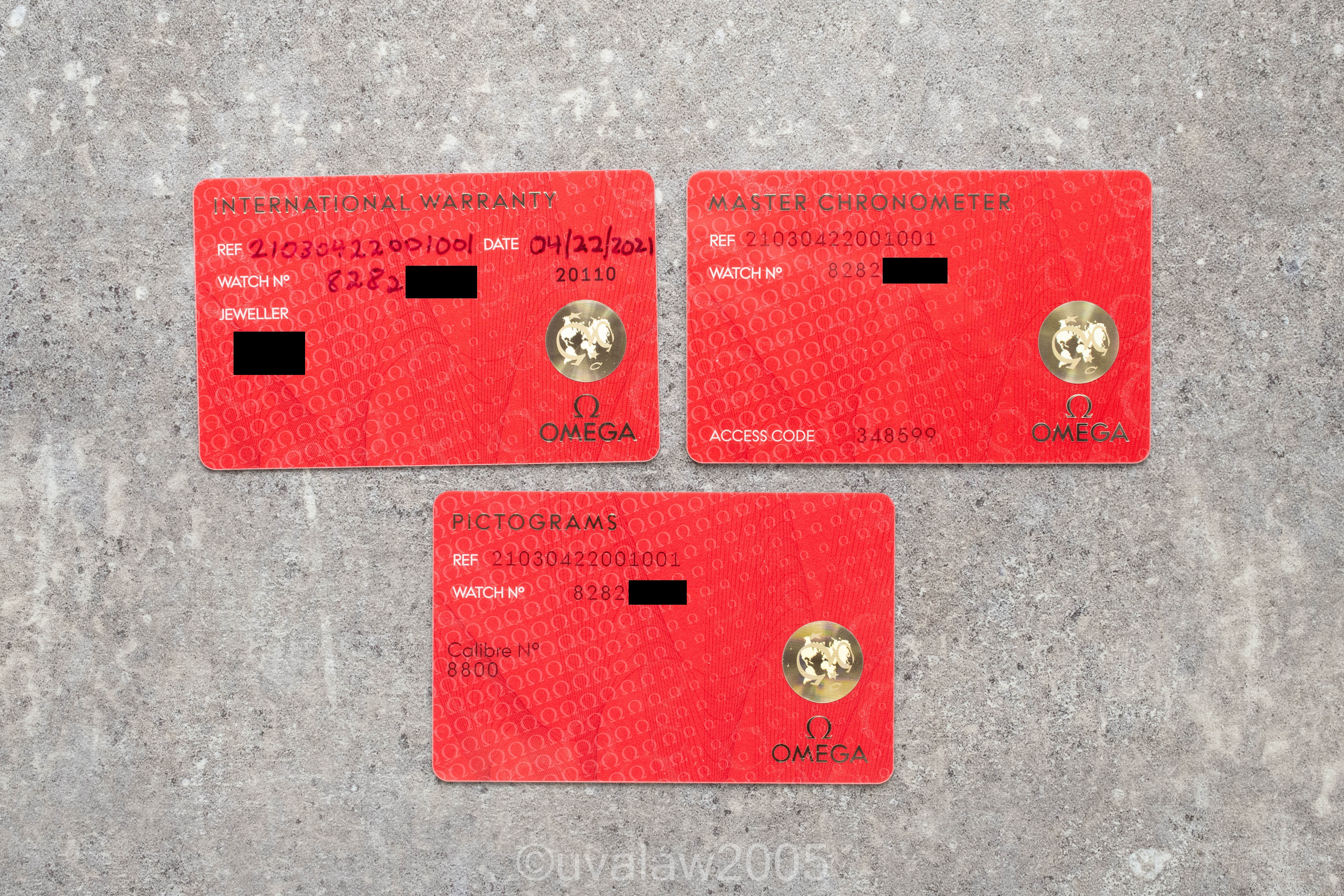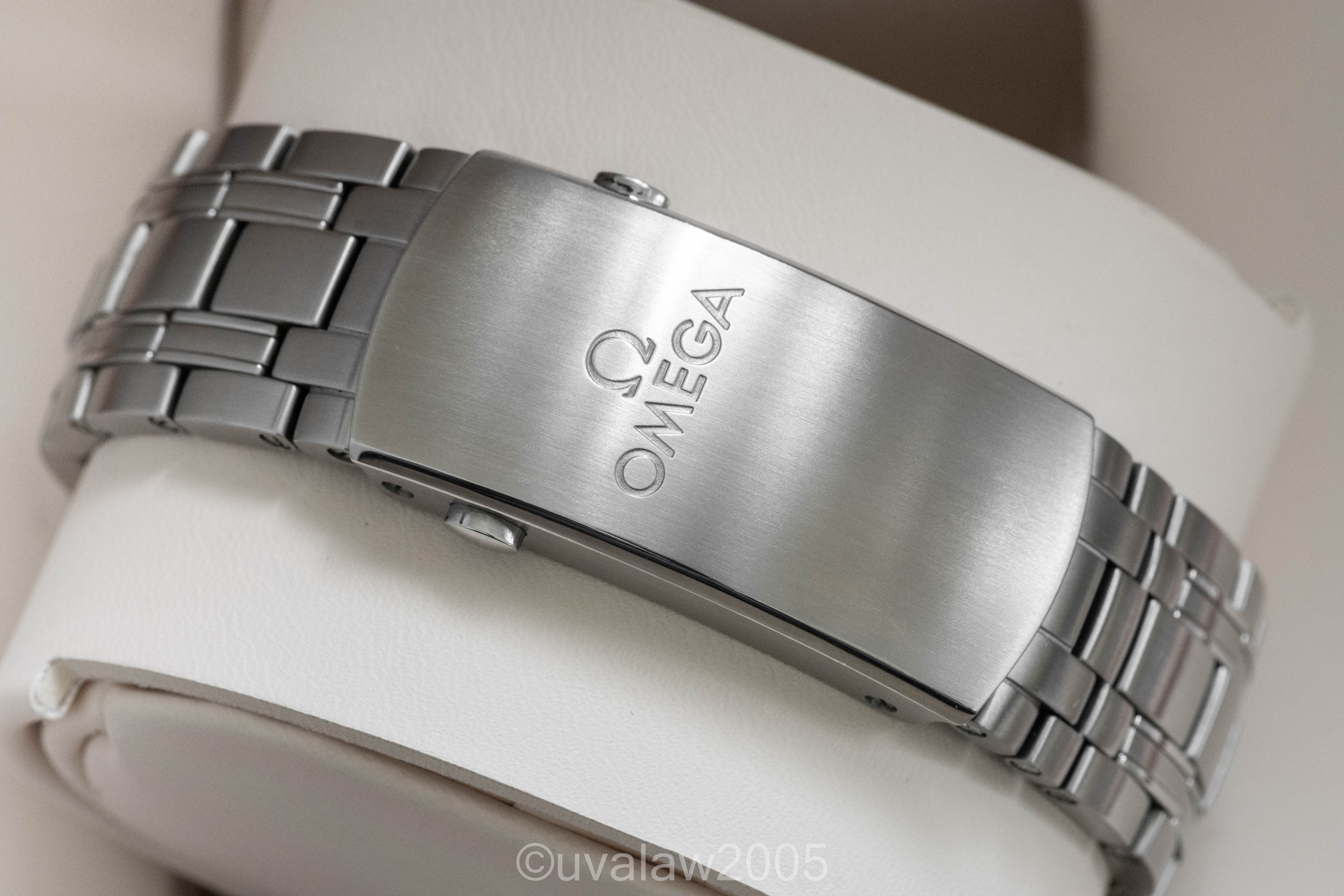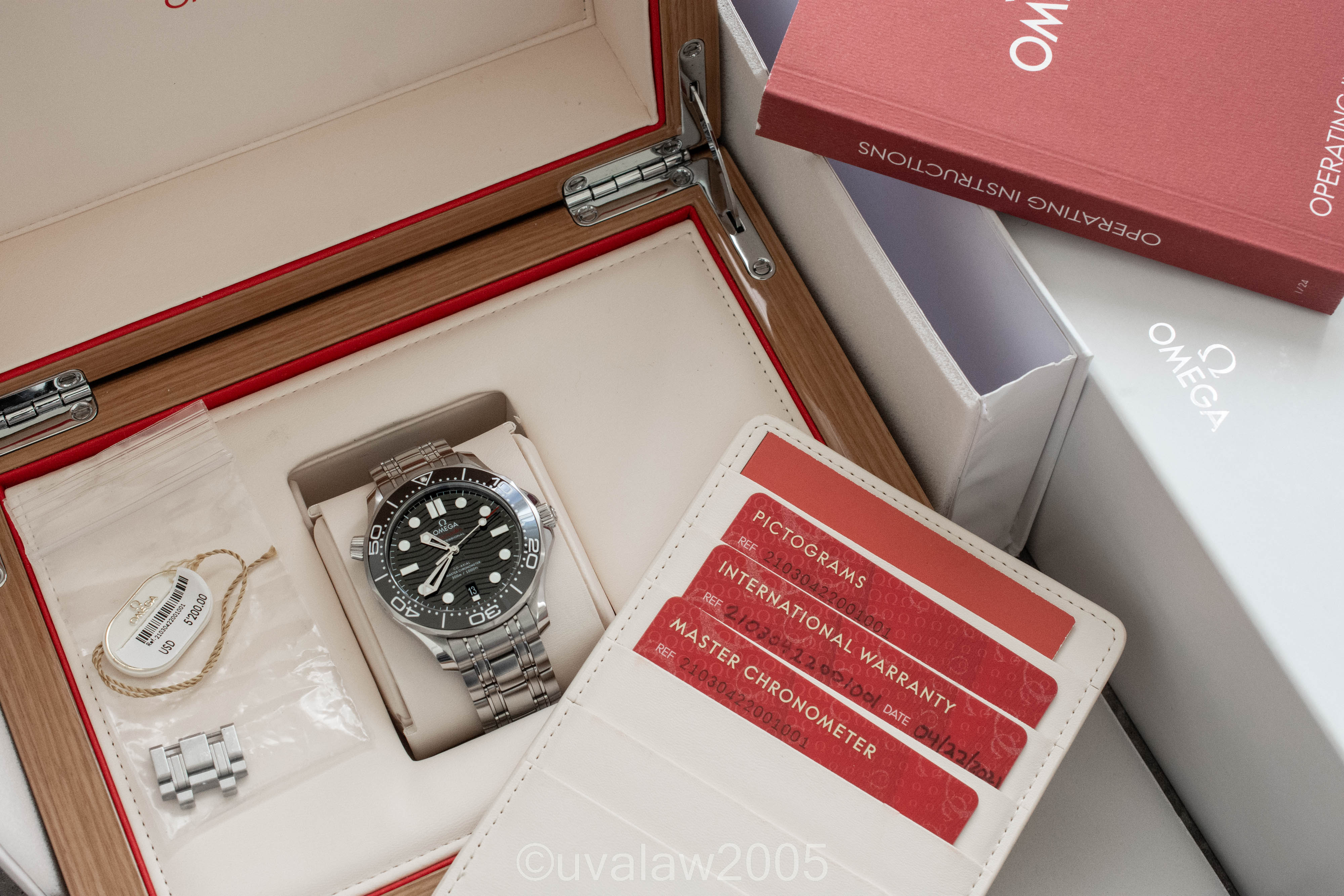 Full kit with all boxes, manual, cards, hangtag and all bracelet links. Tear to outer white box repaired by tape. Omega manufacturer warranty runs through April 2026. Serviced under warranty last month because it was running a bit slow, now back within METAS specs. Service card/receipt included.