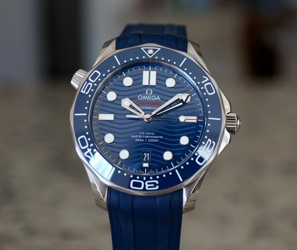 ·Omega Seamaster Diver 300M Co-Axial Master Chronometer 210.32.42.20.03.001, 21032422003001, 210 32 42 20 03 001, stainless steel case on a rubber strap with a stainless steel tang buckle, automatic Omega Co-Axial Master Chronometer caliber 8800 movement, 55-hour power reserve, blue wave dial, date at 6 o'clock, luminous hands and hour markers, blue ceramic rotating bezel, sapphire crystal, water resistant to 300M. Diameter: 42mm, Thickness: 14mm. Excellent condition with box and papers