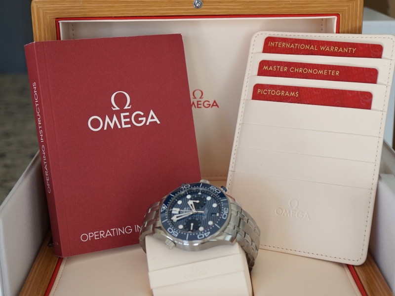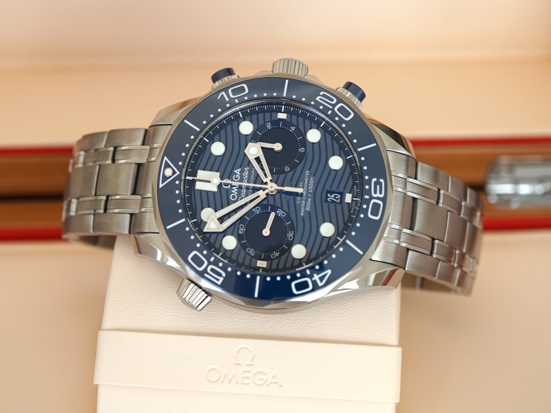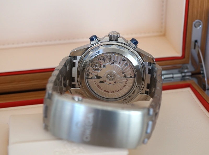 Ref: 210.30.44.51.03.001, 44 MM Stainless Steel on Stainless Steel bracelet, Blue Wave Dial, Chronograph function, blue ceramic bezel, Omega 9900 caliber, Domed scratch-resistant sapphire crystal with antireflective treatment on both sides, Helium escape valve, 30 bar (300 metres / 1000 feet) water resistance, Unworn with box and papers (Sep 2021)