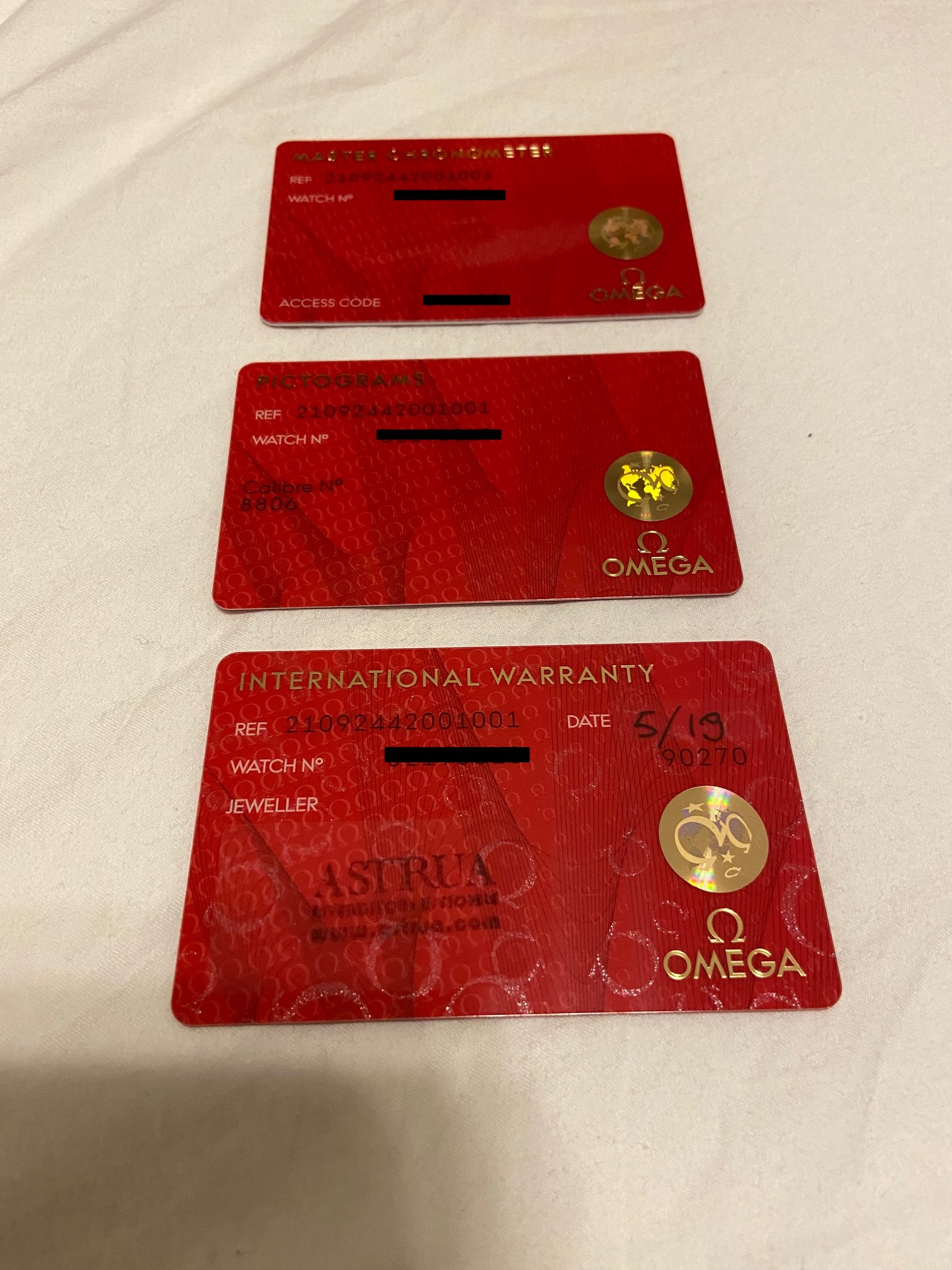 The watch comes with the full package: Omega wooden box, Omega white carton box, all papers