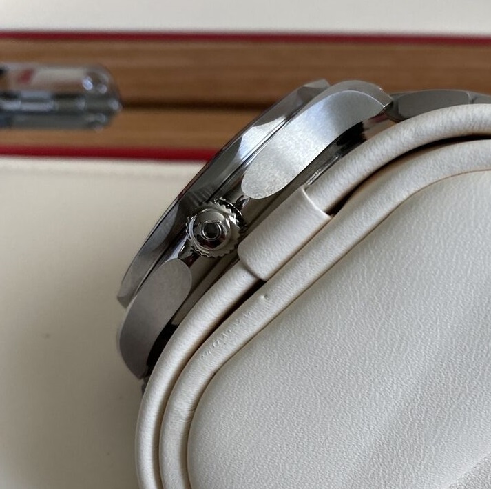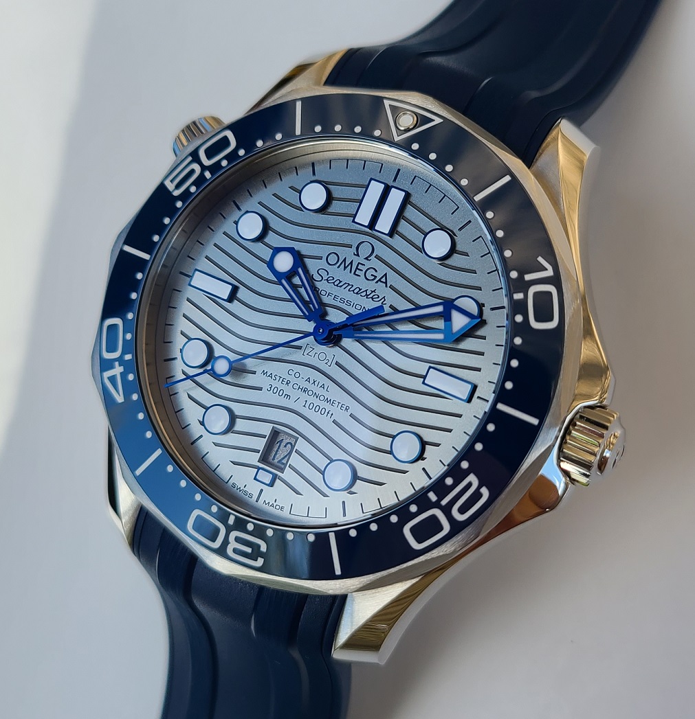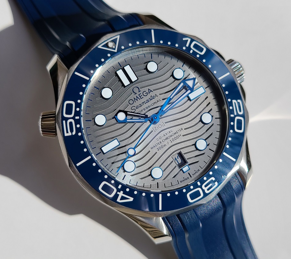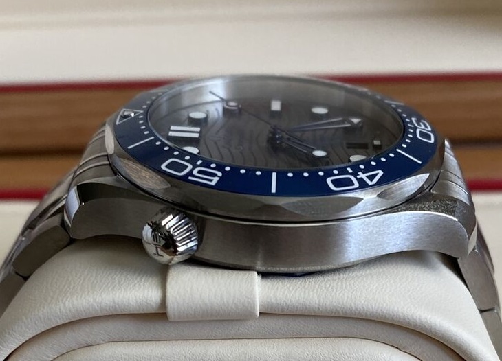 Like new in box condition. Worn sparingly in rotation with many others. Simply selling it to raise some cash. Really cool dial as it changes character depending on which way the light hits it and when you switch from the bracelet to the strap. On the bracelet, the dial looks more grey/silver and it is very dressy. When you switch to the rubber strap, it becomes more causal and looks a lot more blue. The blue strap really brings out the blue colored bezel. I will include the metal bracelet that came with the watch + the blue rubber strap and pin buckle that I purchased at an Omega Boutique.