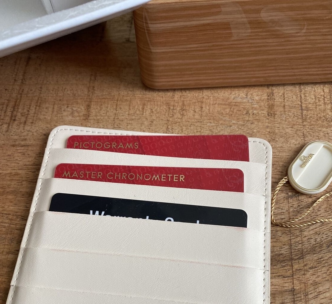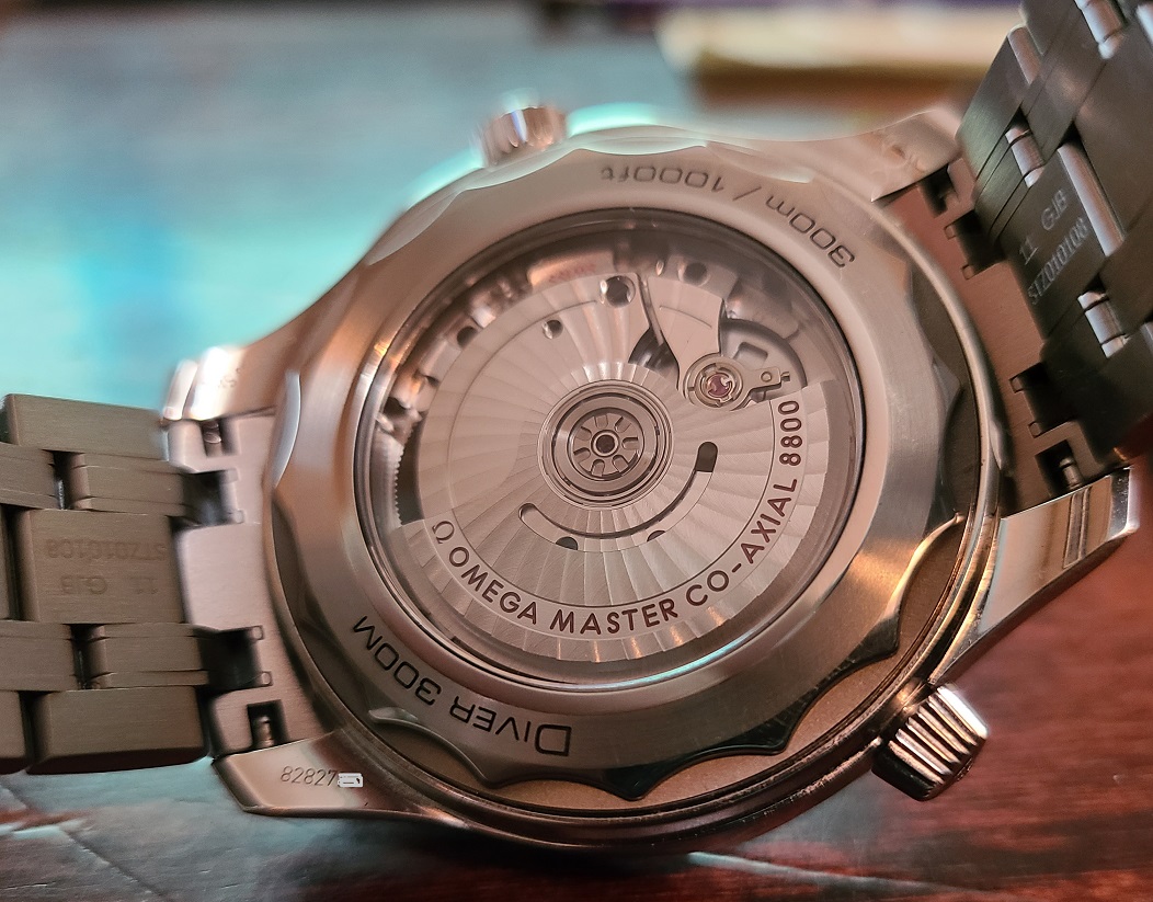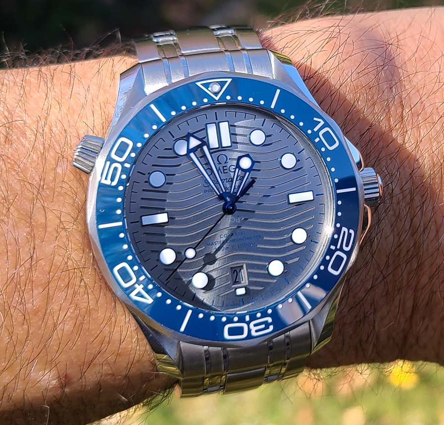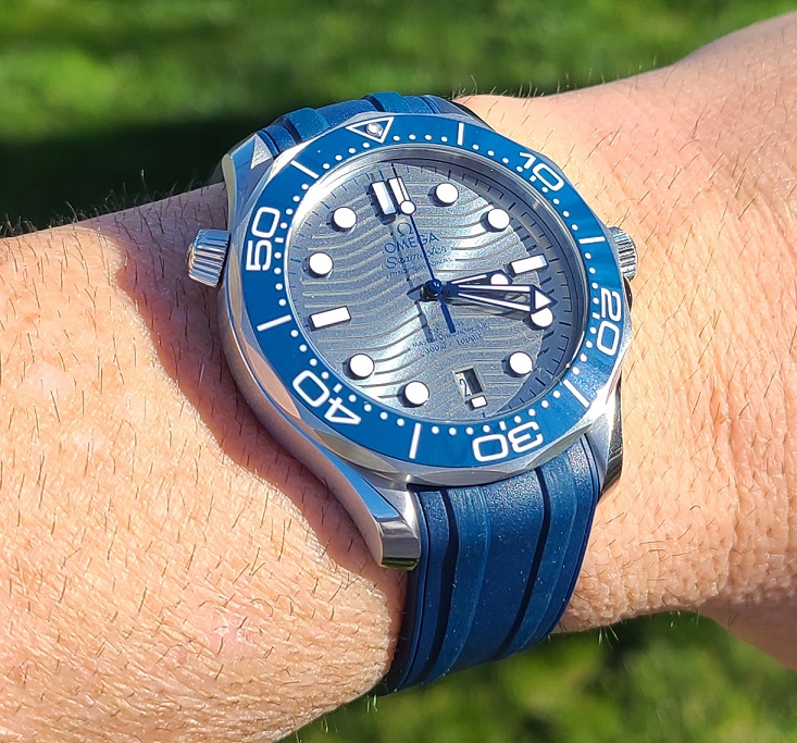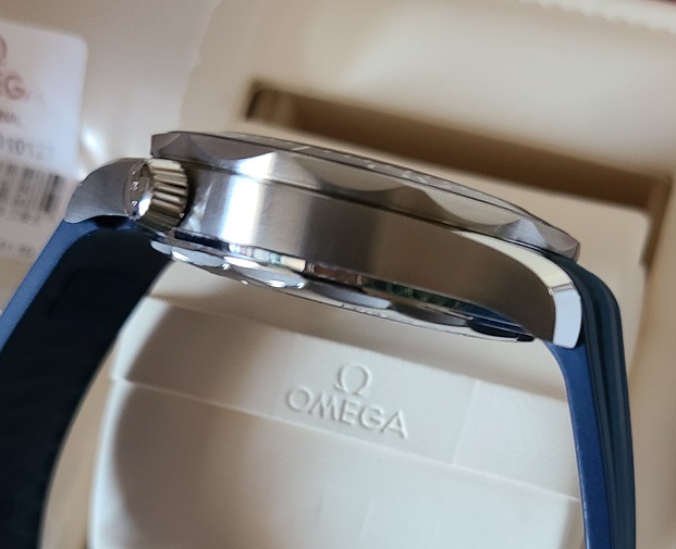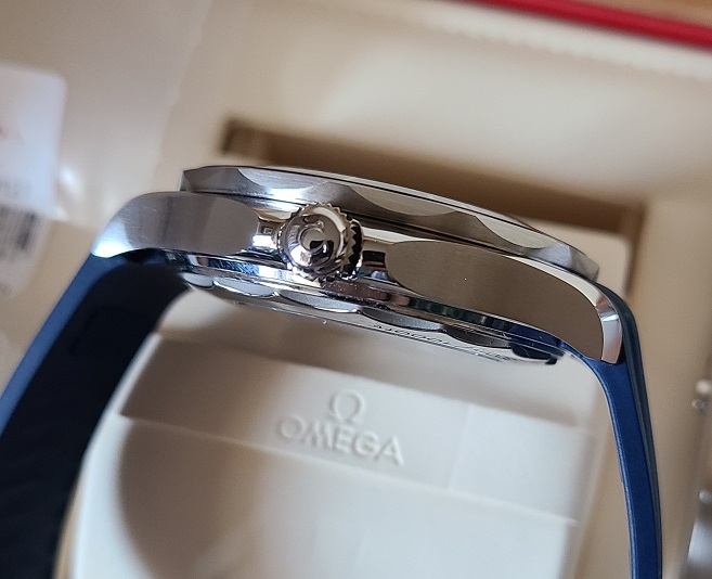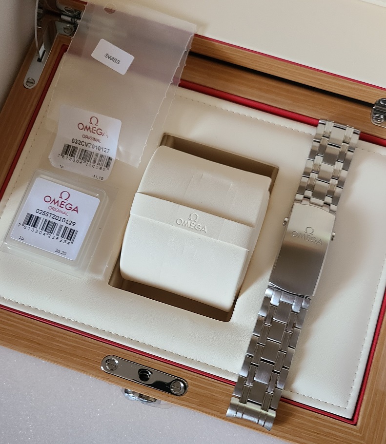 ACCESSORIES: White Omega exterior box, Omega wooden watch box, Watch, Omega OEM bracelet, Omega OEM blue rubber strap and pin buckle (I purchased the rubber strap from the Omega Boutique in Roseville, CA for $300.00), pictogram card, chronometer certificate, Jomashop warranty card.