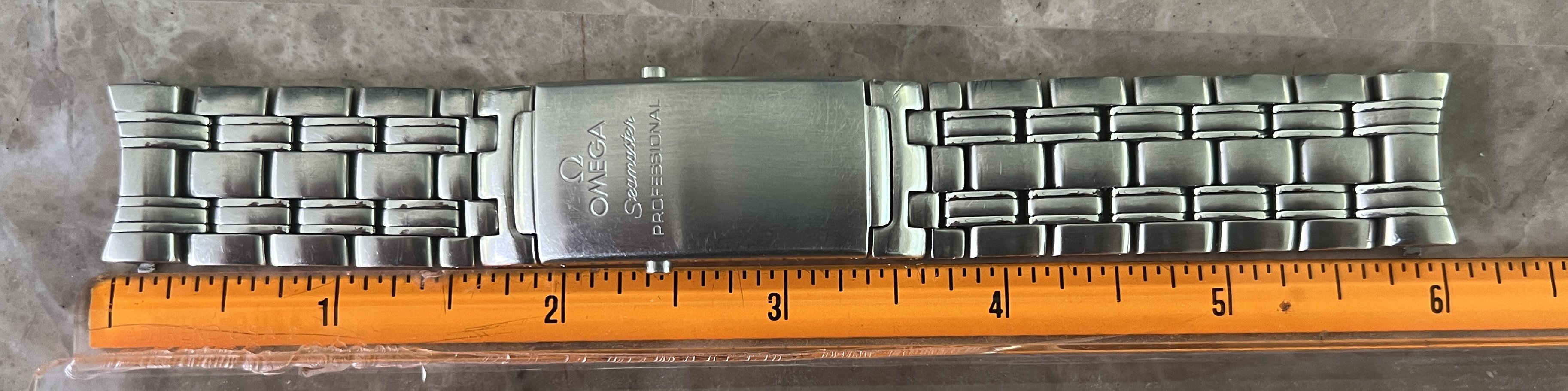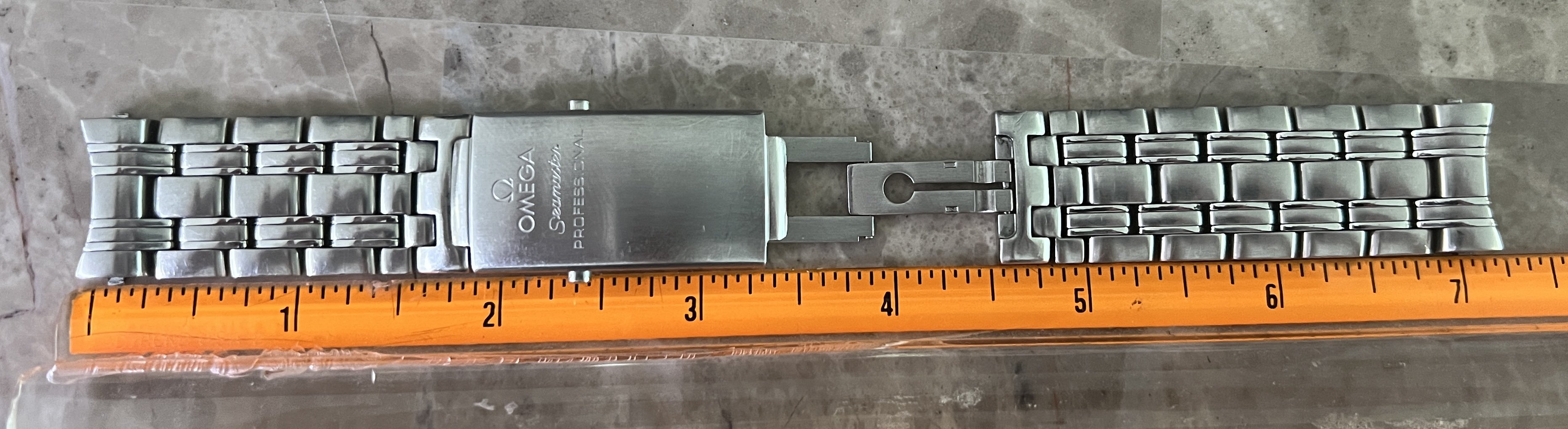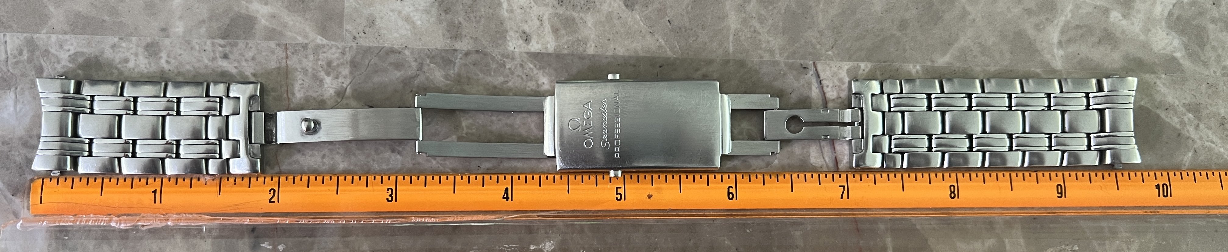 ·SOLD ($395 OBRO) have a genuine Omega Seamaster 20 MM stainless steel bracelet, reference 1503/825. The bracelet came off a 2535.80.00 but is compatible with various Seamaster / Seamaster ceramic models which share the same 20 MM lug end and case fitting (information widely available on Internet). The bracelet has a total of 10 links, out of which four (2 full size and 2 half size) links can be removed to adjust its overall length. The overall length of the bracelet with all the links installed (as pictured below) is approximately 6 - 1/16 inches long with the divers extension closed and 7 3/16 inches with the divers extension open as shown on pictures. The bracelet has moderate stretch as shown.