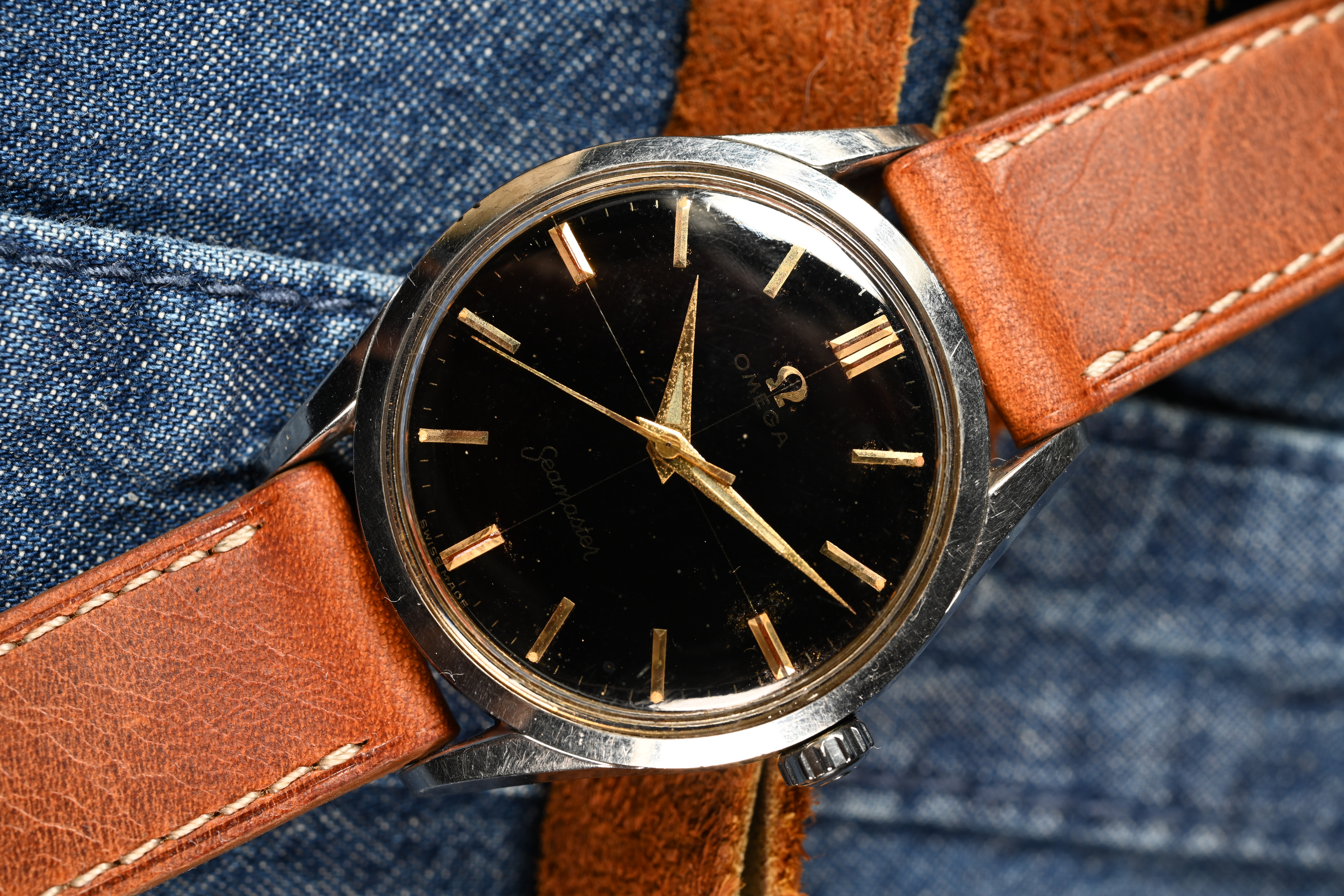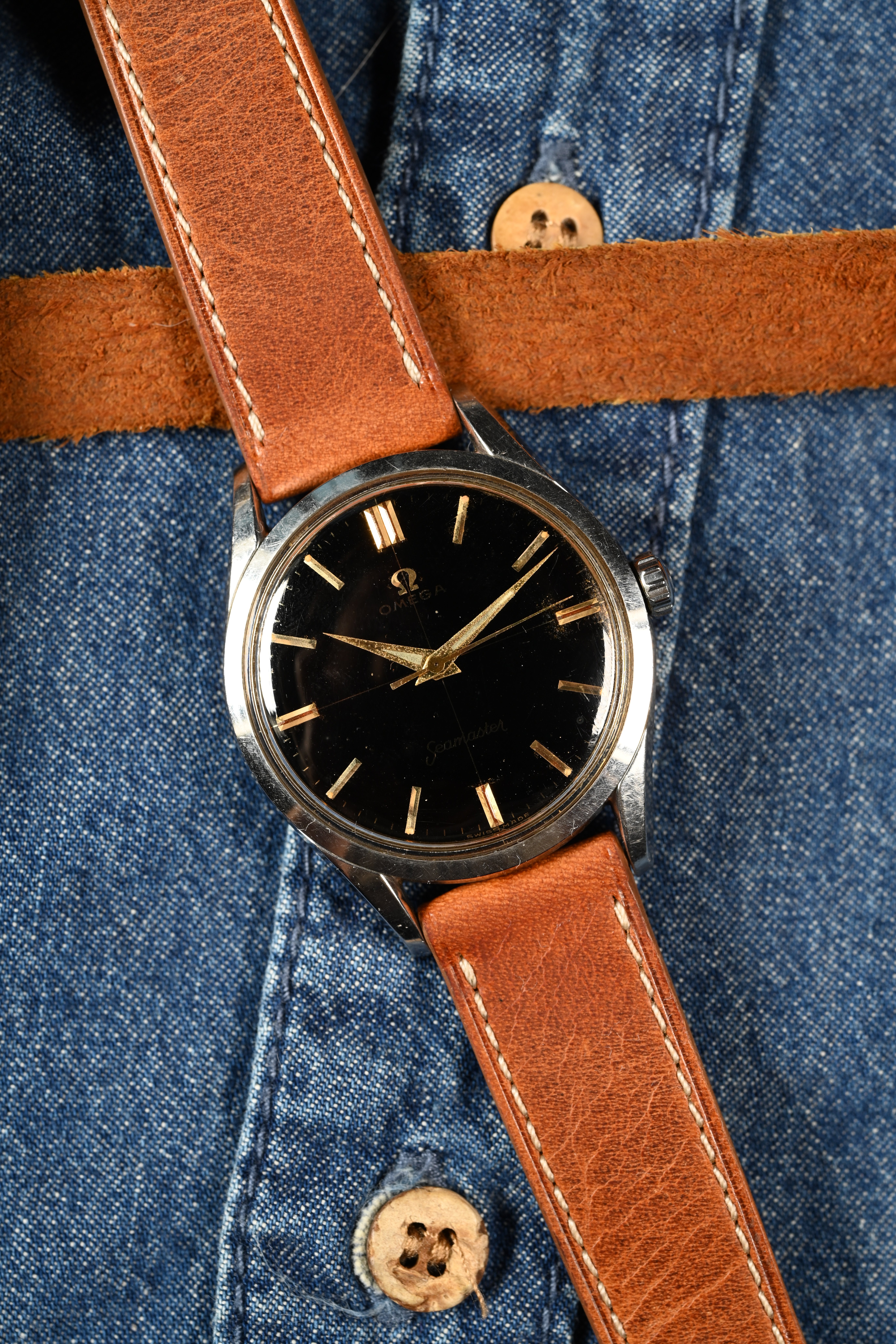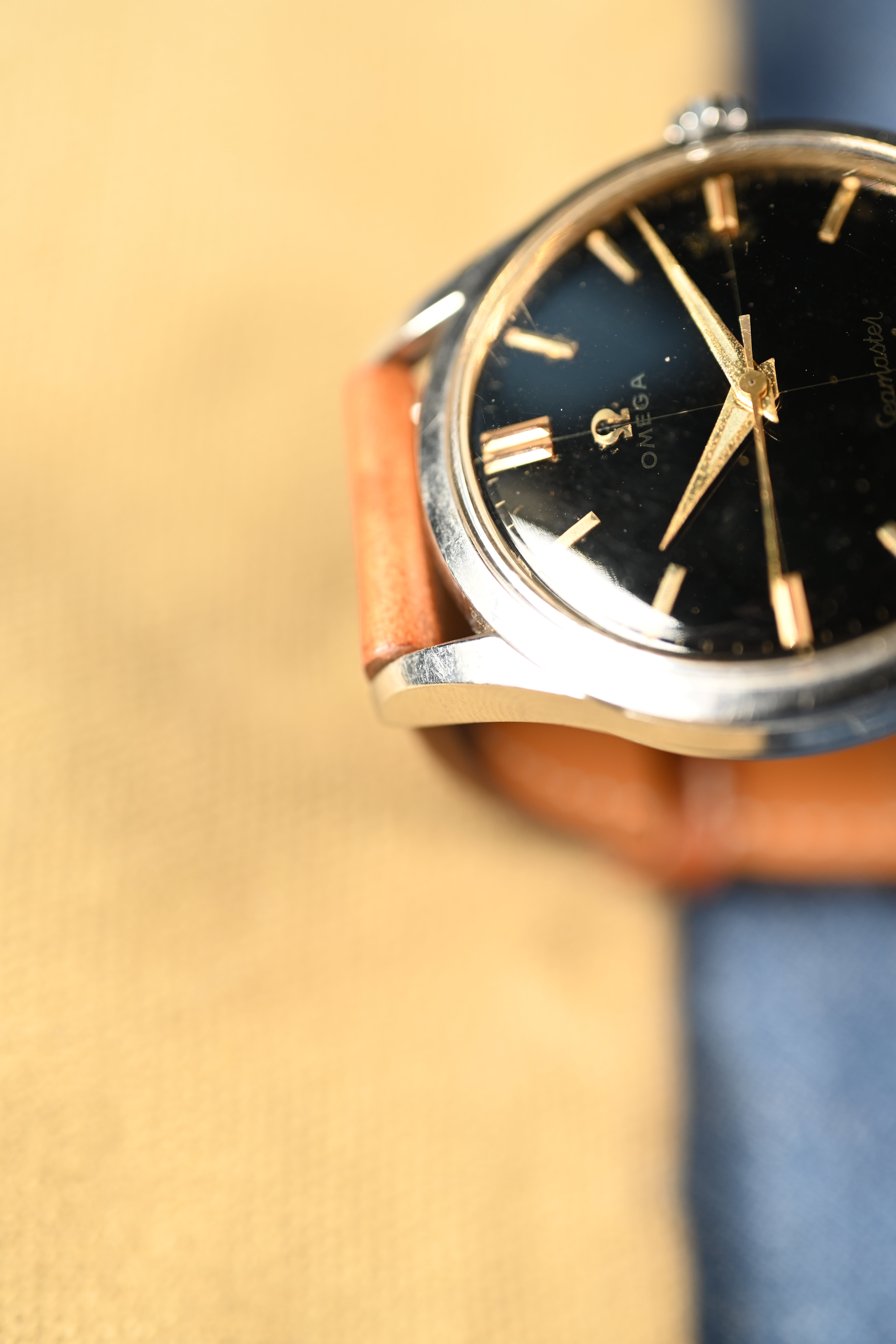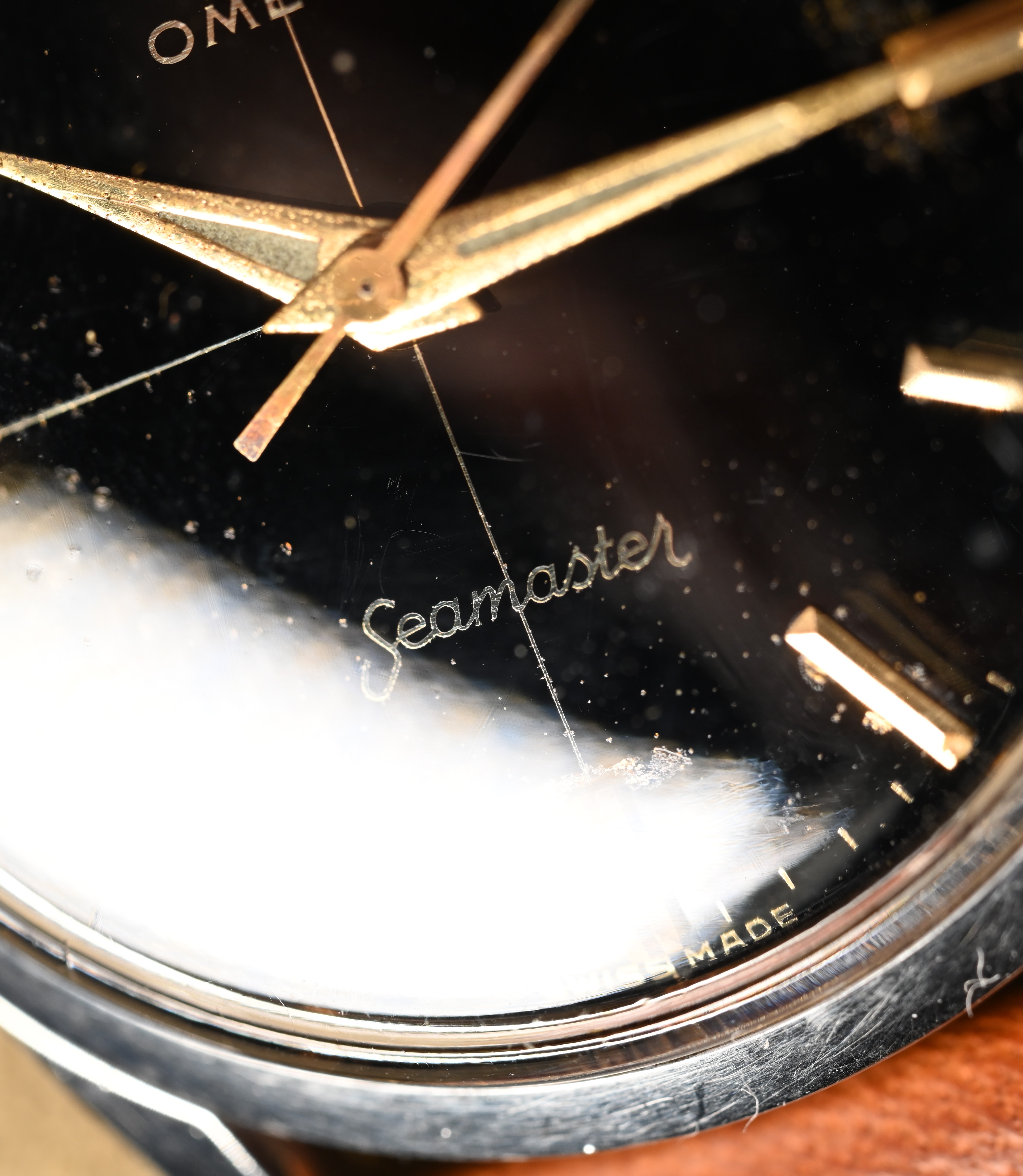 DIAL: An original gilt dial complete with coveted crosshair configuration. The dial features applied gold baton style hour markers with matching dauphine hands. The dauphine hands sport the broad lume inlet. The lume on the dial has taken on beige patina and matches the hands perfectly. The gilt dial presents with an even spotting decay that is common for original gilt dials giving the watch a "galaxy" appearance in certain lighting.