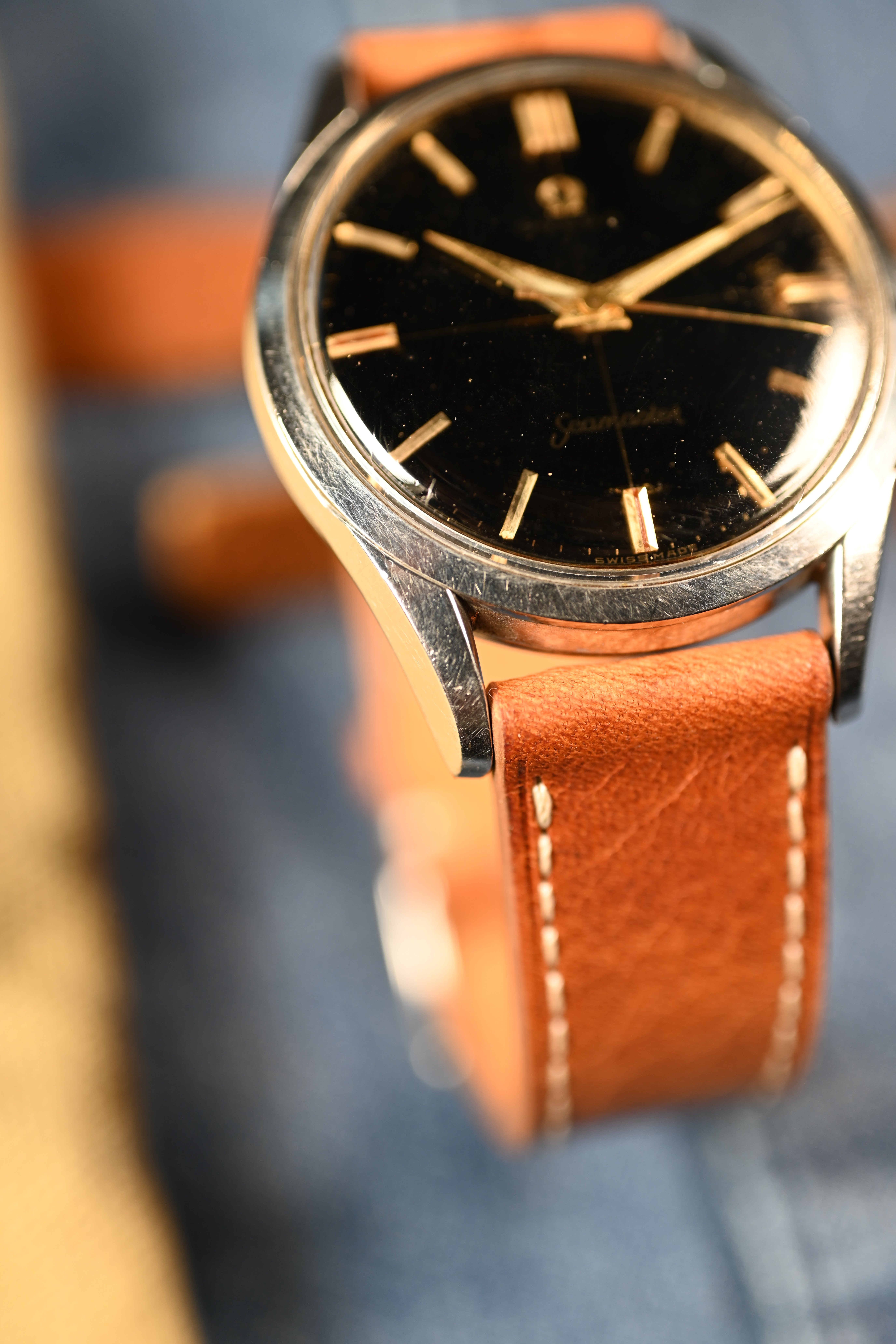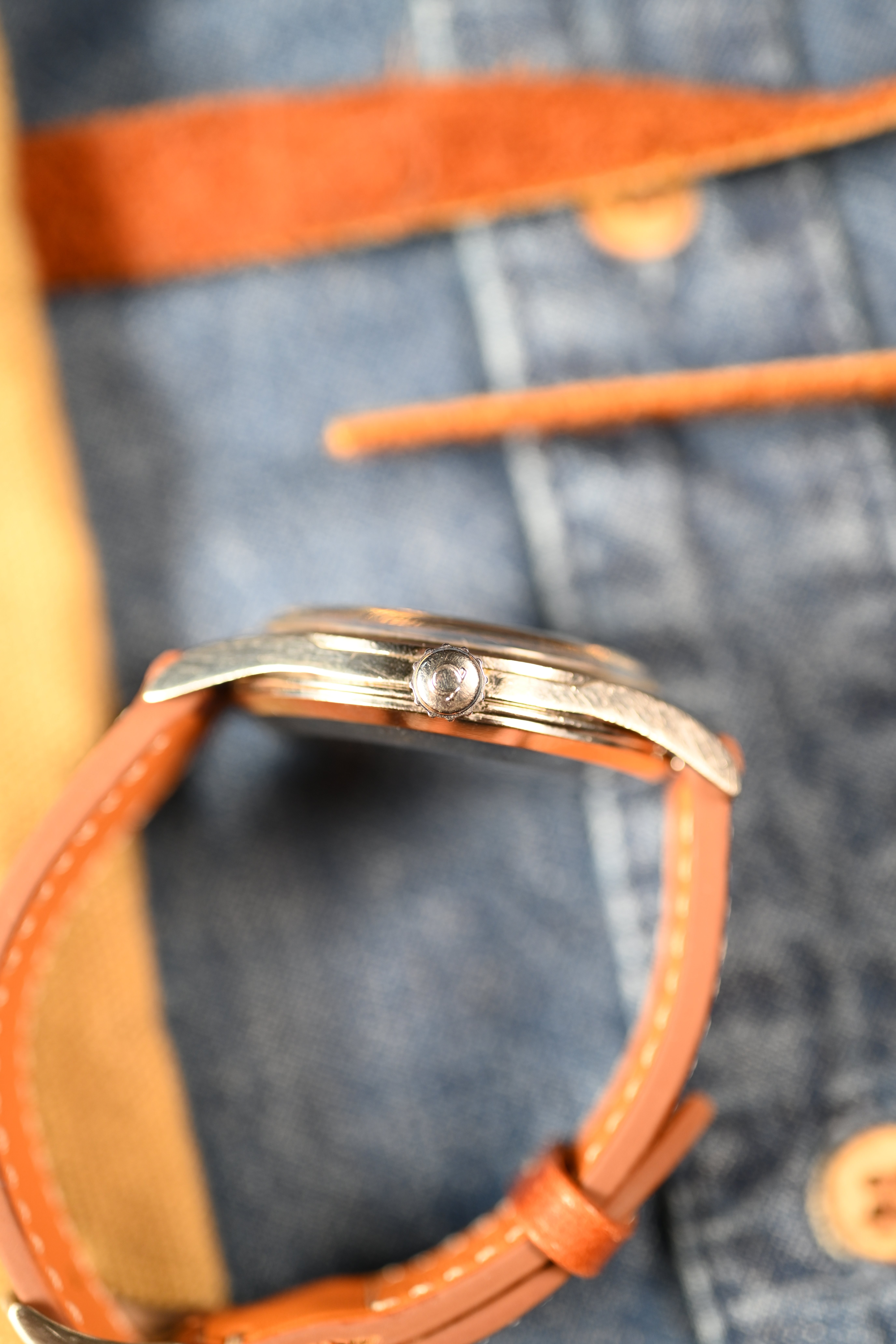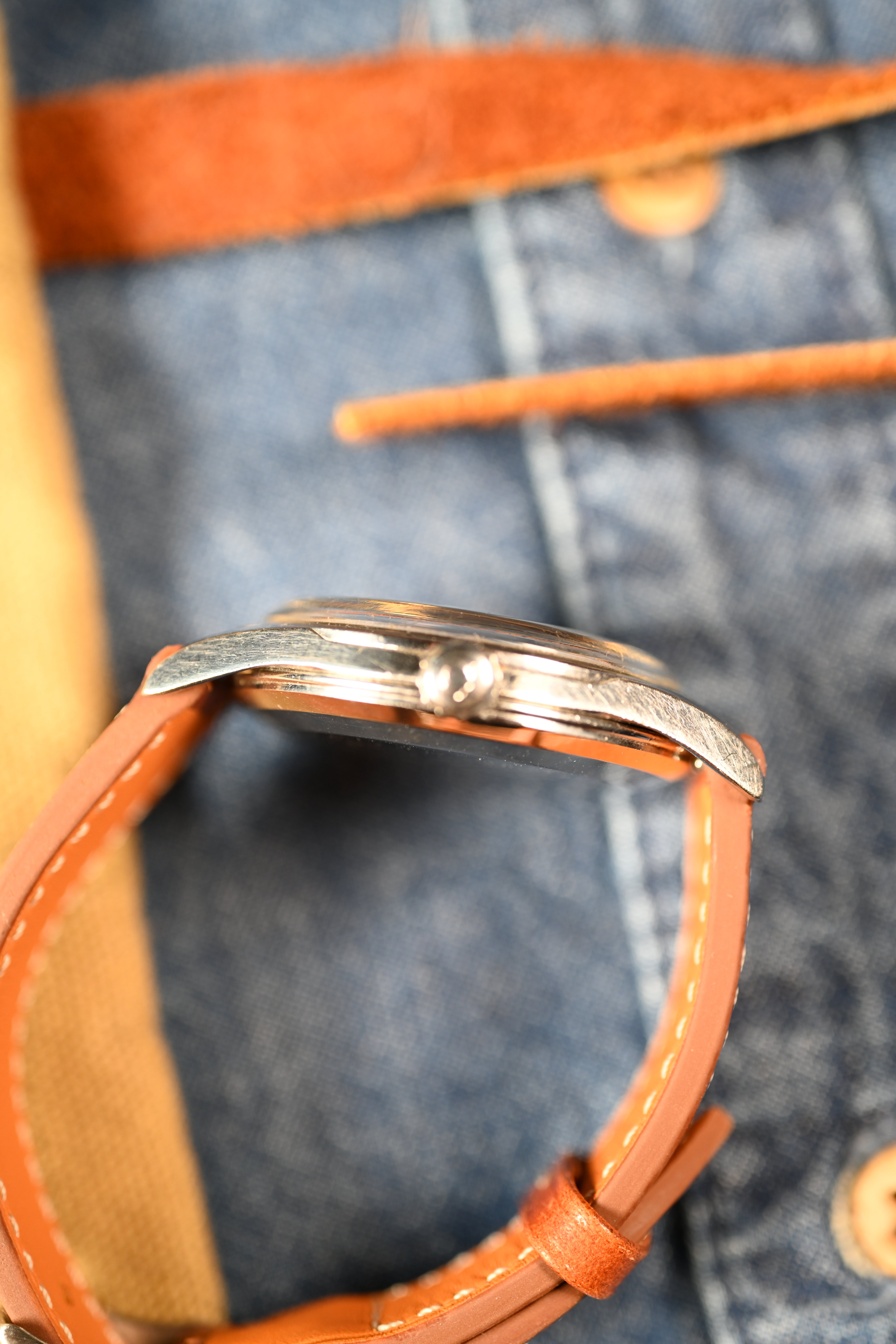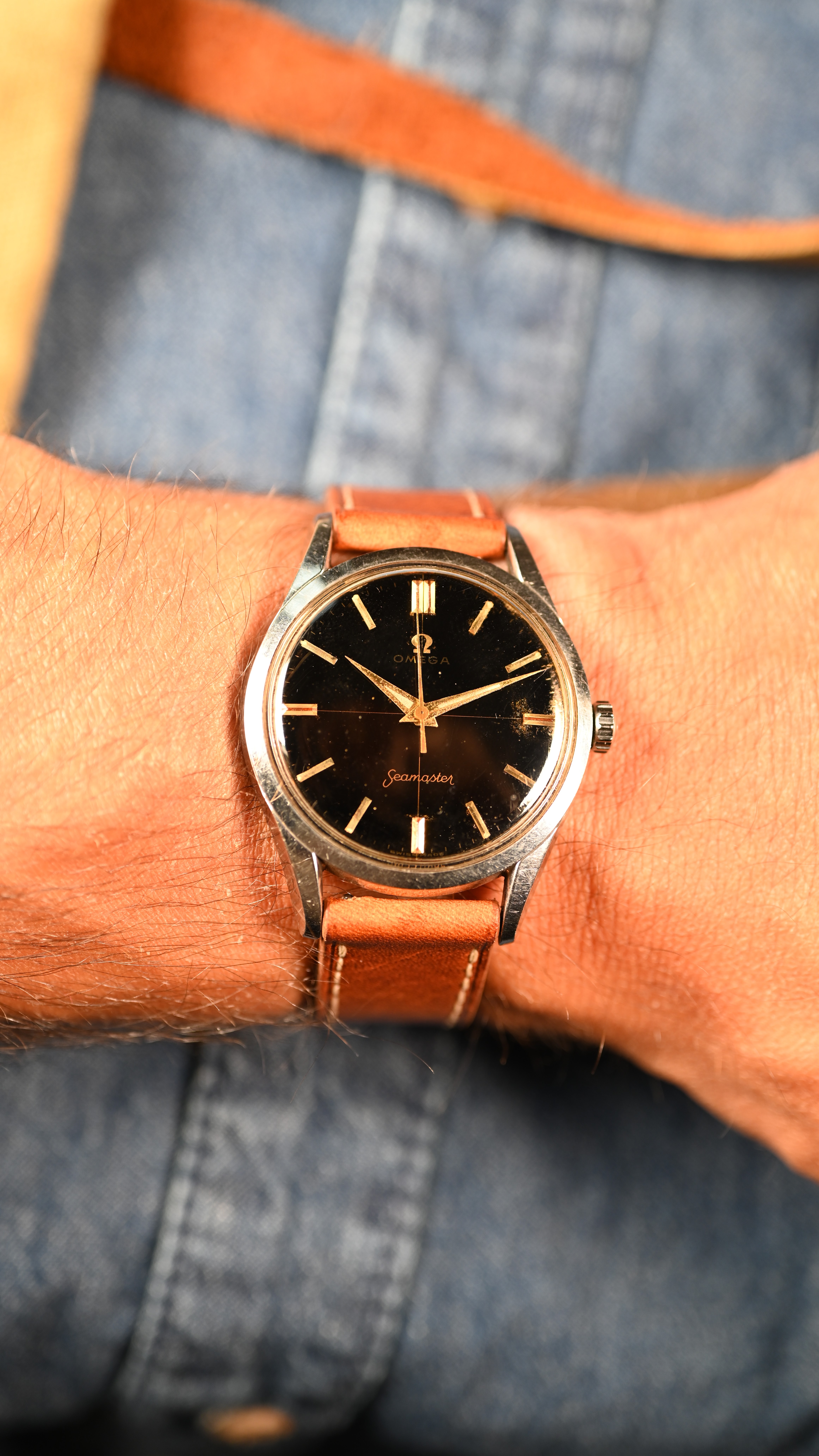 DIAL: An original gilt dial complete with coveted crosshair configuration. The dial features applied gold baton style hour markers with matching dauphine hands. The dauphine hands sport the broad lume inlet. The lume on the dial has taken on beige patina and matches the hands perfectly. The gilt dial presents with an even spotting decay that is common for original gilt dials giving the watch a "galaxy" appearance in certain lighting.