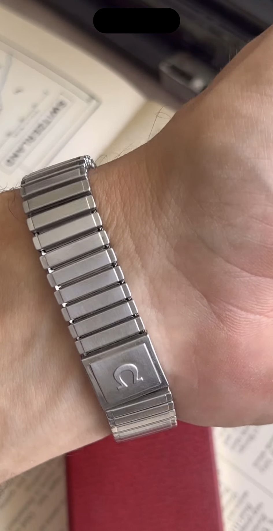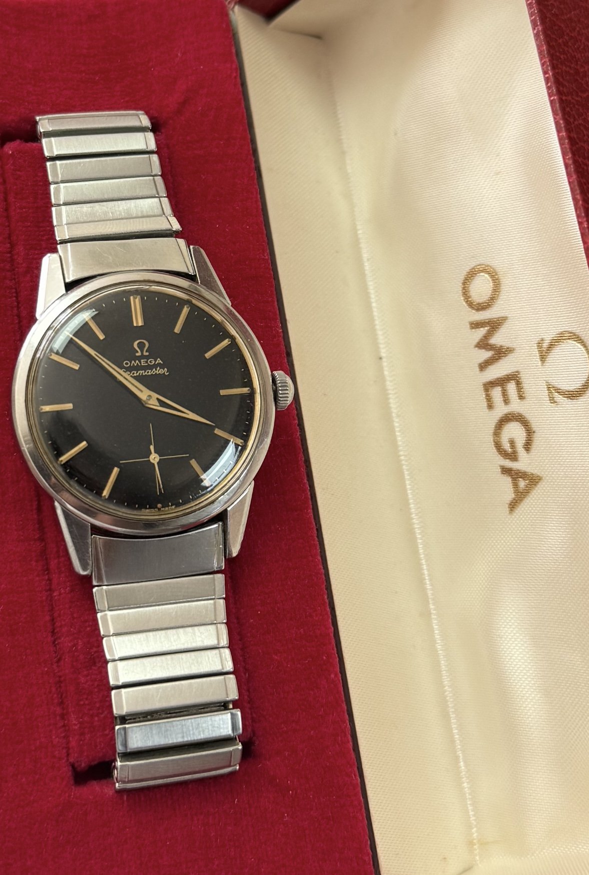 ·I received this beautiful Omega Seamaster today. The dial is original glit black dial and in untouched condition. Crown original Omega, bracelet flex Omega 1122 with reference 558 and original vintage red Omega box. Cal.268. Case diameter without crown 35.5 36.