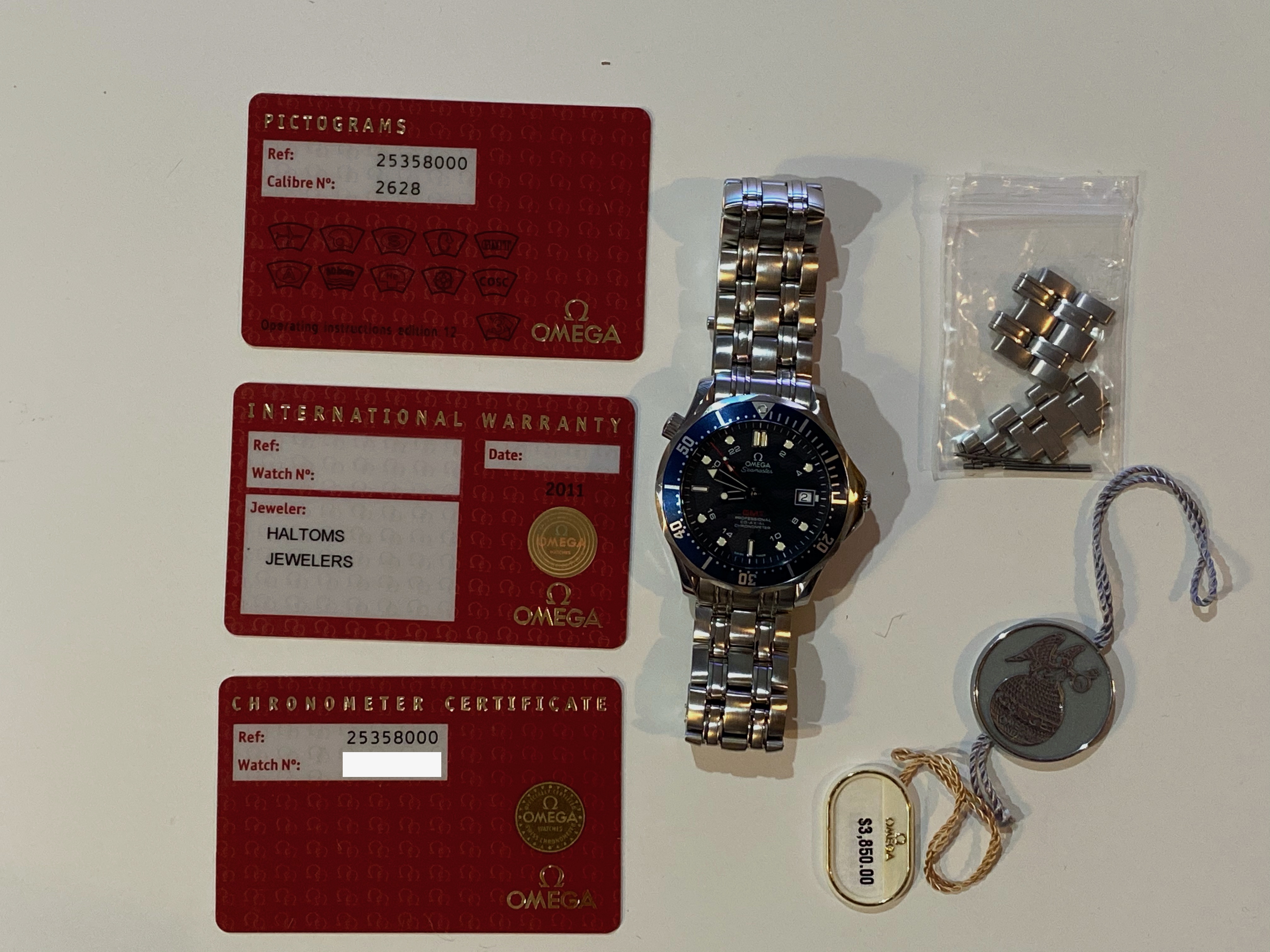 1- Omega pictogram, chronometer certificate and warranty card (warranty card is AD stamped but blank selling date)