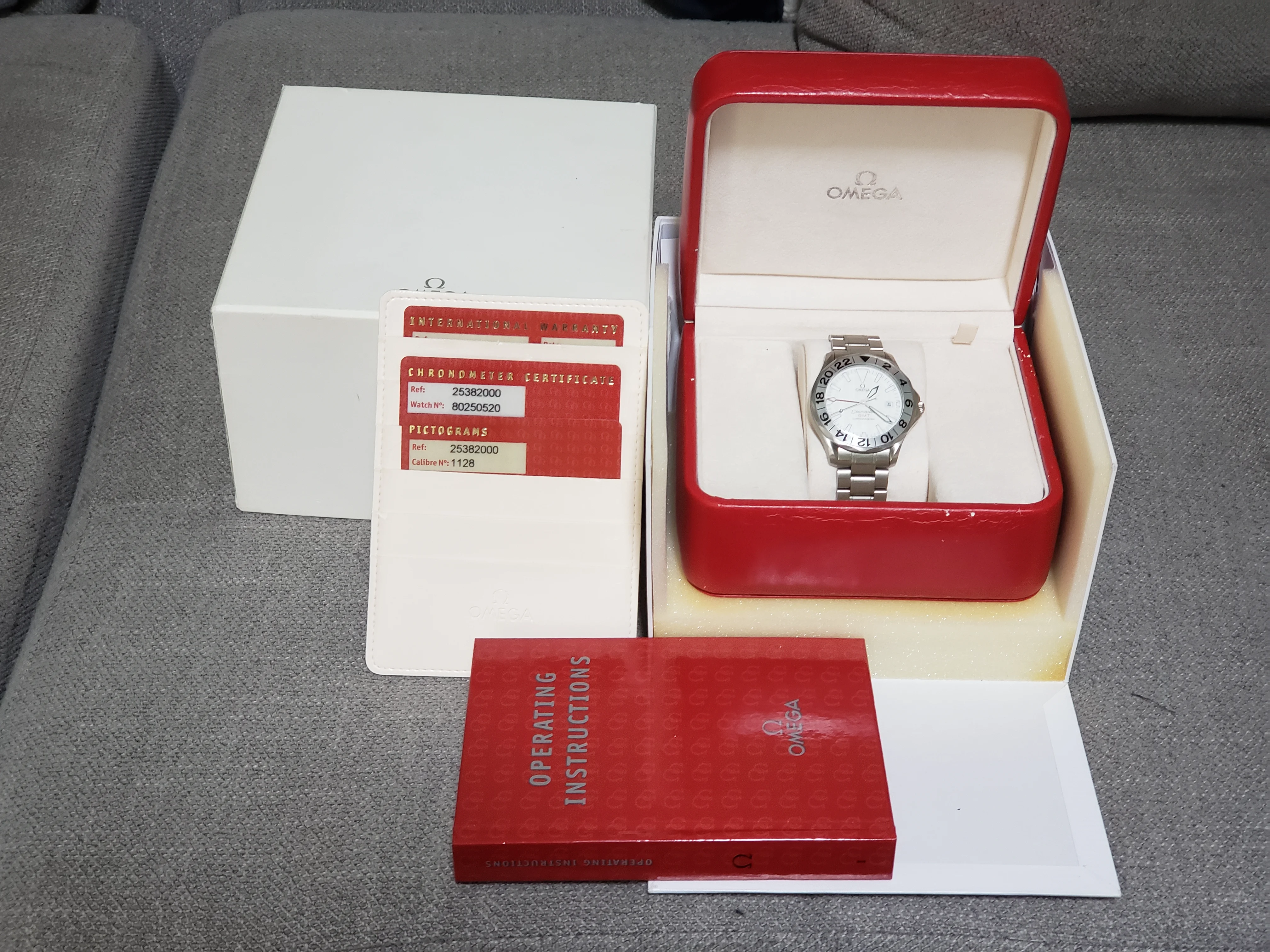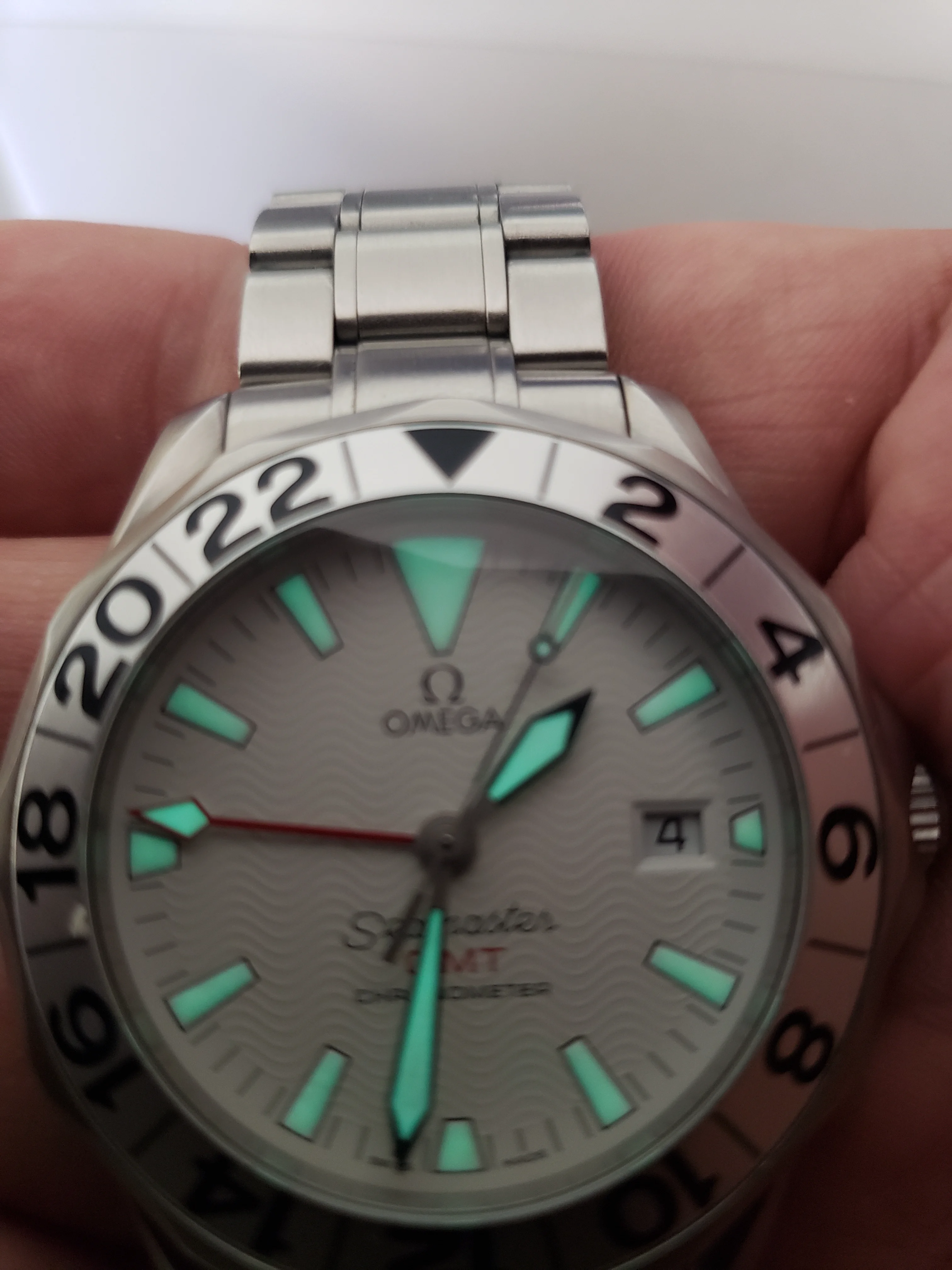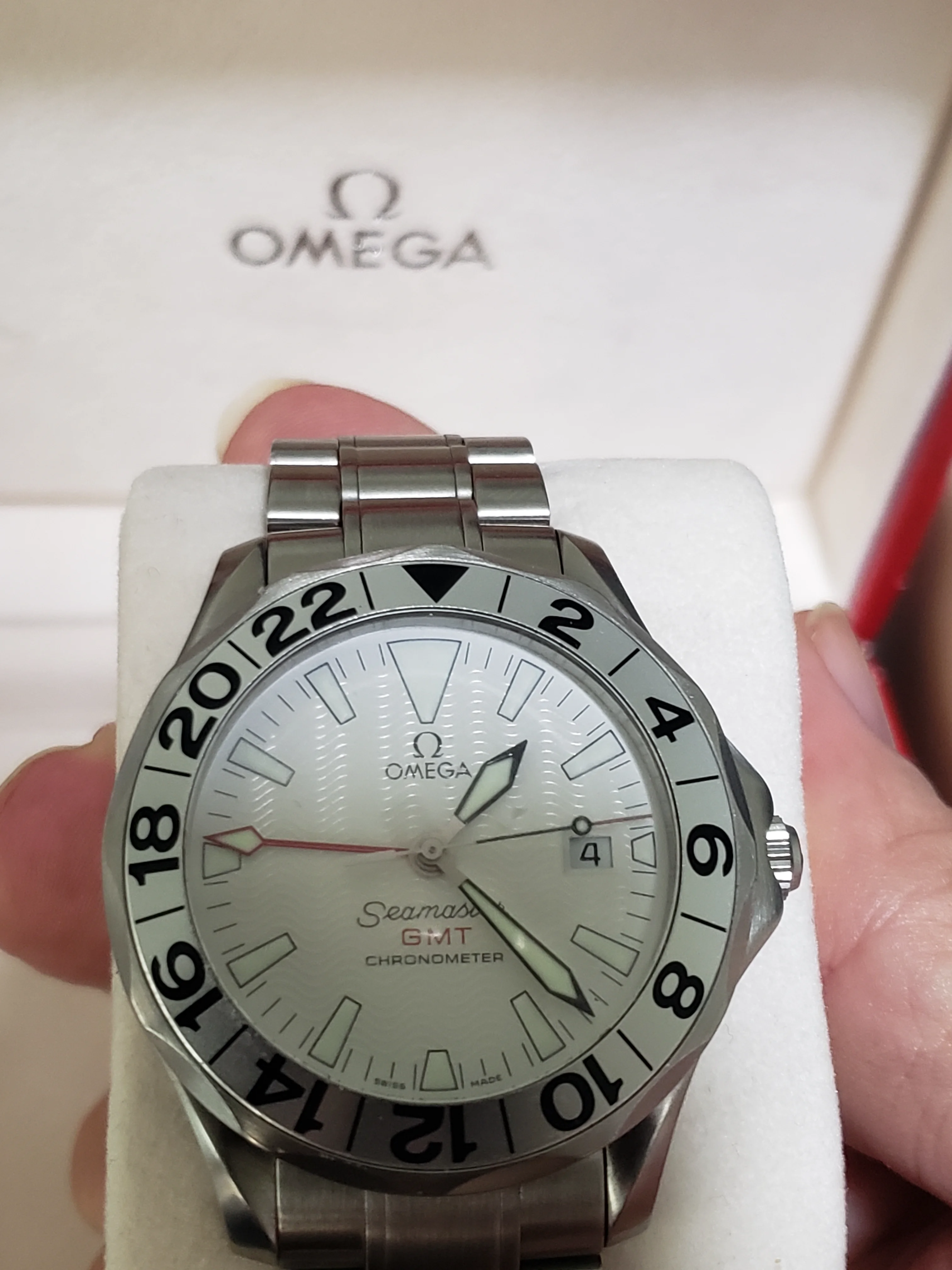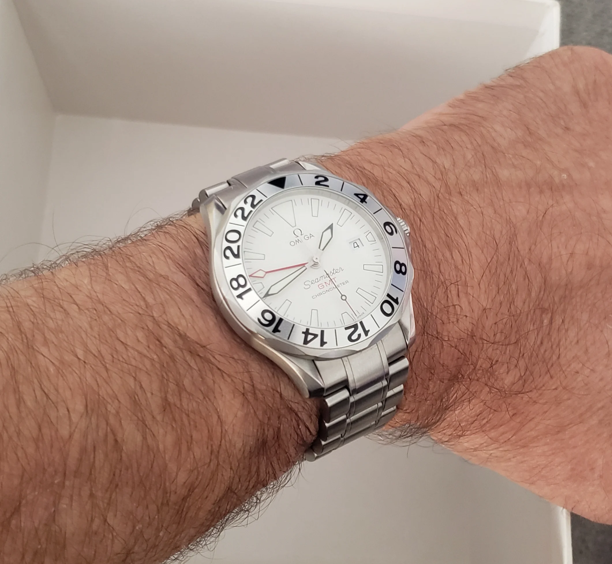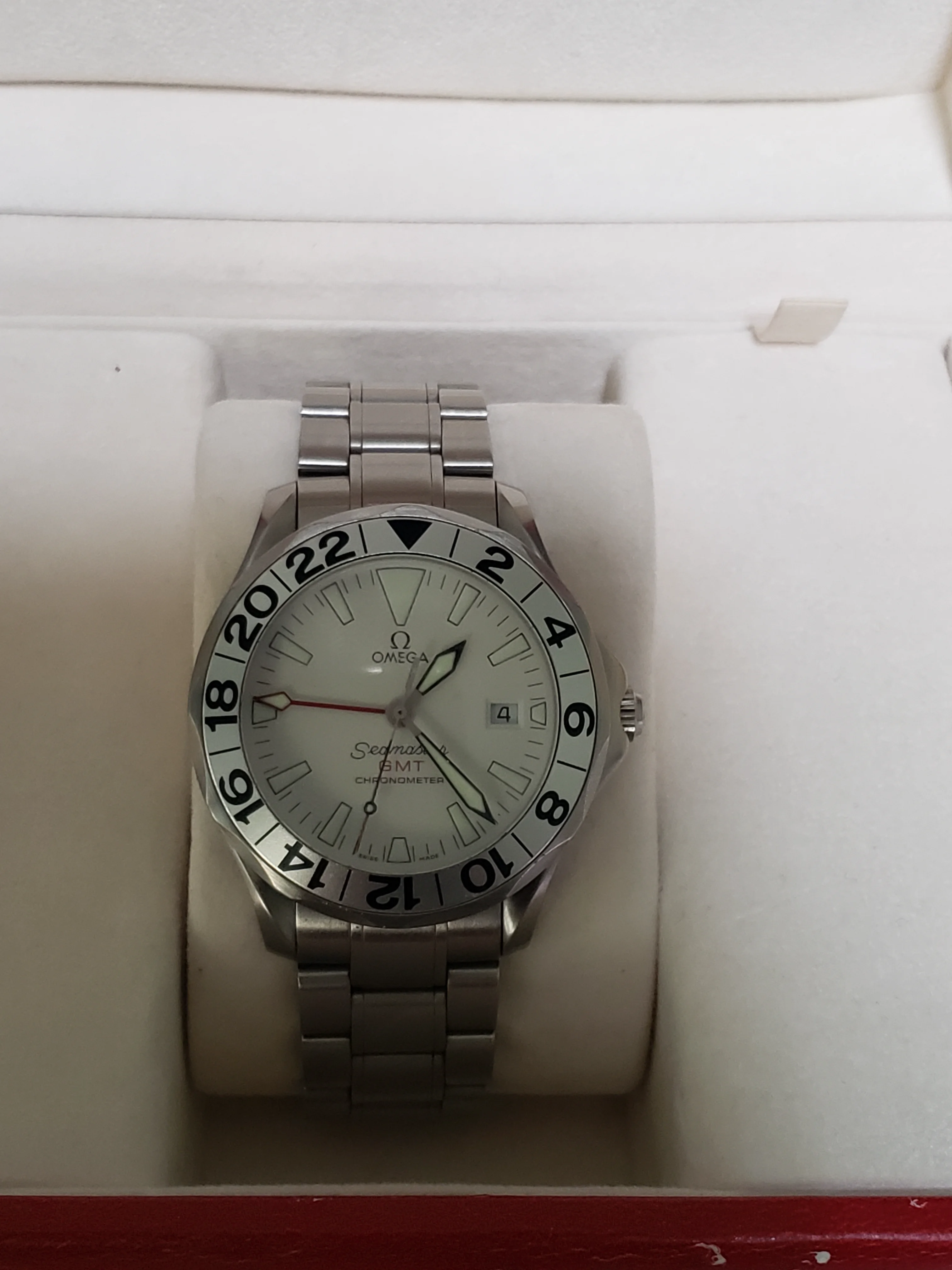 Up for sale is my Omega Seamaster Professional 2538.20, better known as the "Great White." 1128 movement, 41 mm in diameter, 13.1 mm thickness, fits easily under the shirt cuff. Has the white wave dial, large lume plots, sword hands, and red GMT hand. The uncluttered dial makes it extremely readable. IMO one of the best designs from the Peter Blake era.