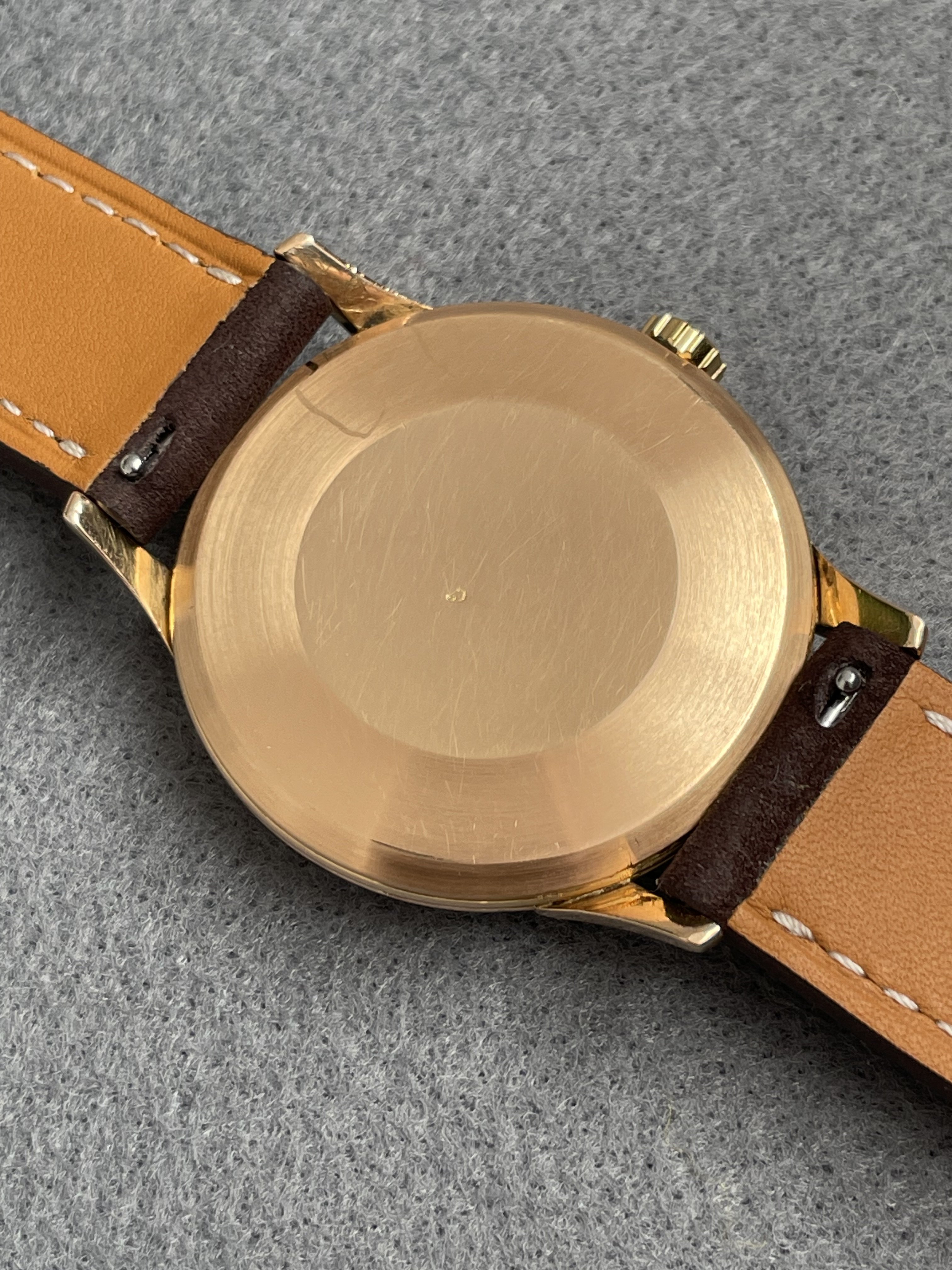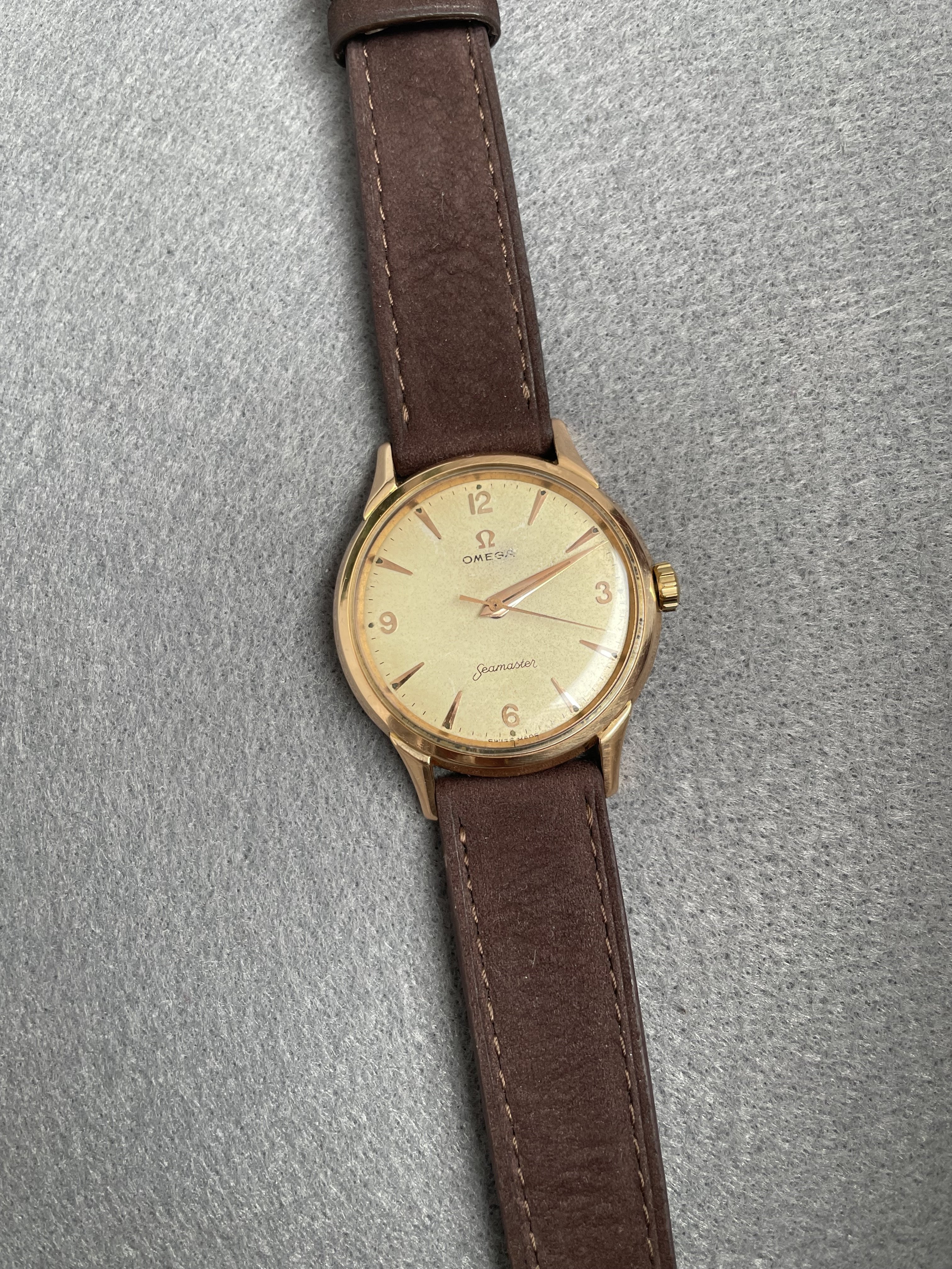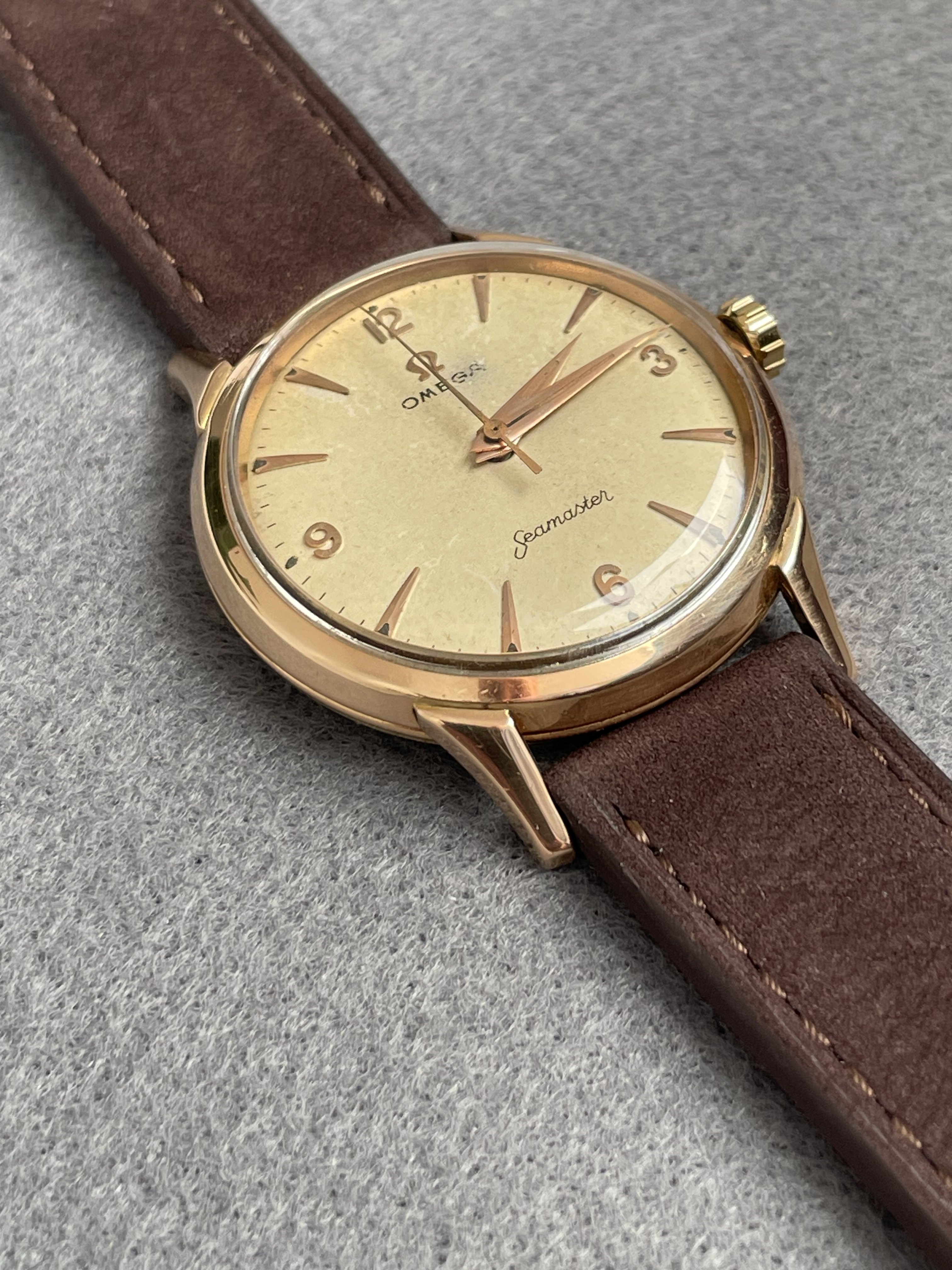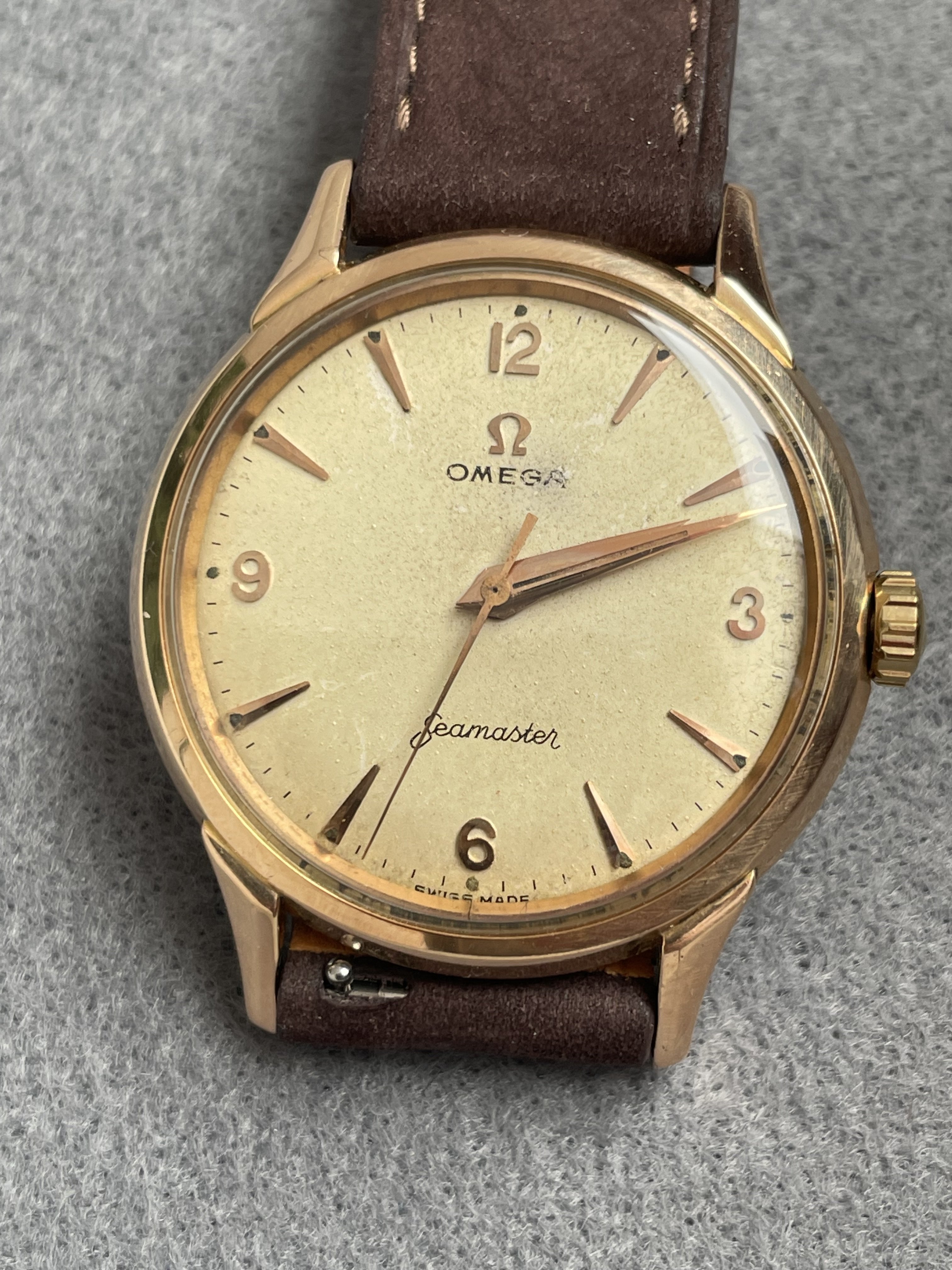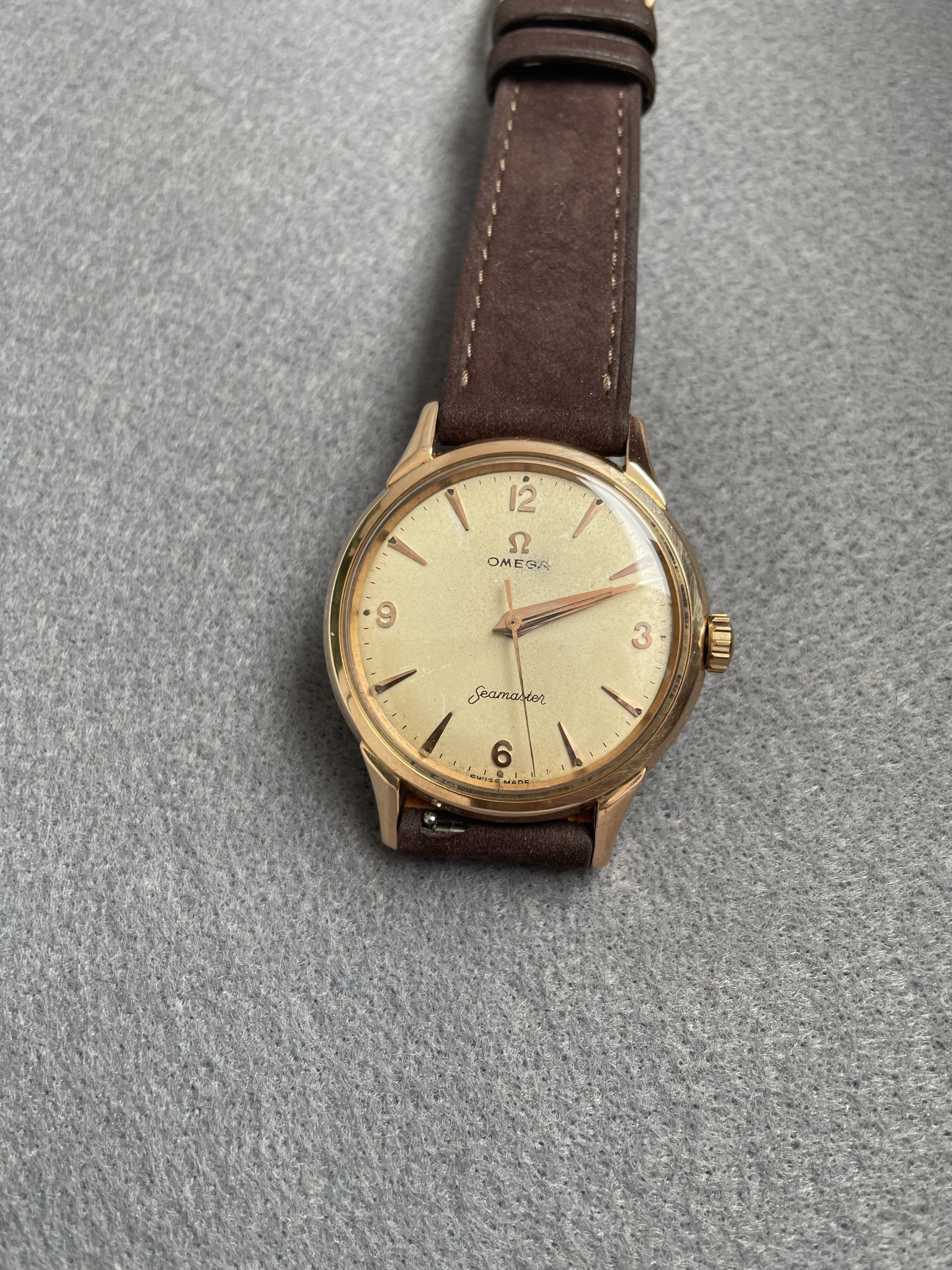 This Omega Seamaster in 18k pink gold french case had a movement revision at my watchmaker about 18 months ago. With a diameter of 36mm without the crown, the watch is relatively large. The condition of the case is very nice, not polished to death ;-) It has the French eagle hallmark on the back and on the horn. The pink gold also matches the dial with patina very nicely. I once showed the watch in the OF because I wasn't sure if the dial was original. According to the professionals here in the forum, the dial is original.