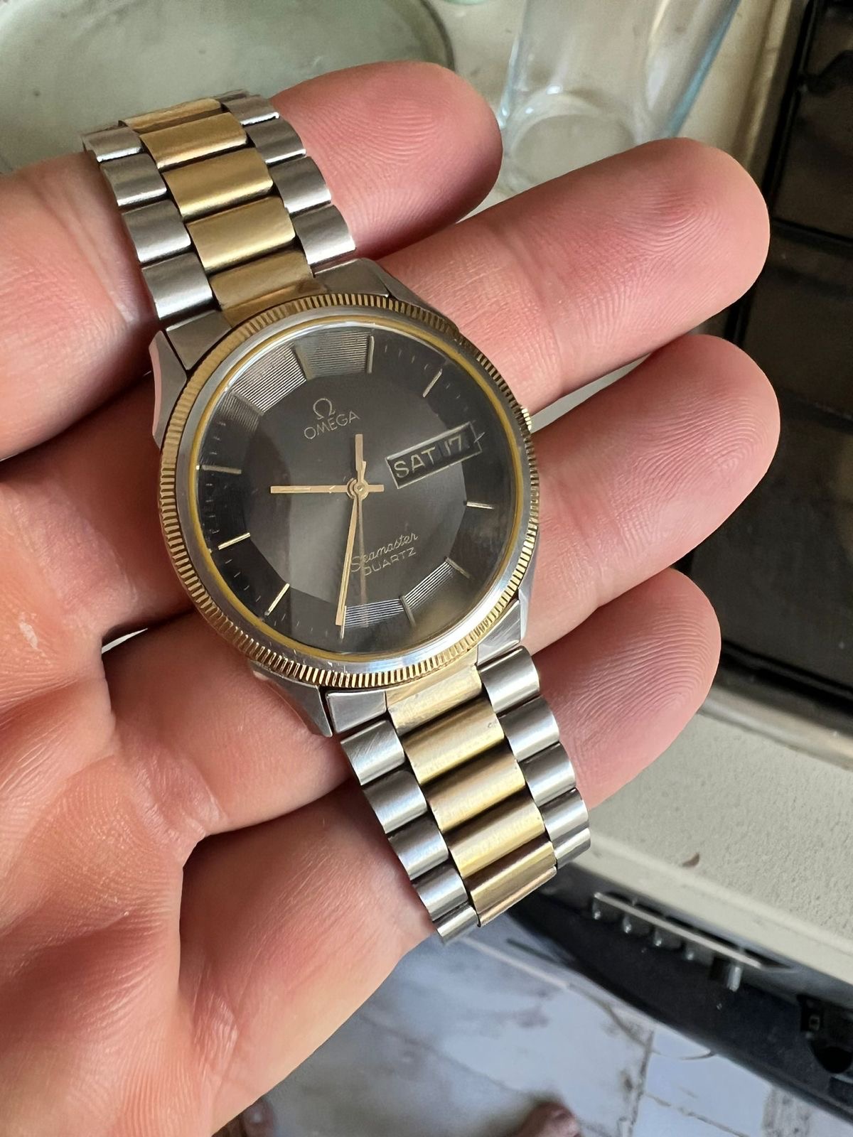 ·Hello friends. Today I came across this Seamaster Quartz with a Pie Pan dial. Full set. It looks unpolished. I think it has a gold bezel and top. Gold/steel bracelet. I think this is a rare Seamaster and frankly it looks very nice with the black dial. The price is 625 dollars, what do you think? If there is something wrong with the watch, can you write about it that I didn't see? Thank you, regards