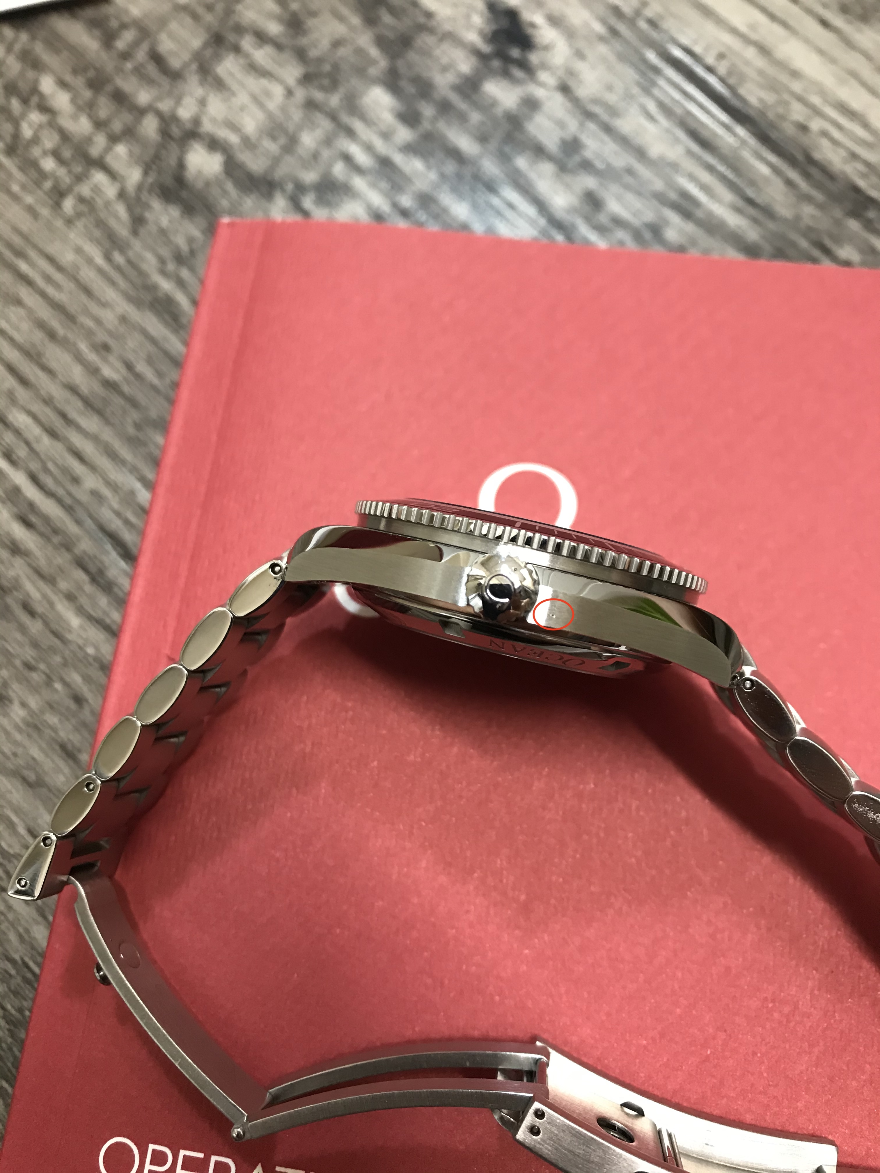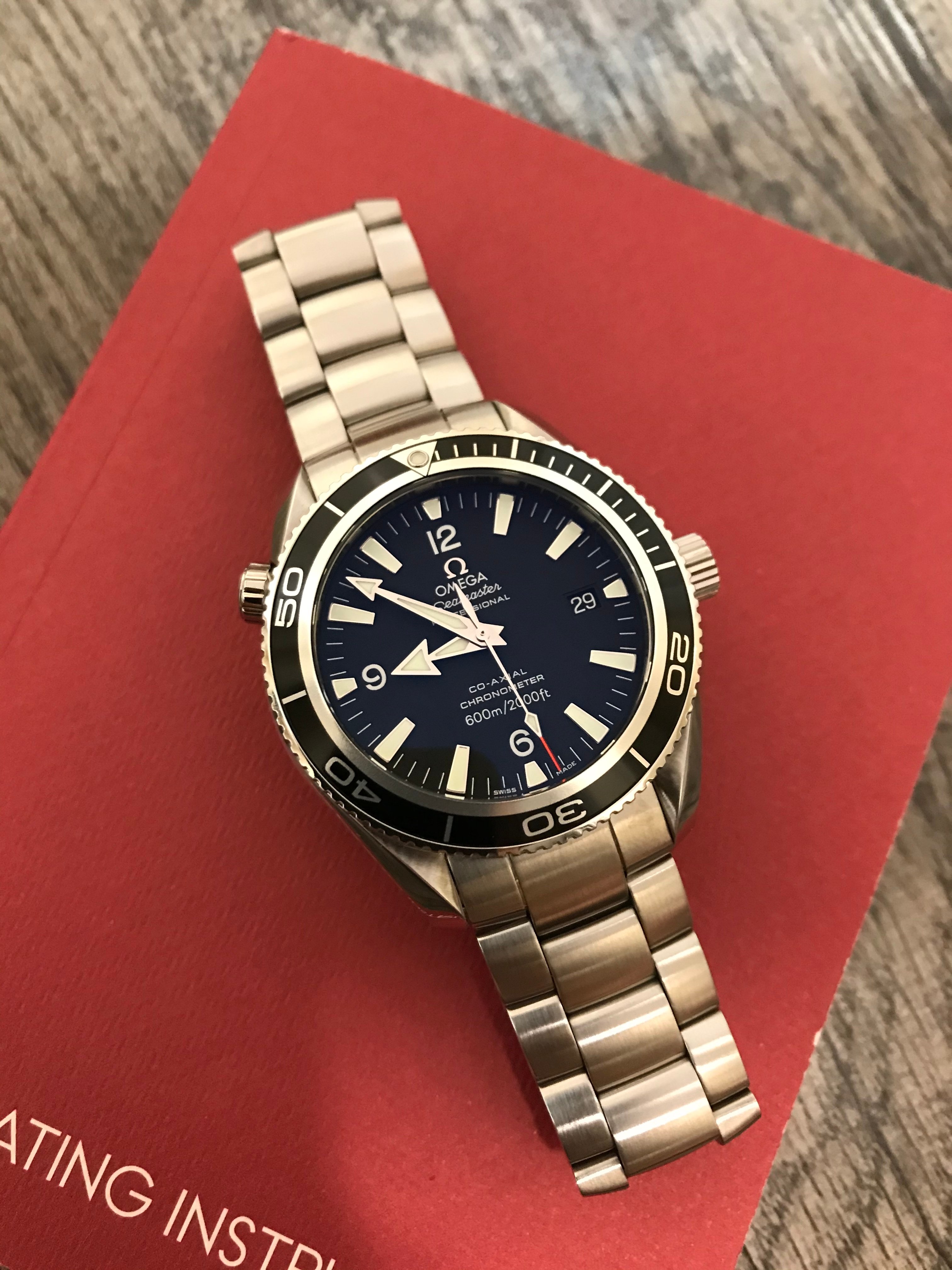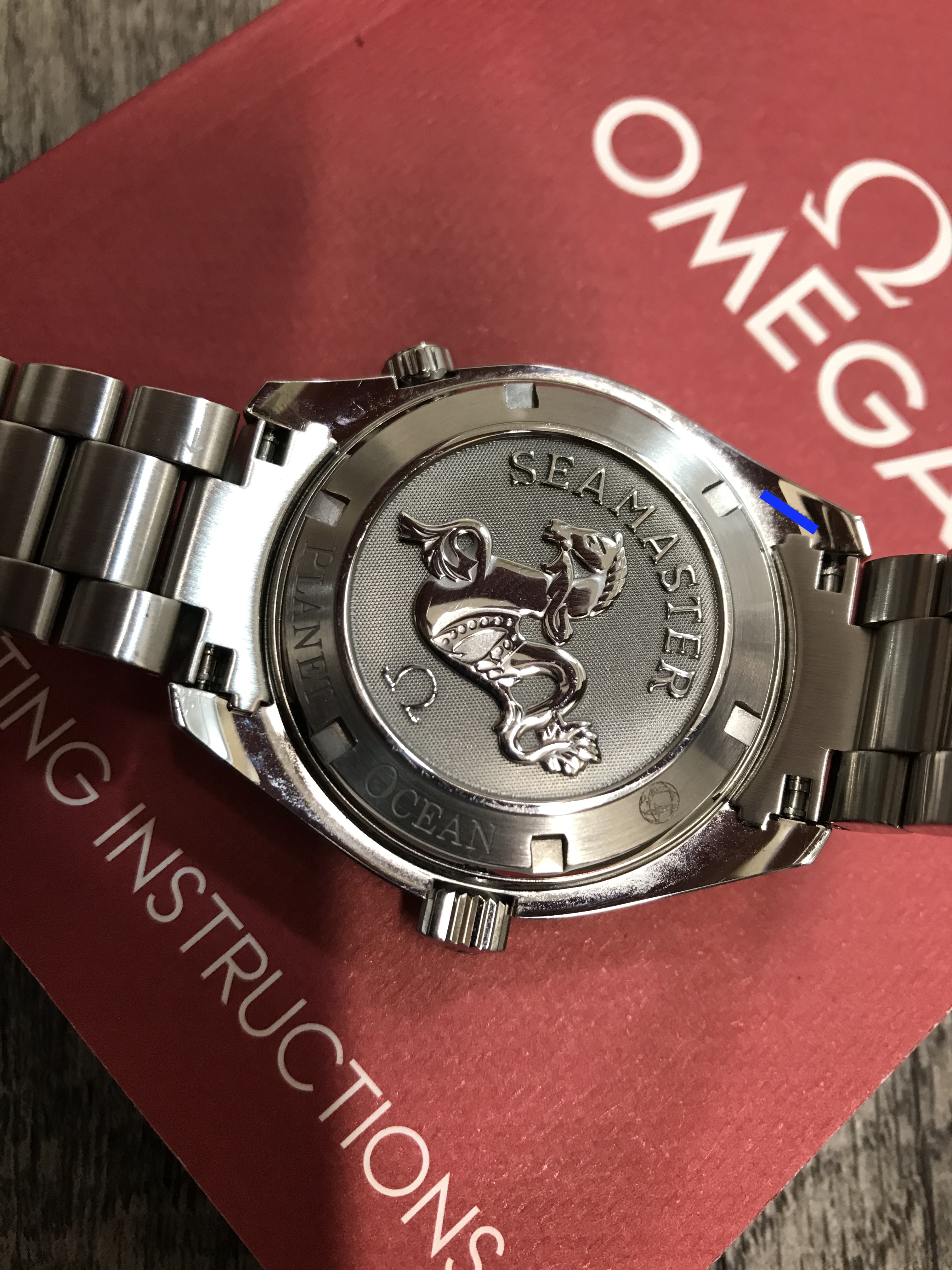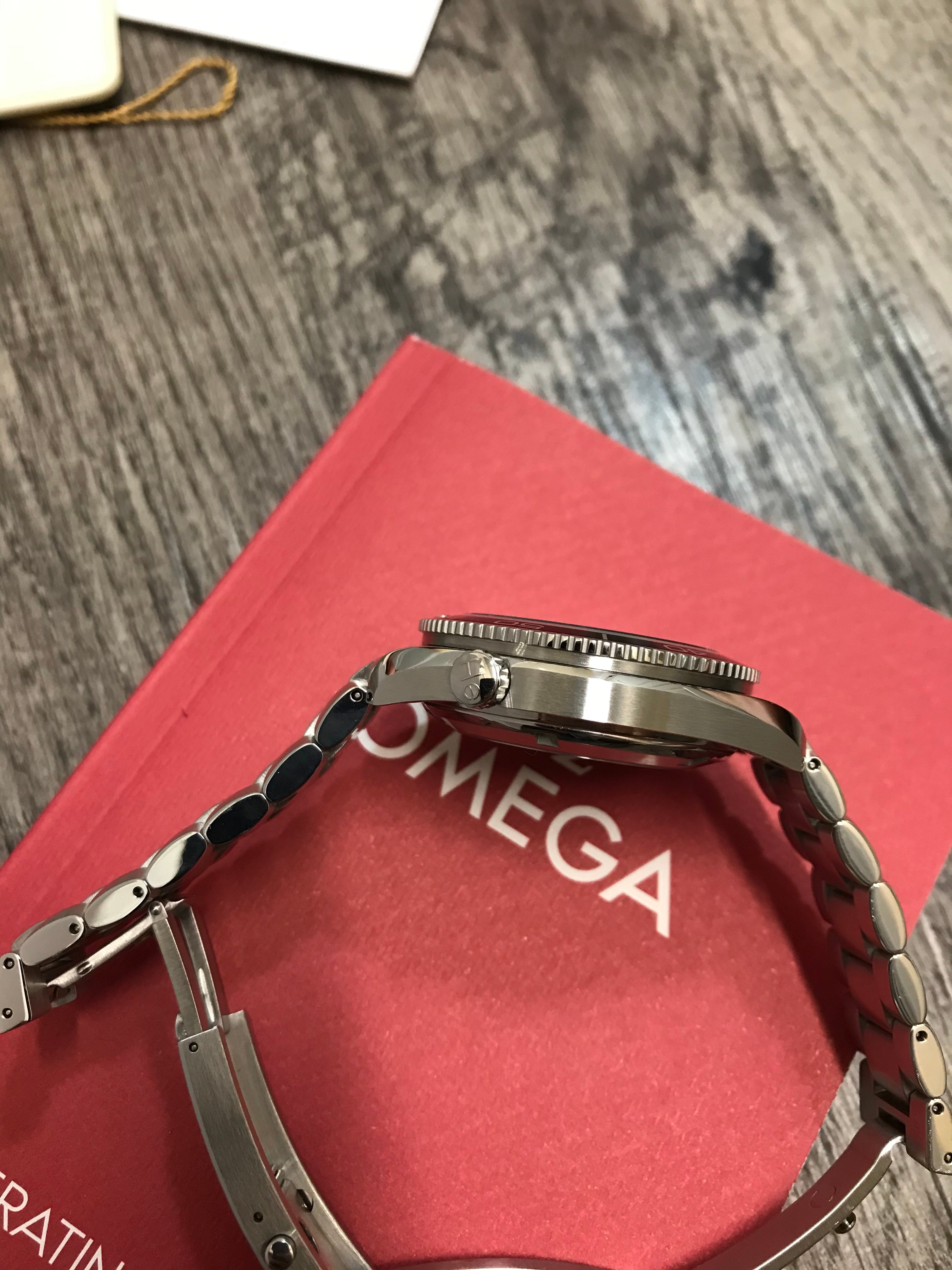 This Planet Ocean functions well and is without any issues. When I received the watch last summer, I had it inspected and pressure tested by an Omega factory-trained watchmaker (who also took the movement shot below). He did not feel the watch would need to be serviced for several years at least. On my wrist, it is currently averaging around +4 seconds per day. It also passed a dry pressure test to 3 ATM (30 m) on 5/28/20. Cosmetically, it is in fantastic shape with only a few minor superficial marks on the bracelet and small ding near the crown (marked in red in one of the pictures below––but please note the lighting makes it look far worse than it actually is). The dial, bezel insert, crystal, and AR coating are without any defects.