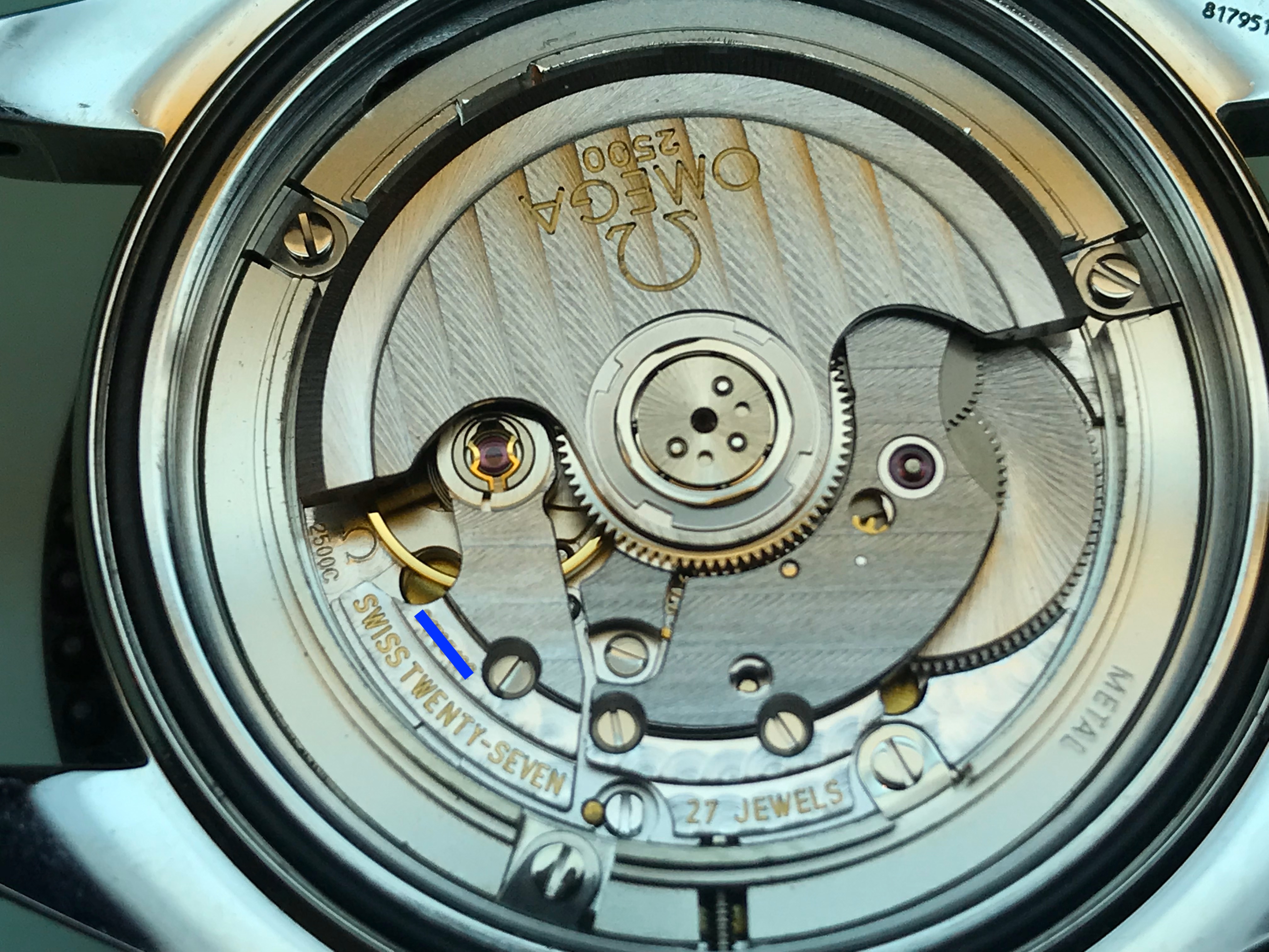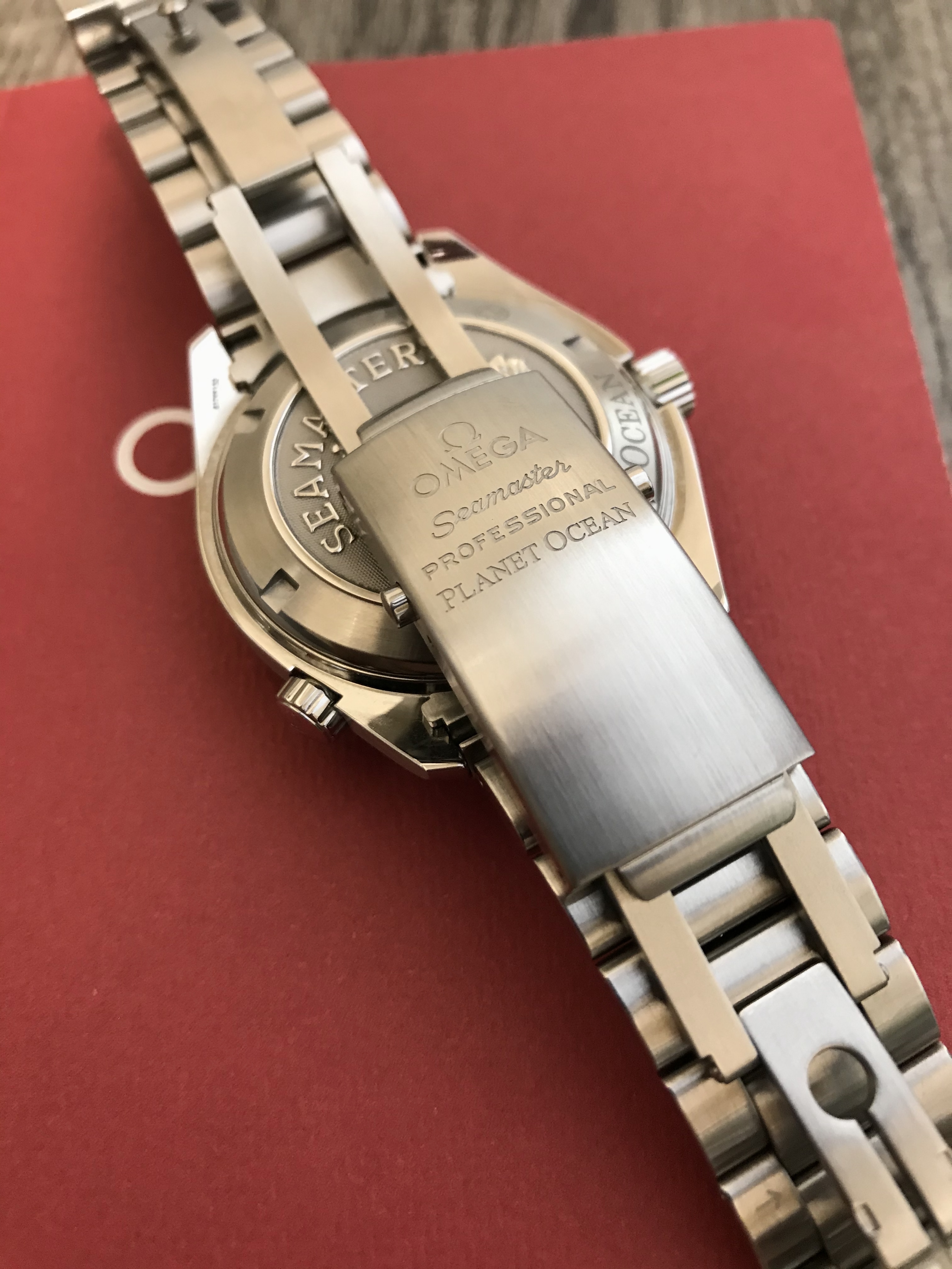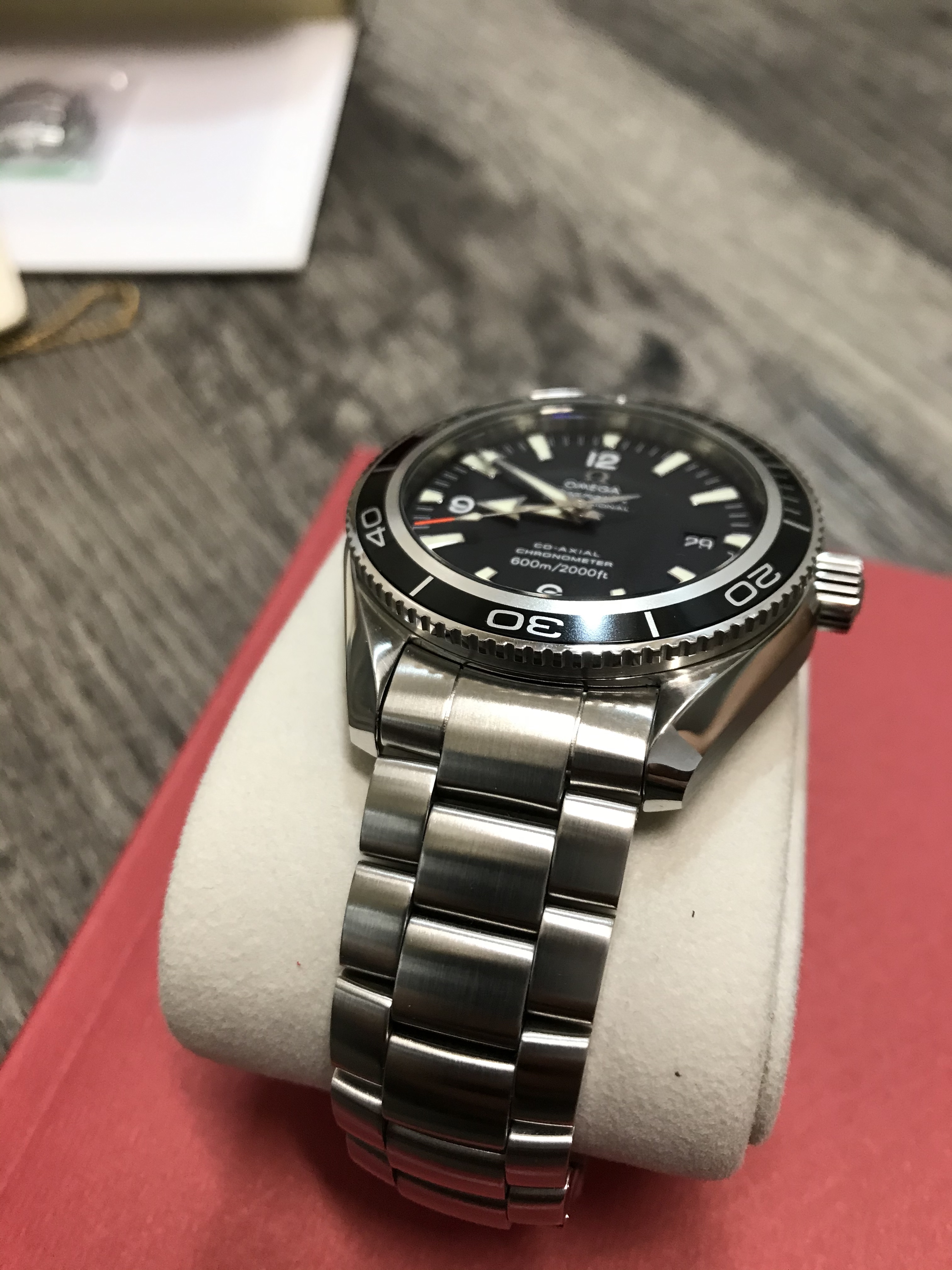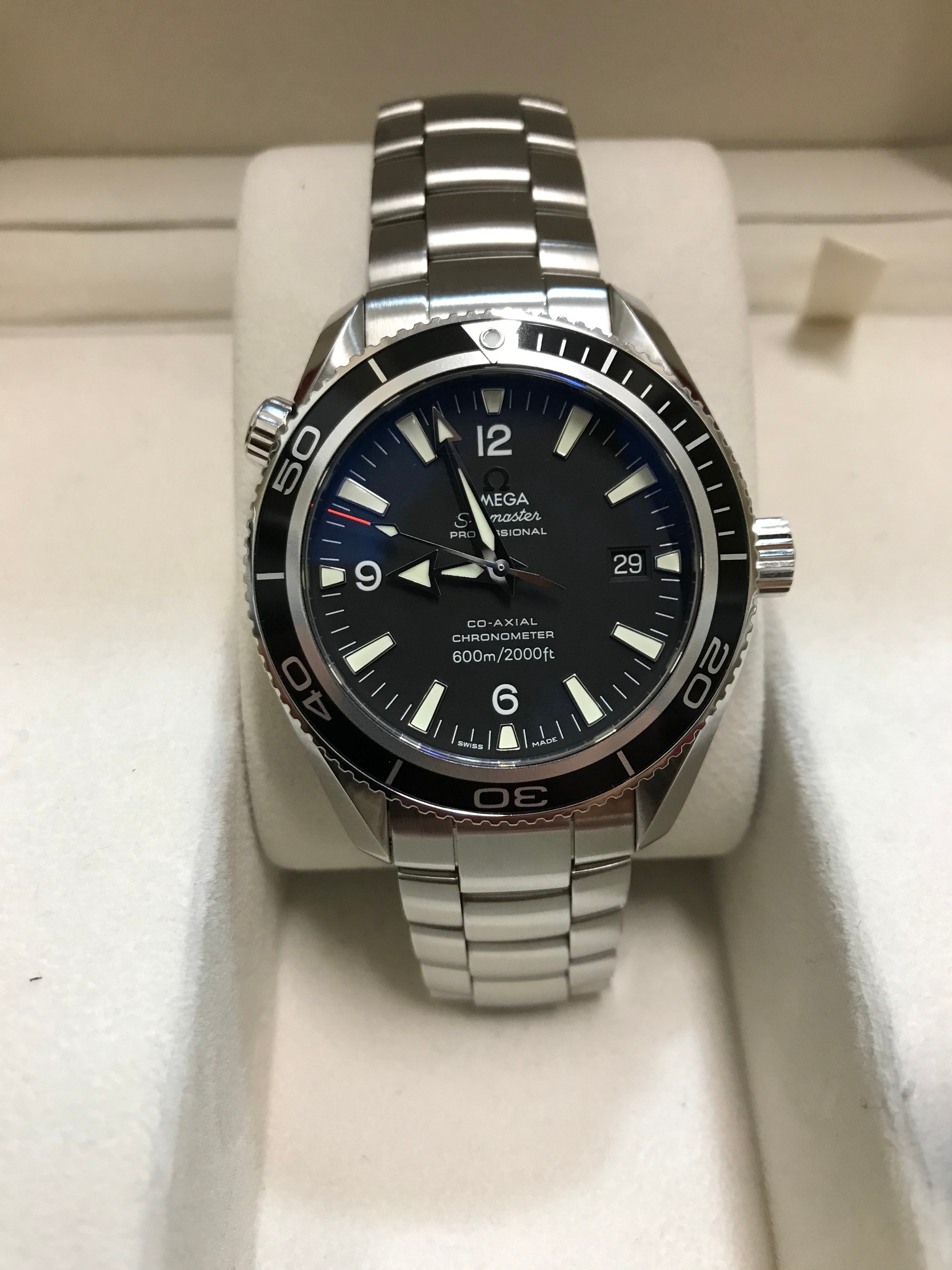 This Planet Ocean functions well and is without any issues. When I received the watch last summer, I had it inspected and pressure tested by an Omega factory-trained watchmaker (who also took the movement shot below). He did not feel the watch would need to be serviced for several years at least. On my wrist, it is currently averaging around +4 seconds per day. It also passed a dry pressure test to 3 ATM (30 m) on 5/28/20. Cosmetically, it is in fantastic shape with only a few minor superficial marks on the bracelet and small ding near the crown (marked in red in one of the pictures below––but please note the lighting makes it look far worse than it actually is). The dial, bezel insert, crystal, and AR coating are without any defects.