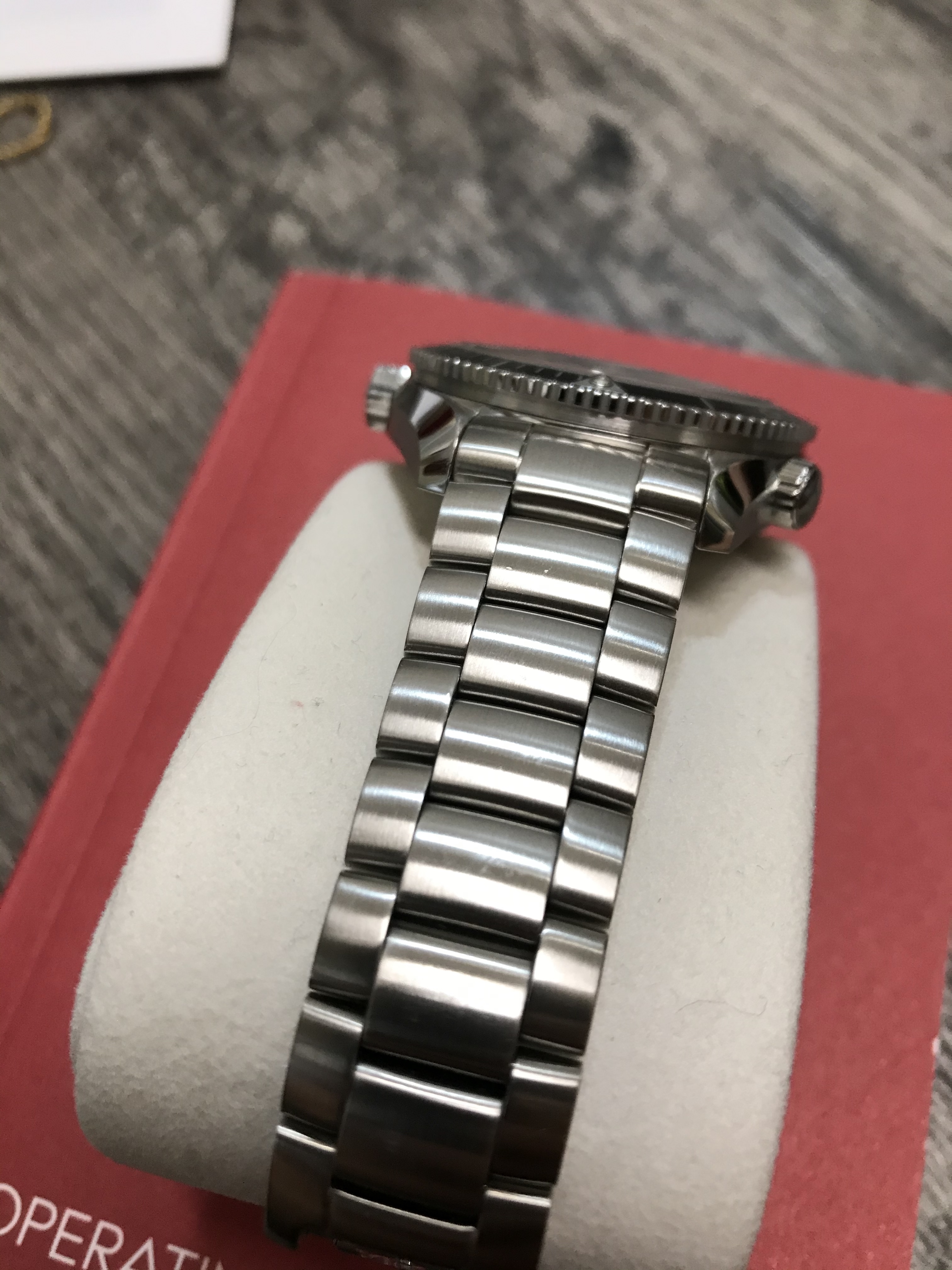 Included is the outer white cardboard box, red inner box (which has definitely seen better days), warranty card, chronometer certification, pictogram card, hang tags, manual, and extra bracelet links. The bracelet is currently sized for a 6.75" wrist.