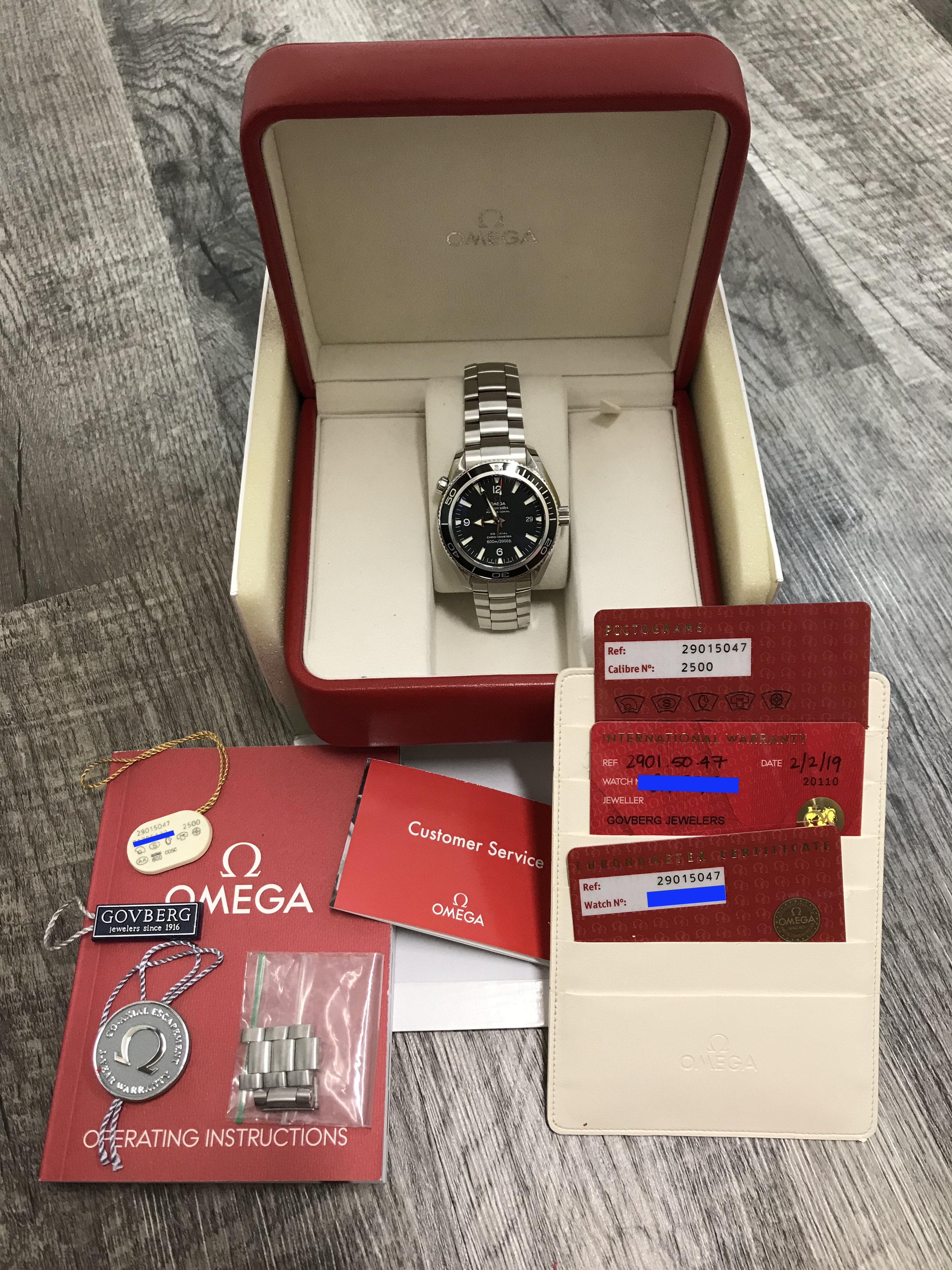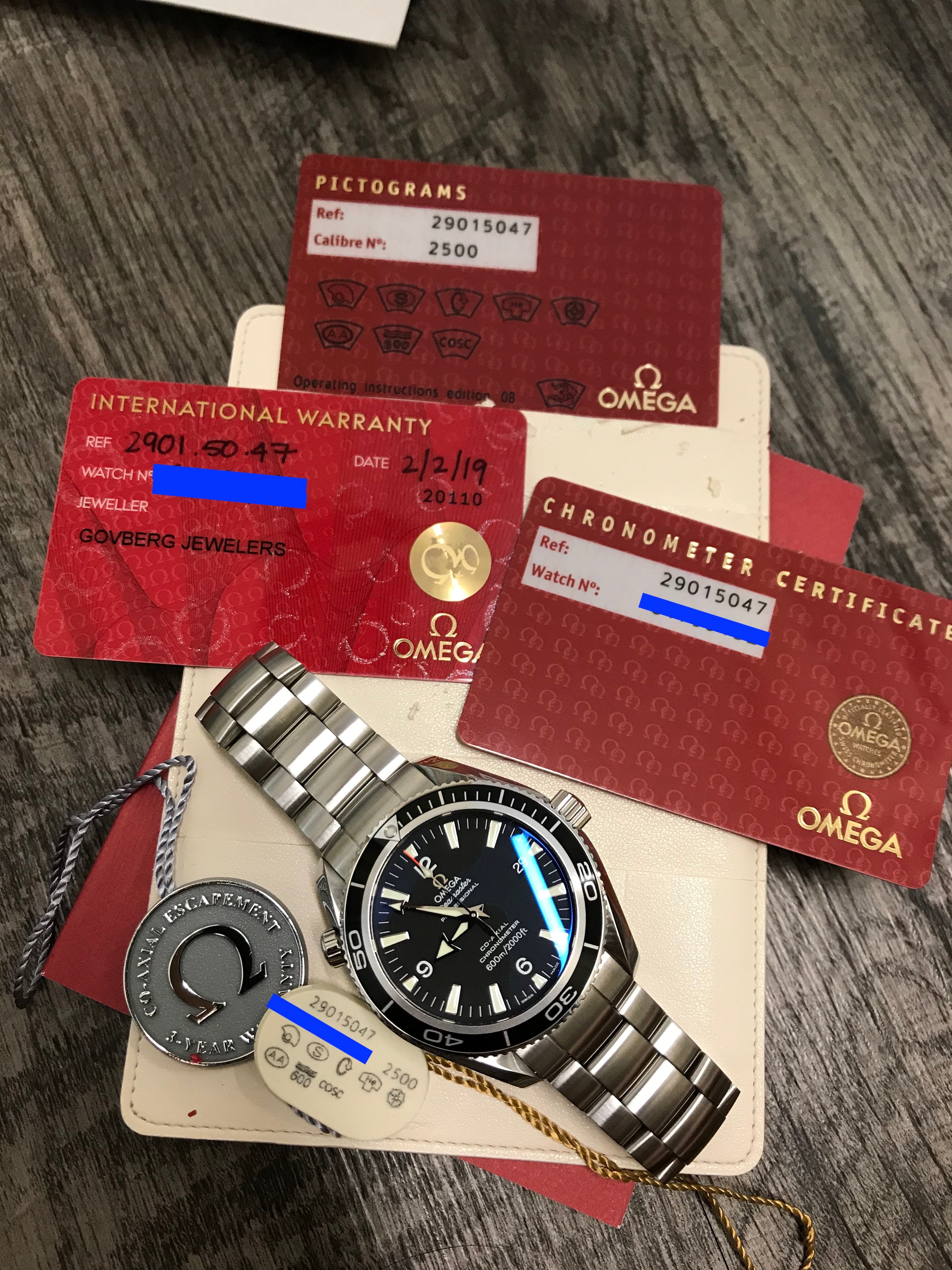 The last casualty in my effort to consolidate my collection into one very nice (and unfortunately very expensive) watch is my Planet Ocean 2500. The original owner purchased this watch as NOS from Govberg Jewelers on 2/2/19 and the warranty card is dated to reflect this. At that time, Govberg swapped out the leather strap that this watch originally came on and installed the appropriate bracelet (effectively making this 2901.50.47 into a 2201.50).