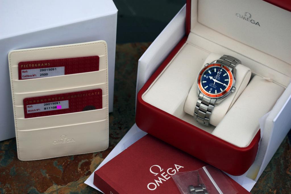 Please note the watch came from factory as 2901.50.91 according to matching cards. This would be a 42mm black bezel version on rubber strap. Previous owner has swapped the bezel with OEM Omega orange one and added bracelet at some point. This would make it a 2209.50.00 reference as presented.