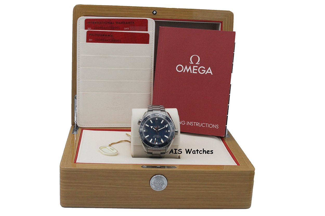 Up for sale is an Omega Seamaster Planet Ocean 600M Co-Axial 232.90.44.22.03.001 GMT 43.5MM Titanium Blue Dial Box & Papers. The timepiece is in excellent condition