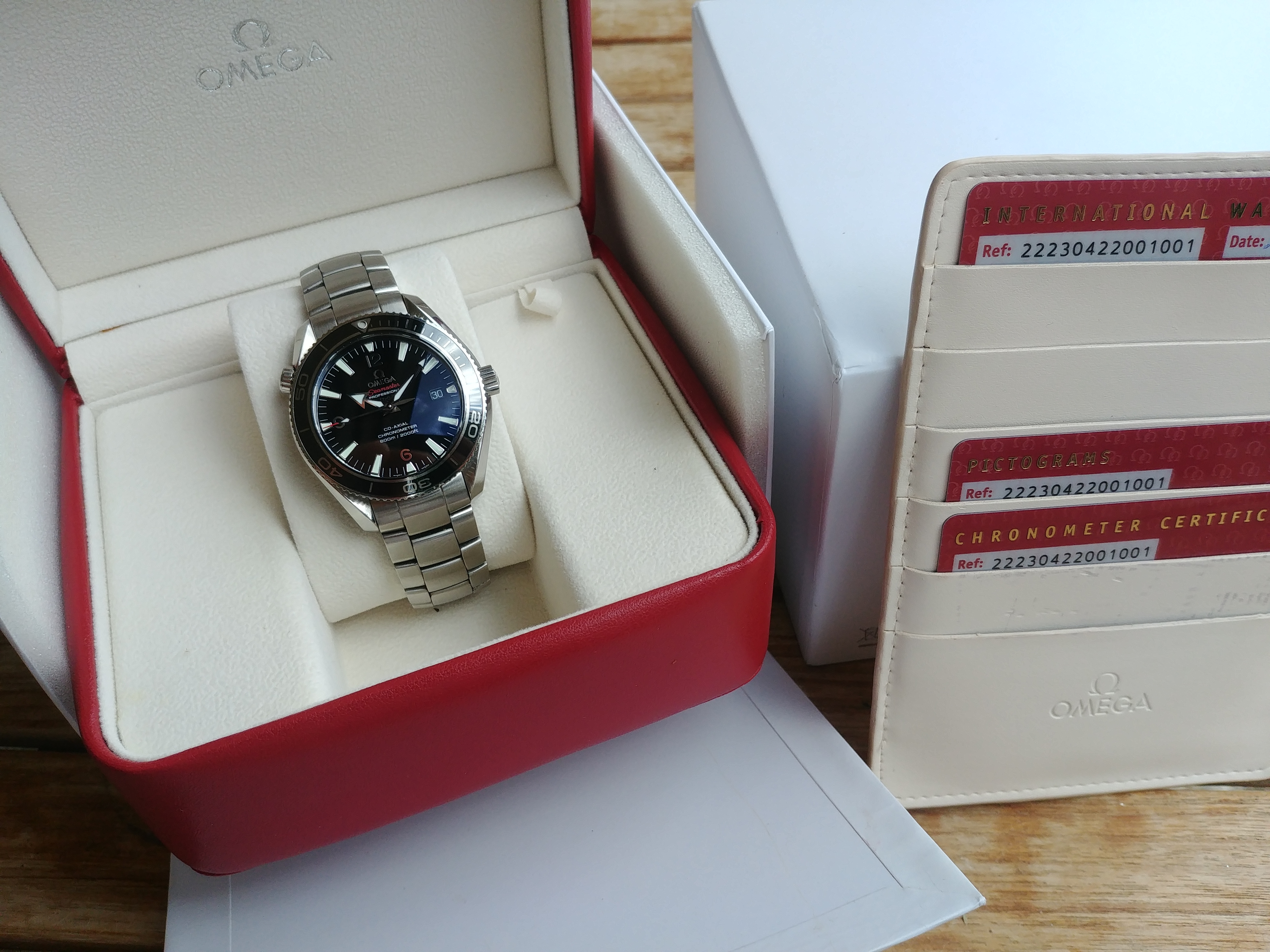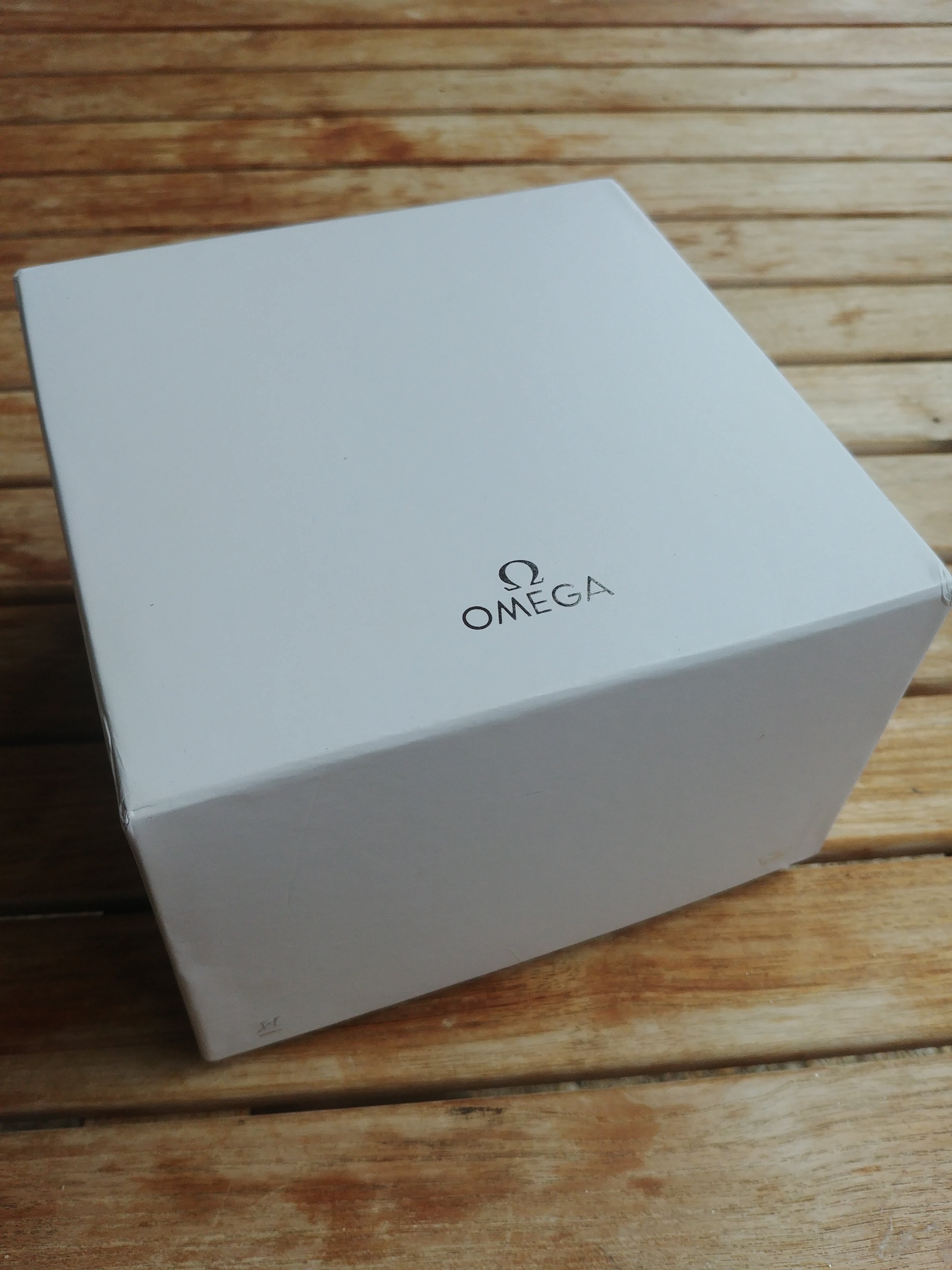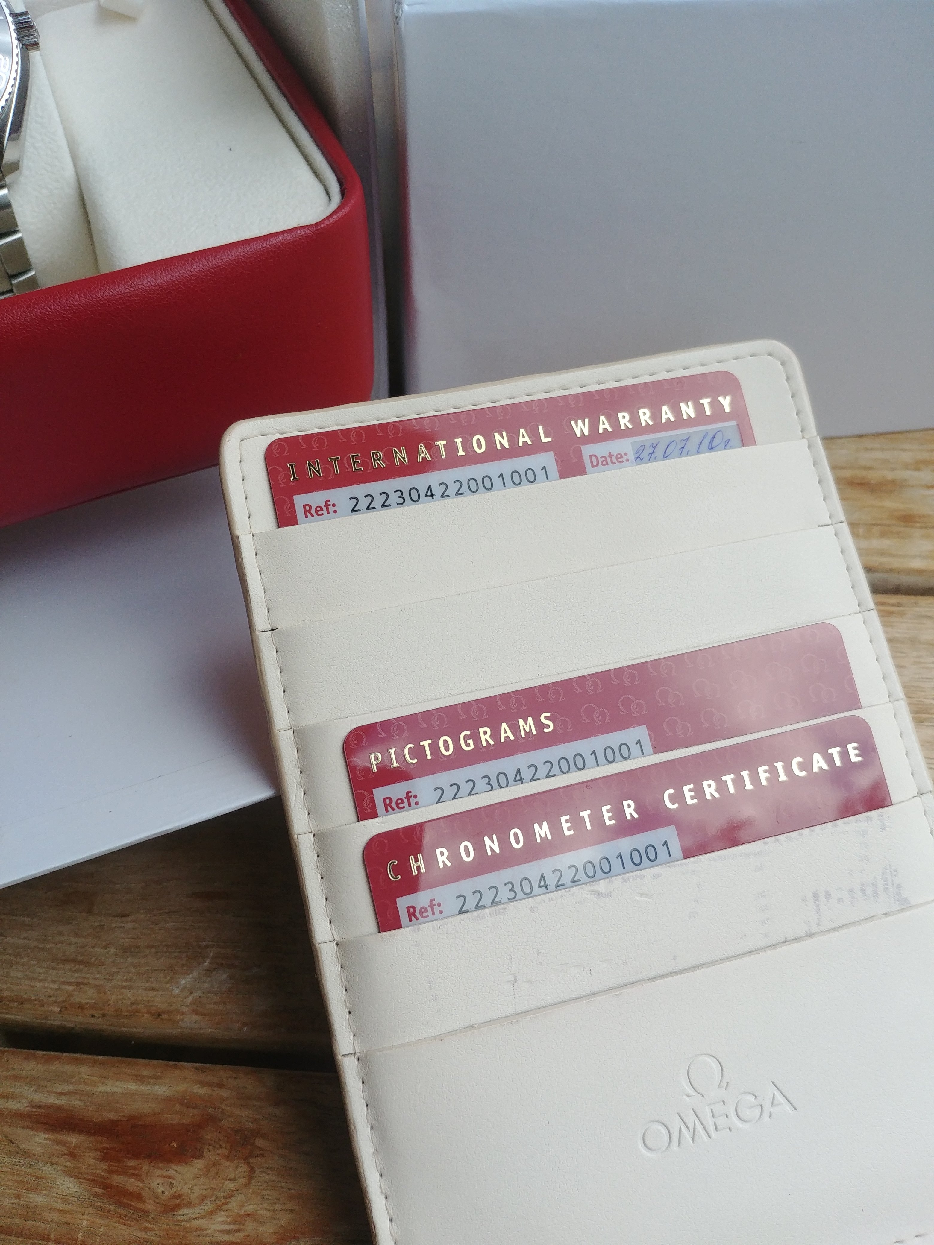It comes with generic Omega Seamaster box and stamped warranty cards.