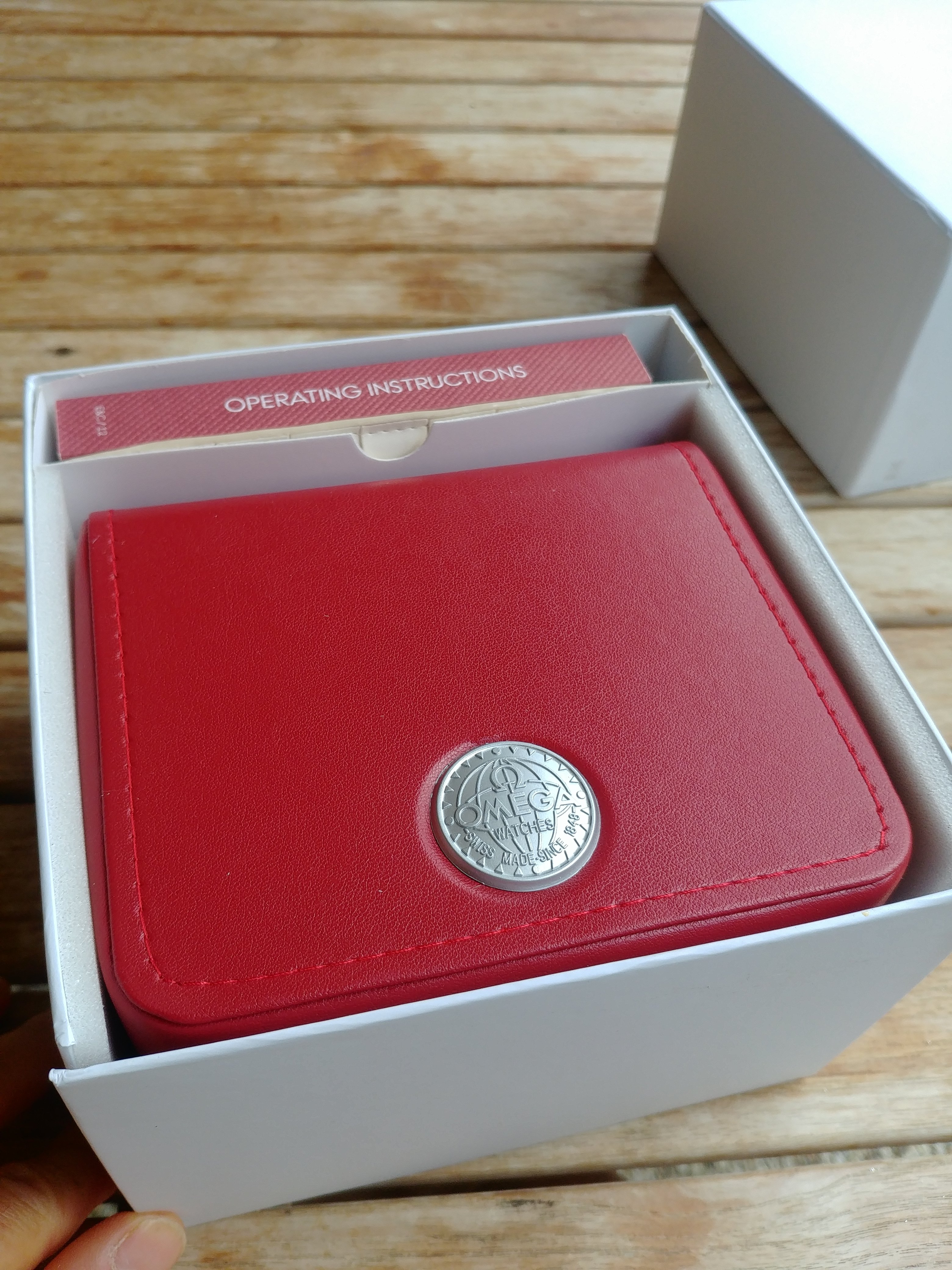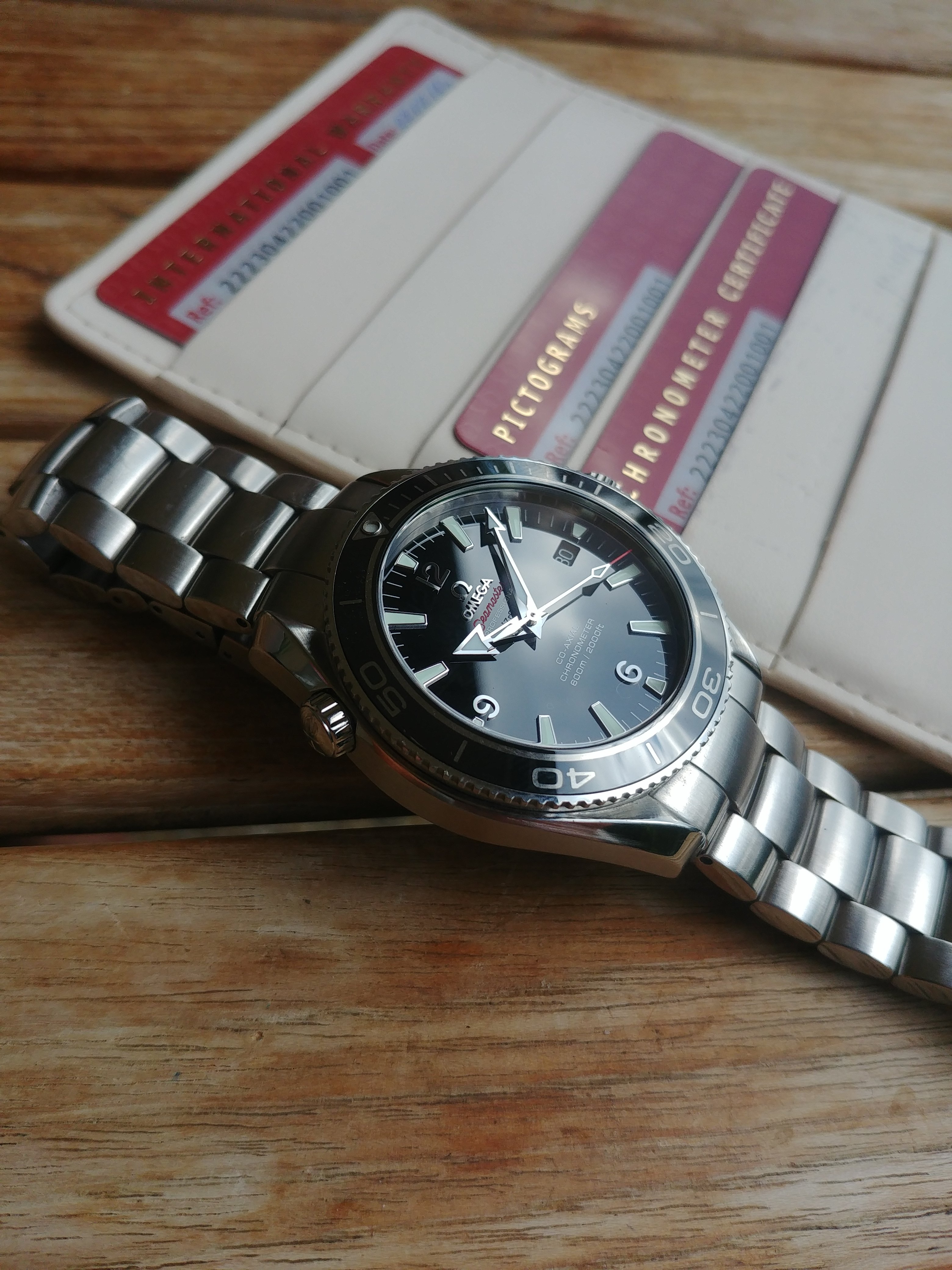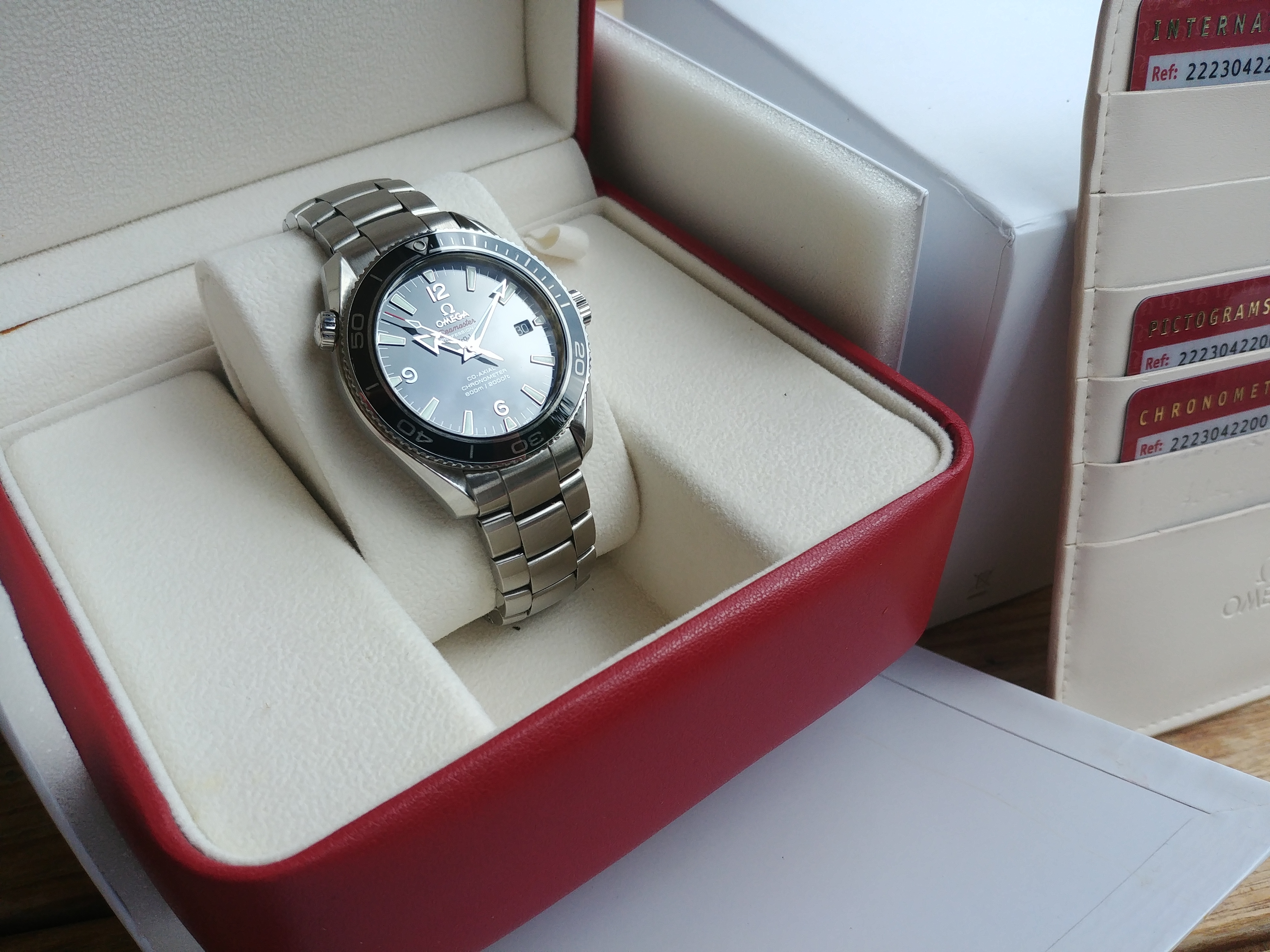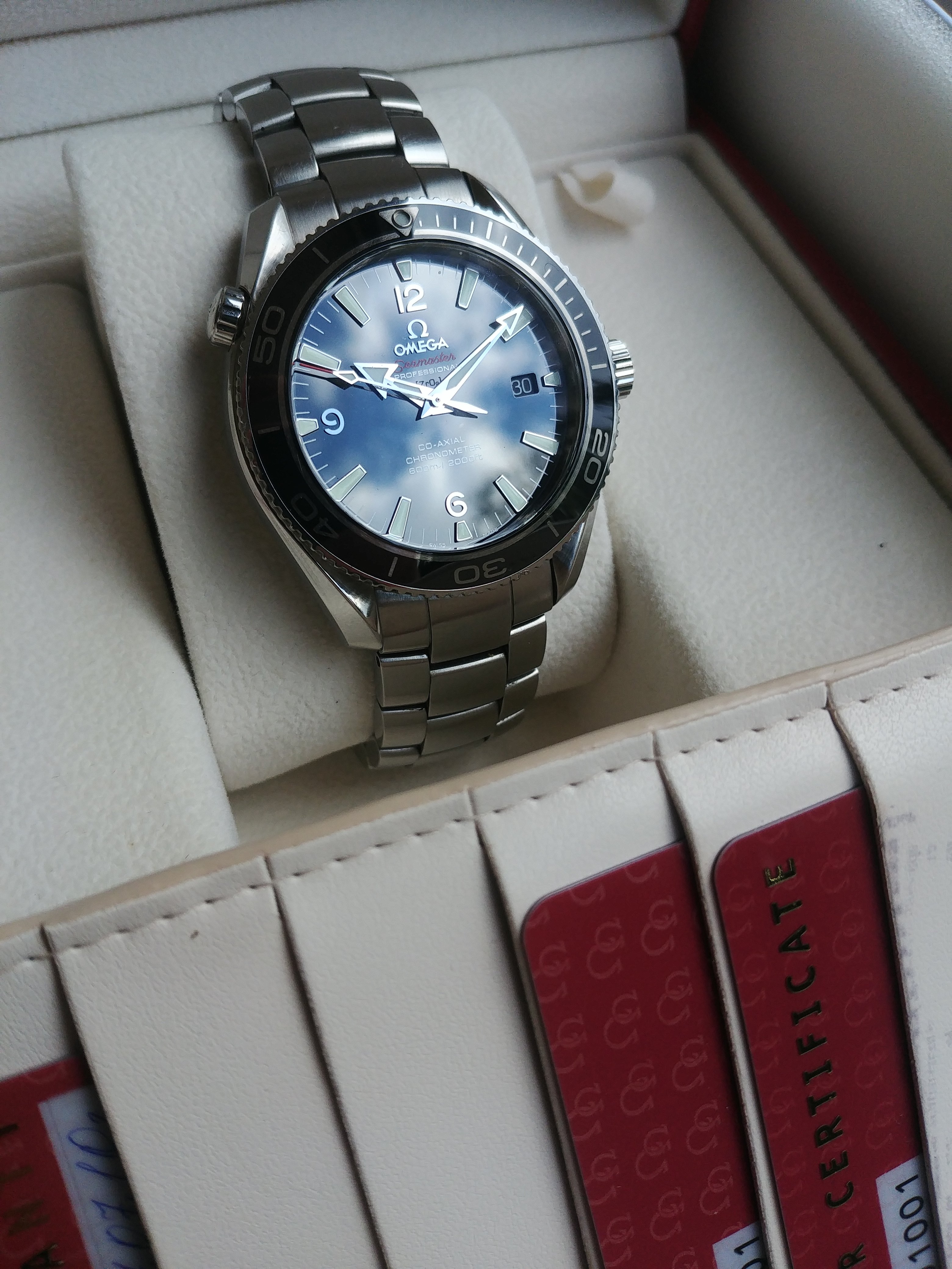 It comes with generic Omega Seamaster box and stamped warranty cards.