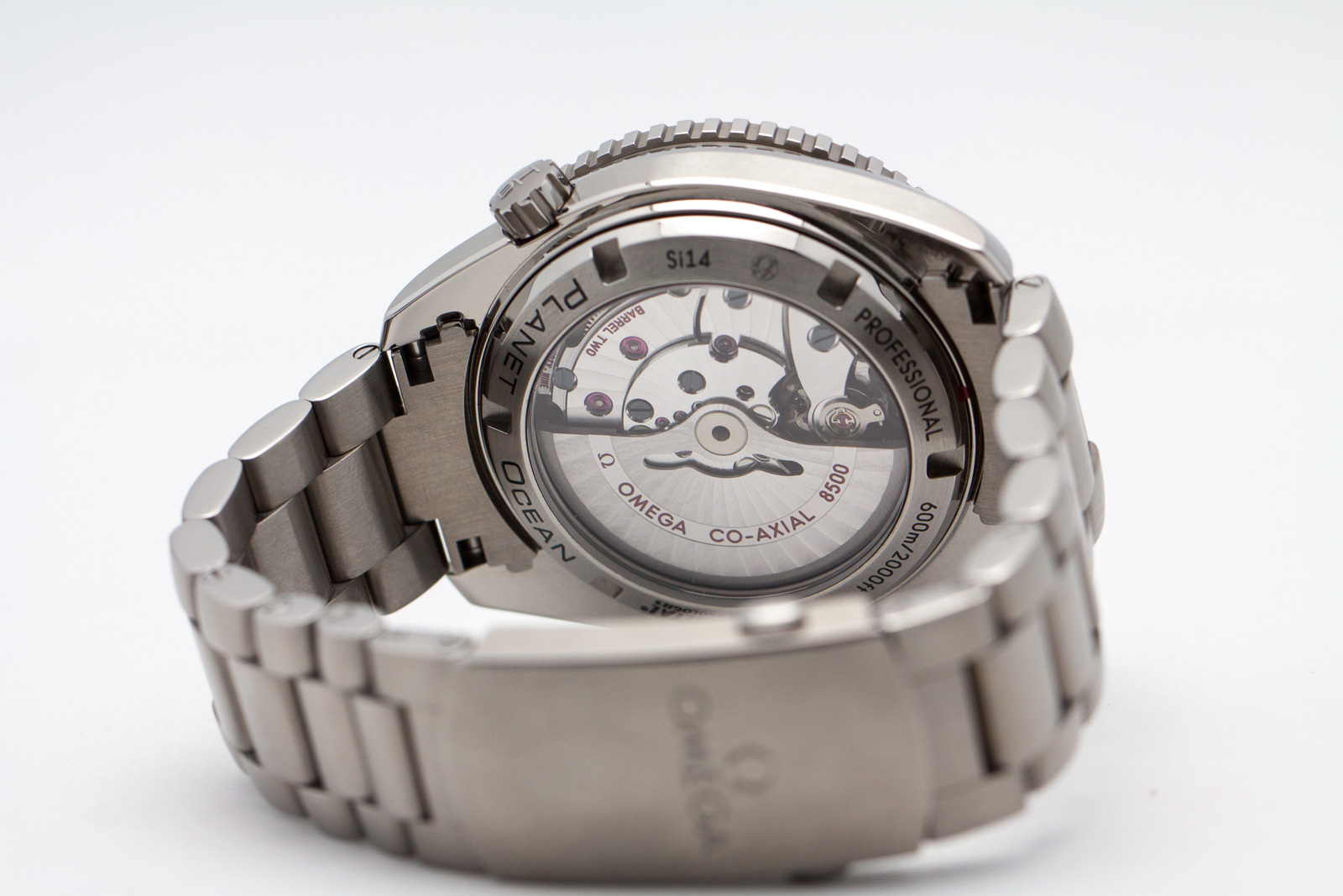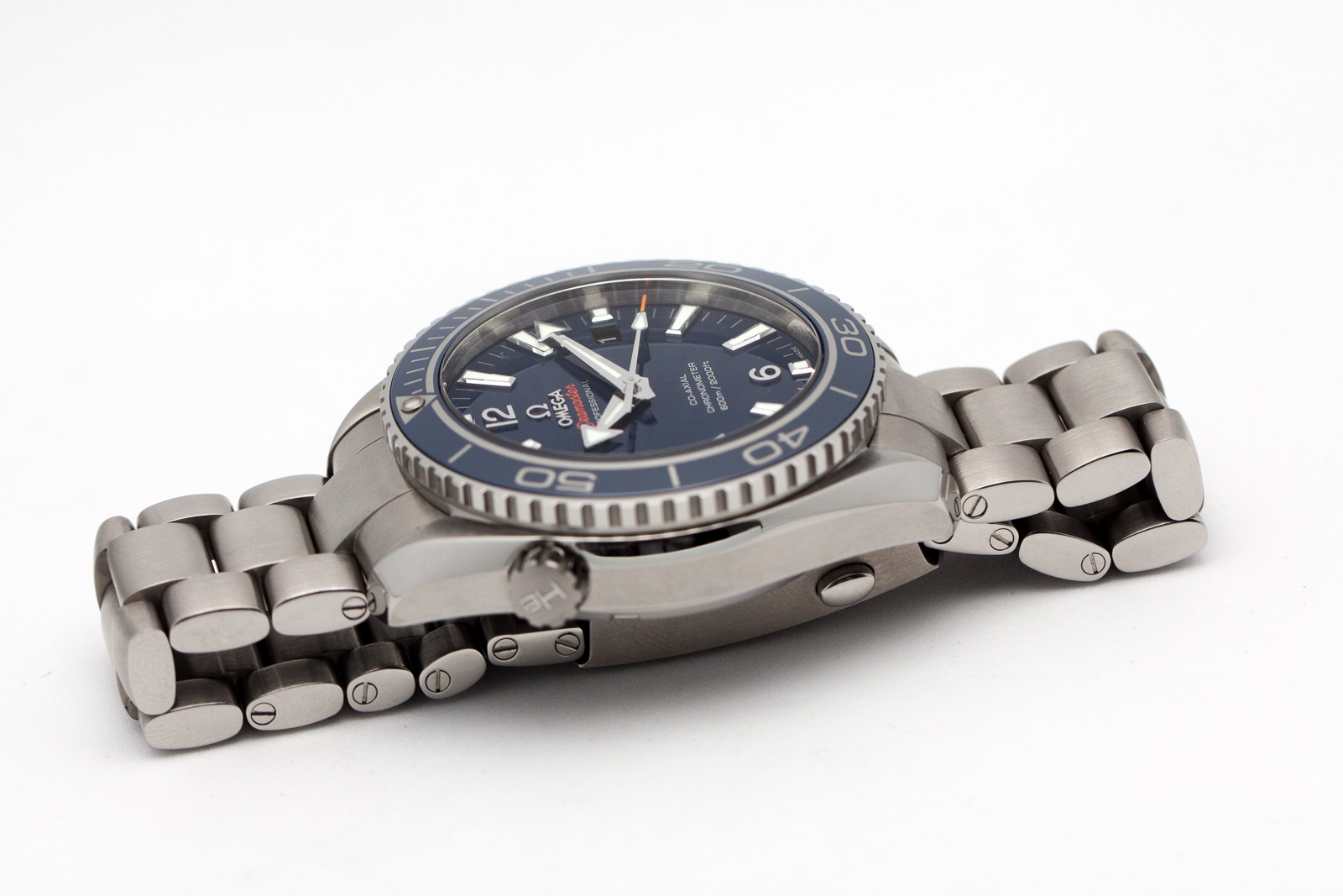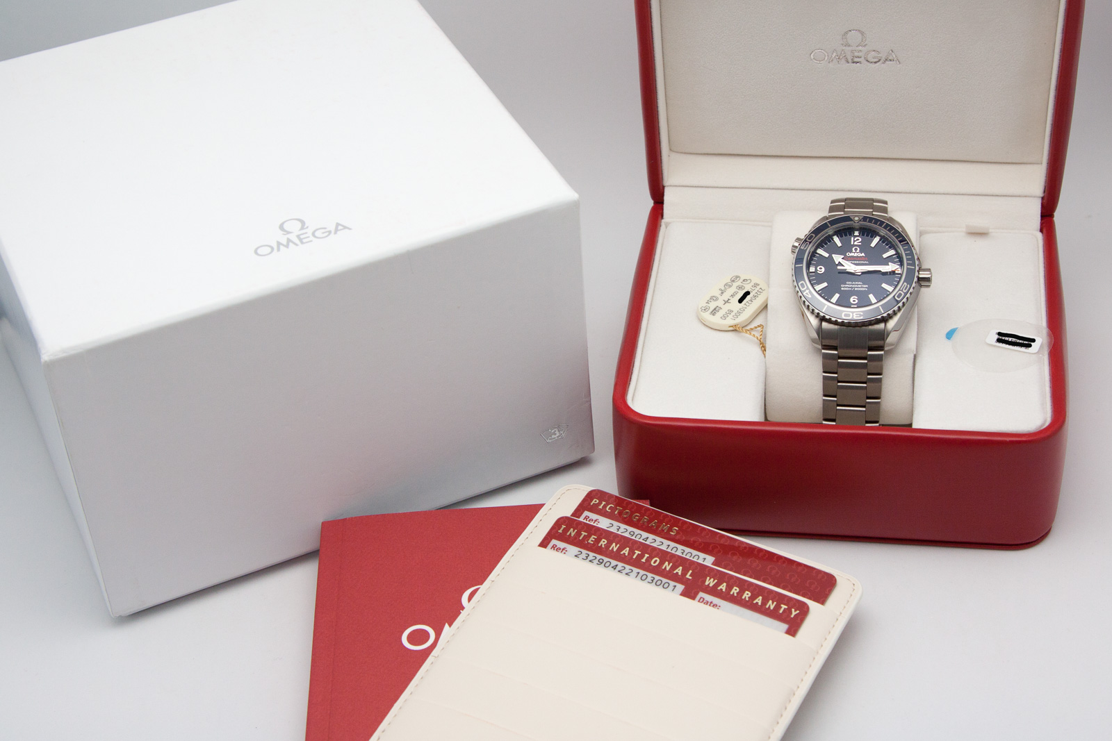 ·Omega Seamaster Planet Ocean 600m Titanium Blue Liquidmetal, reference 232.90.42.21.03.001, 42mm with complete package, including full length Titanium bracelet, hang tag, boxes and Pictogram Card and International Warranty cards (warranty card stamped by Omega AD with matching serials, undated). Domed sapphire crystal is scratch free, bracelet, clasp and watch are all LNIB to MINT. Powered by the 8500 movement with Co-Axial Escapement, free sprung-balance, 2 barrels mounted in series, and automatic winding in both directions to reduce winding time. Bridges and the oscillating mass are decorated with Geneva waves in arabesque and features 60 hour power reserve. This one shows very little to no wear and running perfect. Always accepting trades and buyer on Breitling, Omega, Zenith, IWC, Rolex, Tag, and luxury brands. Item as described or refund minus shipping.