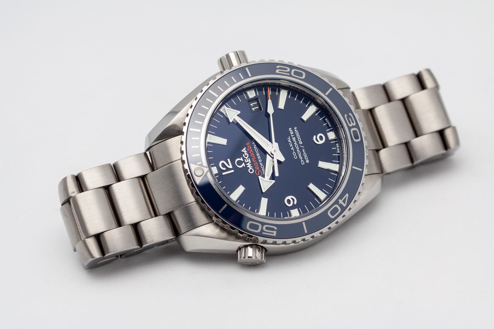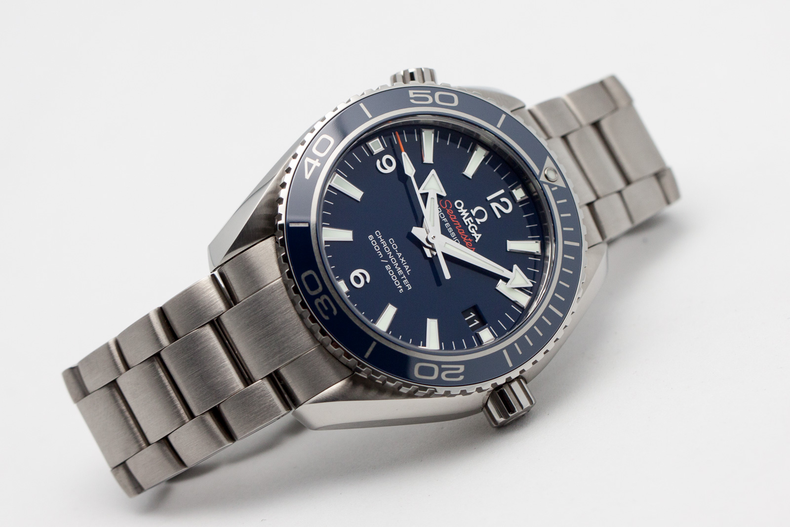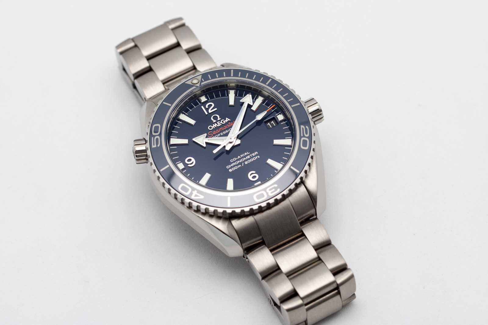 ·Omega Seamaster Planet Ocean 600m Titanium Blue Liquidmetal, reference 232.90.42.21.03.001, 42mm with complete package, including full length Titanium bracelet, hang tag, boxes and Pictogram Card and International Warranty cards (warranty card stamped by Omega AD with matching serials, undated). Domed sapphire crystal is scratch free, bracelet, clasp and watch are all LNIB to MINT. Powered by the 8500 movement with Co-Axial Escapement, free sprung-balance, 2 barrels mounted in series, and automatic winding in both directions to reduce winding time. Bridges and the oscillating mass are decorated with Geneva waves in arabesque and features 60 hour power reserve. This one shows very little to no wear and running perfect. Always accepting trades and buyer on Breitling, Omega, Zenith, IWC, Rolex, Tag, and luxury brands. Item as described or refund minus shipping.