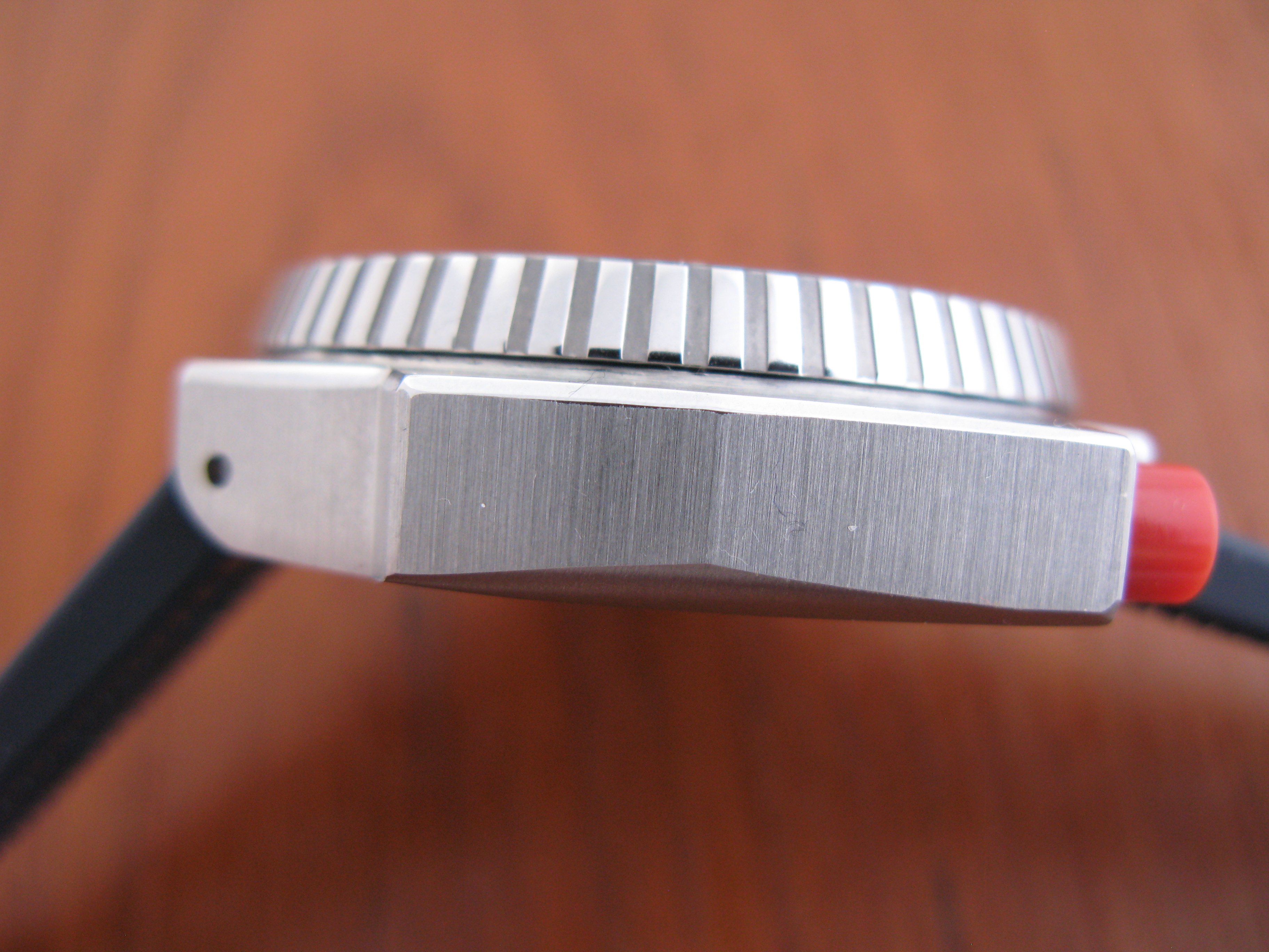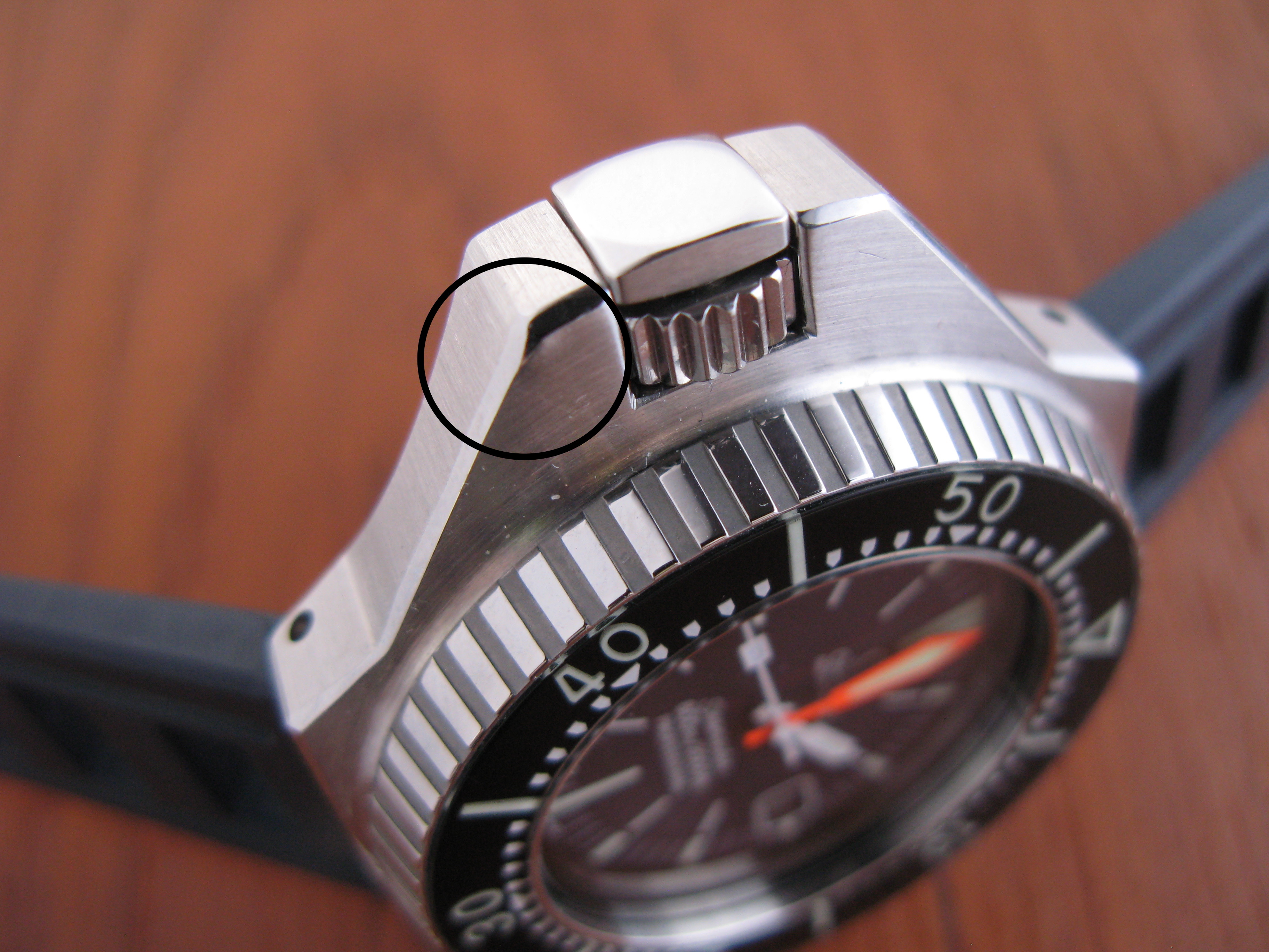 The case is in good condition and looks very sharp. It has a small ding on the crown protecting lug below the crown which is noticeable and I have circled in one of the pictures as it does not photograph easily