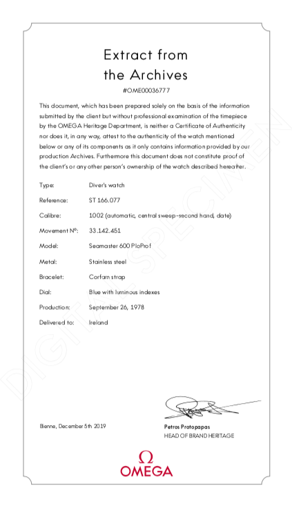 The watch comes with Service receipt from Omega for over £1000 and the Omega 2 year warranty. It also comes with an Extract from the Archives verifying its age and correctness