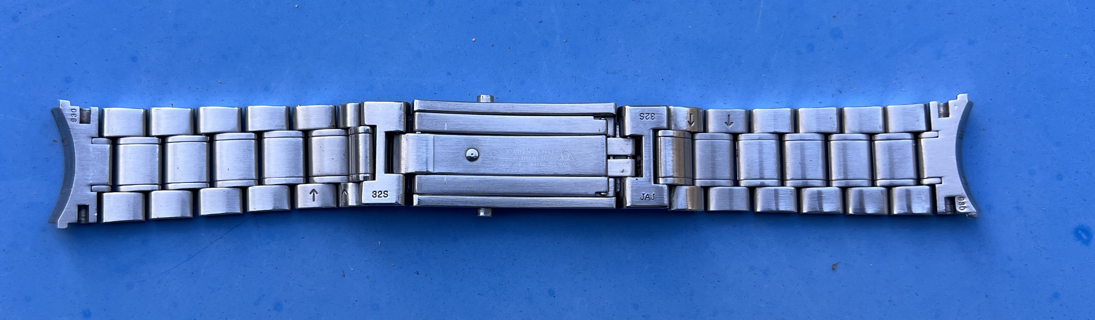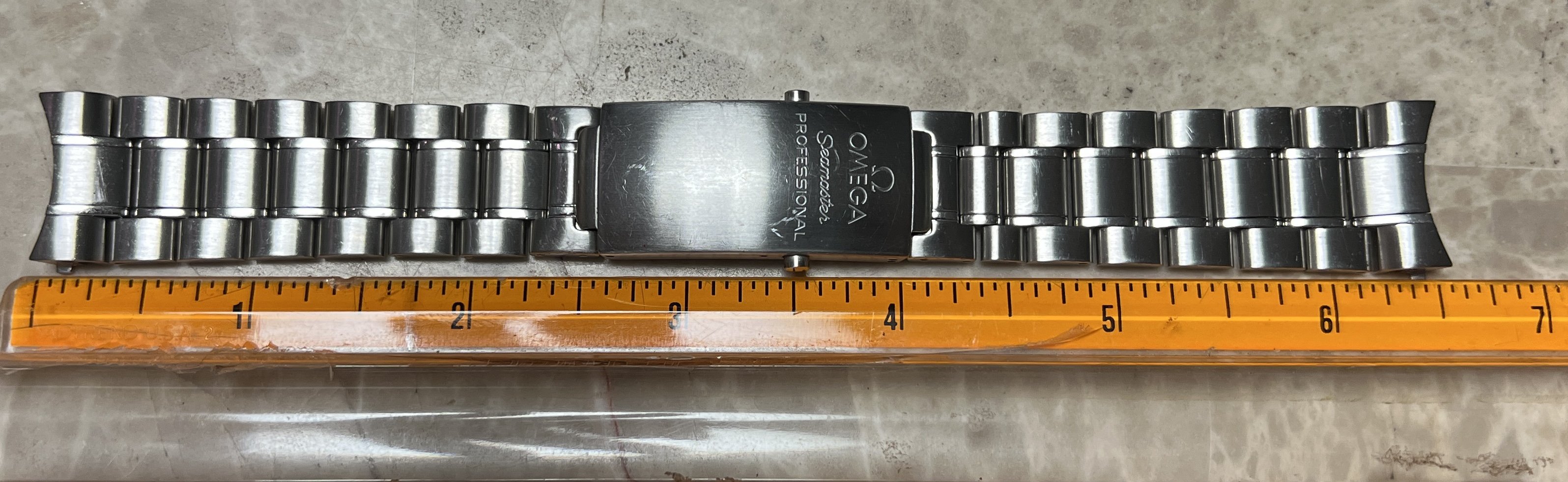 1- Good conditions 20 MM Omega Speedmaster style bracelet, reference 1610/930 which measures approximately 6 9/16 inches so should fit at least a 7 1/4 inch wrist when installed on the watch head. Bracelet has some swirls and marks as shown and moderate stretch.