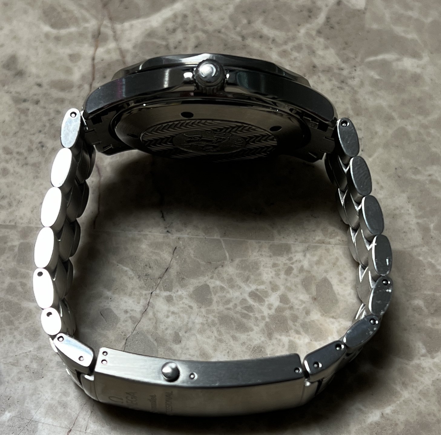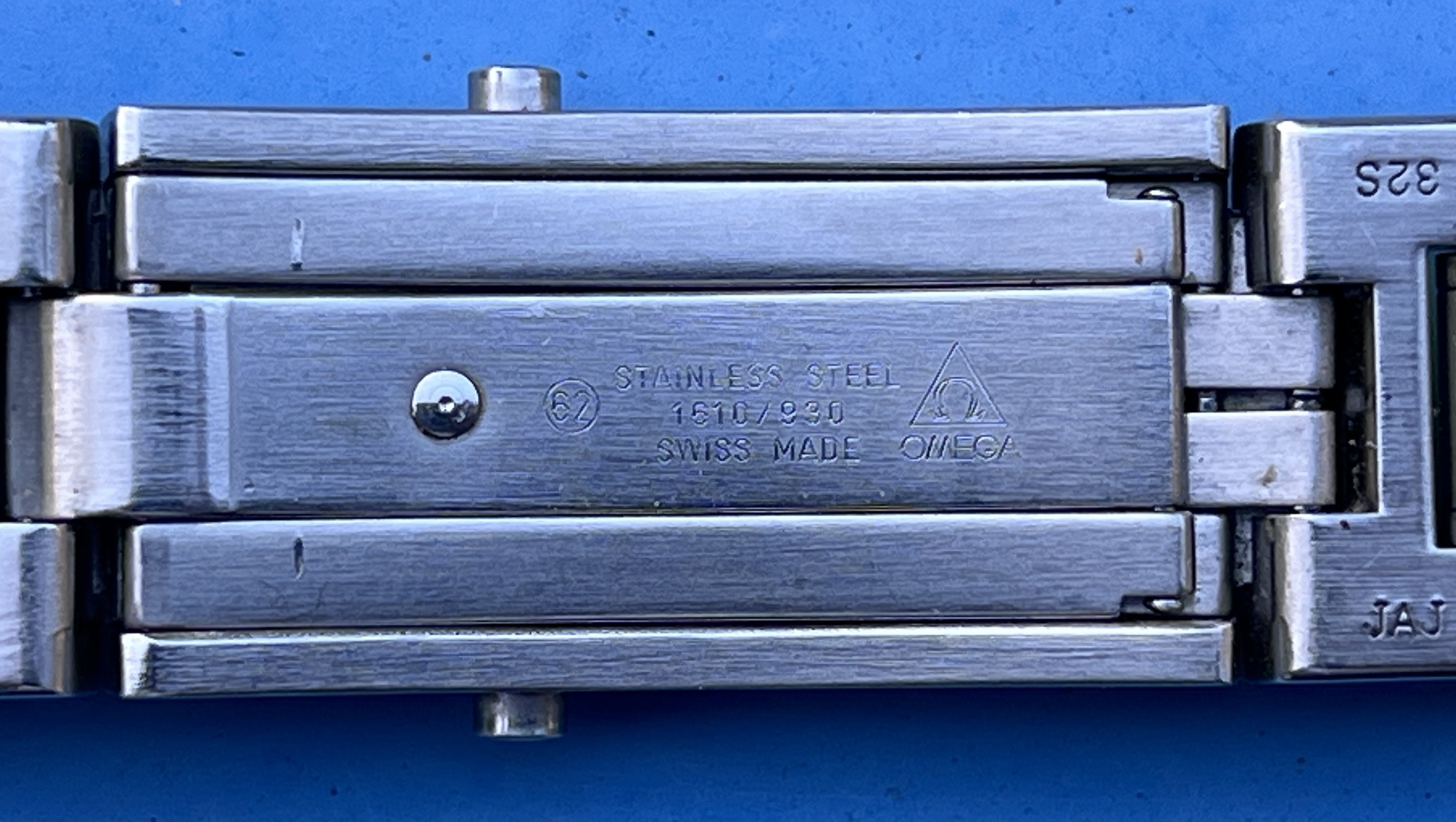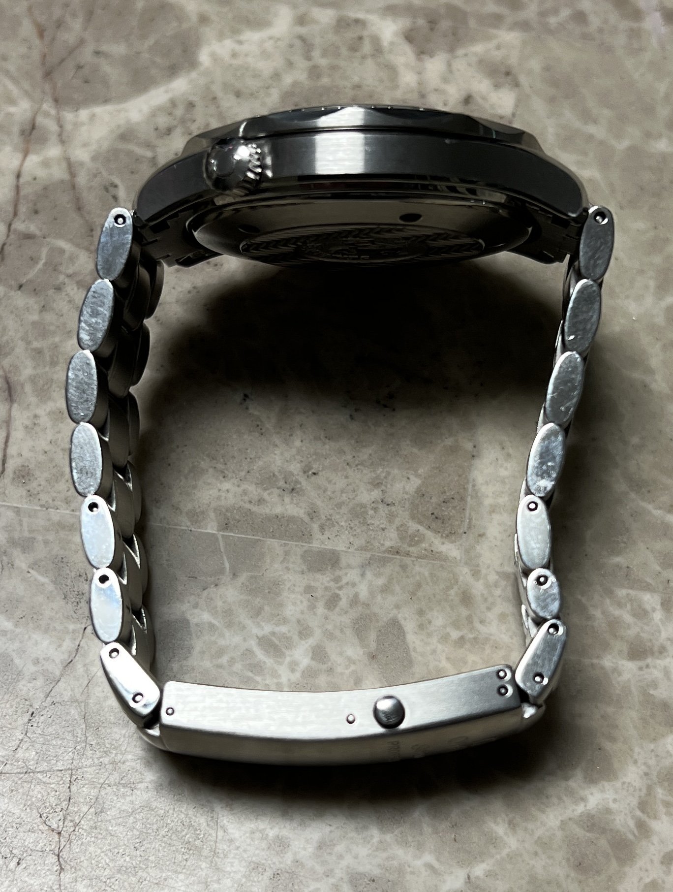 The case has brushed sides with contrasting polished case top and the black dial has a beautiful green lume as shown. The hand set is brand new and have green lume as well (shown on the pictures below); the sapphire crystal is in very good conditions. The watch runs on the trustworthy Omega caliber 1120 movement; don’t have any records of its last maintenance, but on my timegrapher, when facing up, the watch is running at -3 seconds with an amplitude of 245 and beat error of 0.0s. The watch head is in good conditions; few swirls and small marks as shown. The rotating bezel and white gold bezel insert have a few marks as shown. The back of the case shows some scratches from previous bracelet changes (not visible when wearing the watch; could be polished if desired).