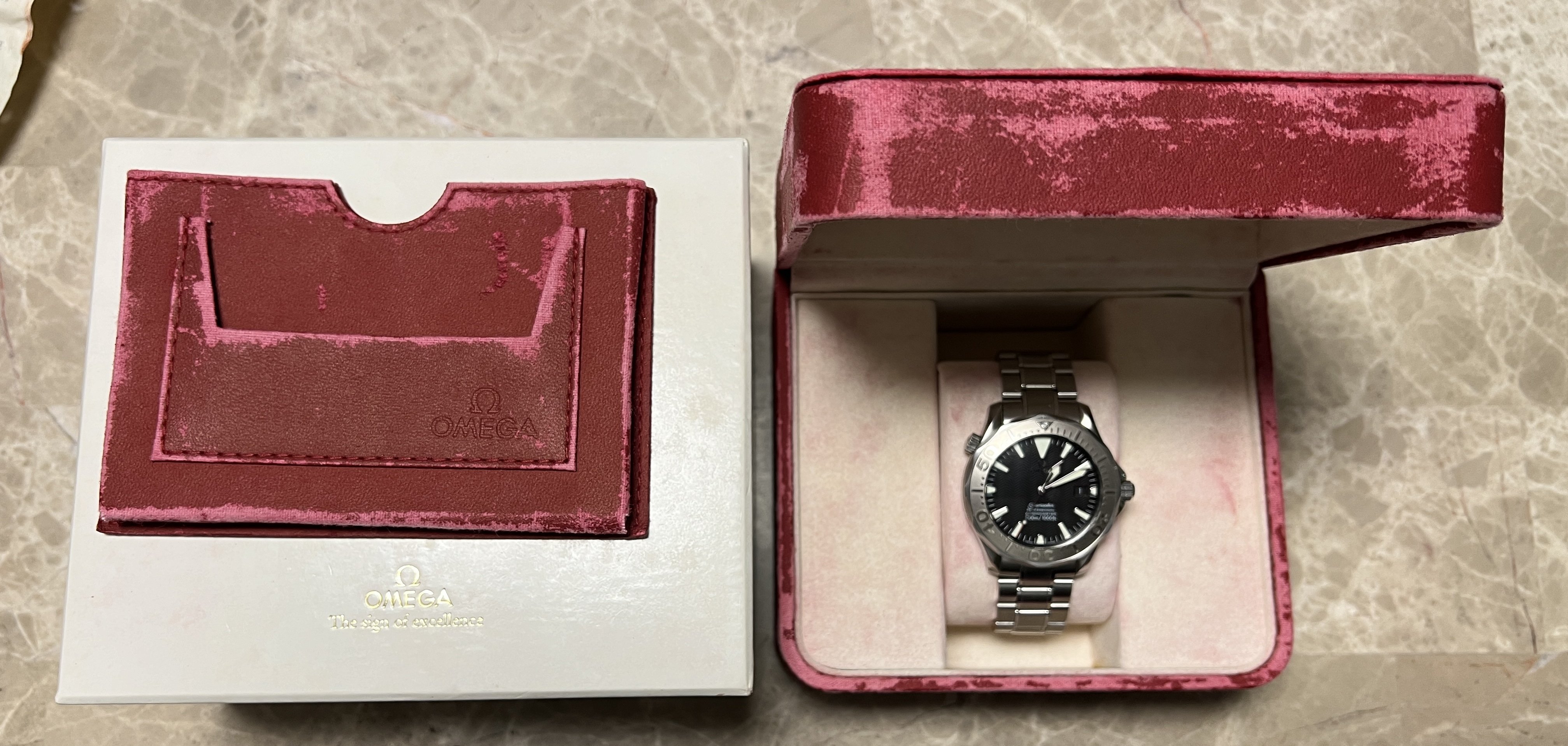 2- Omega genuine box set which includes outer white box, inner red box, watch holding pillow and card wallet (red box is deteriorated as shown, very common on used watches from this era)