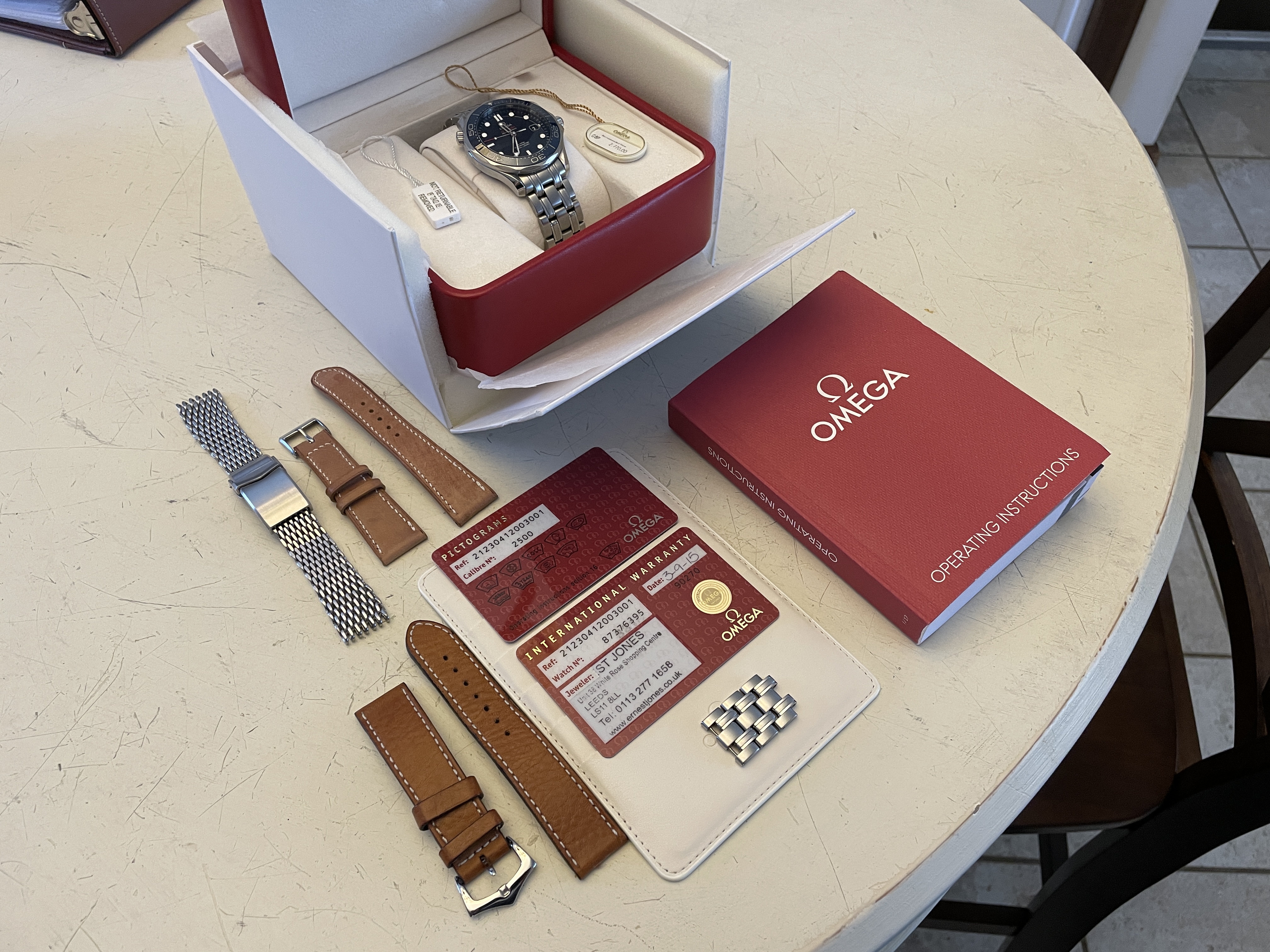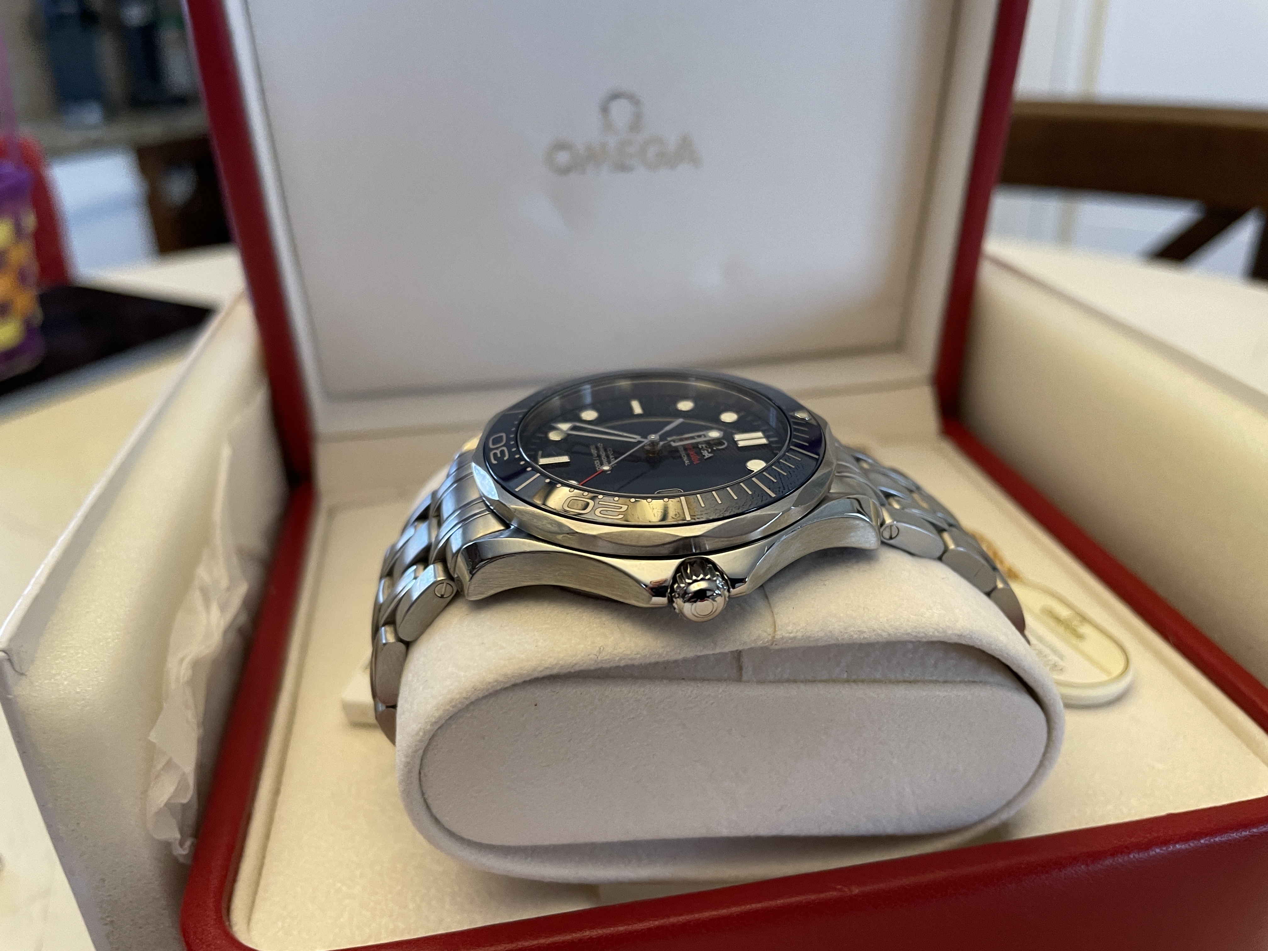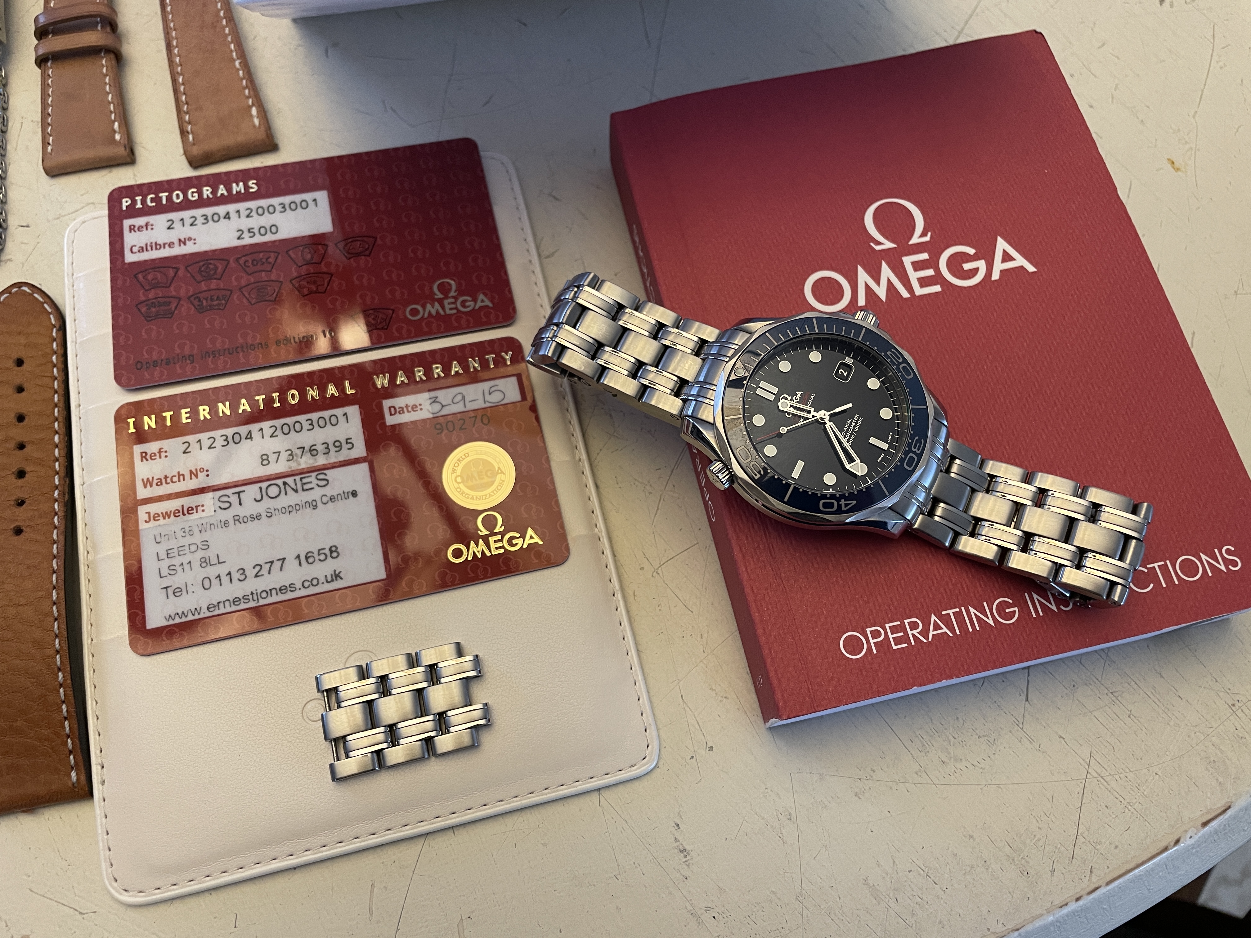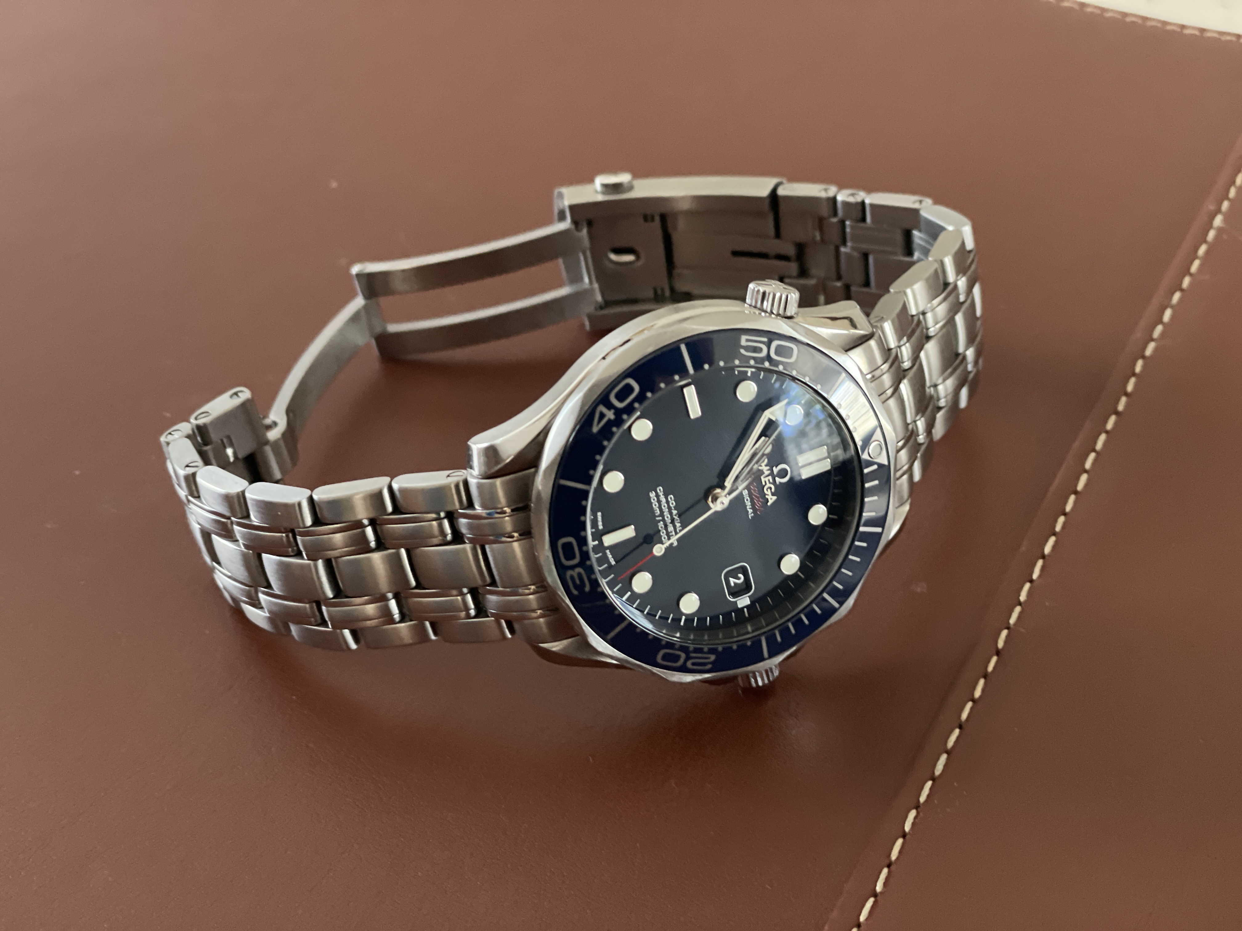 ·Up for sale is the Omega Seamaster Pro 300M SMPc Blue Bond Ceramic 41mm CoAxial complete with box and papers. OEM box, OEM outer white box, OEM pictogram, OEM warranty card, OEM hang tag, OEM instructional booklet. This also comes with bonus leather straps and mesh bracelet as a free gift.