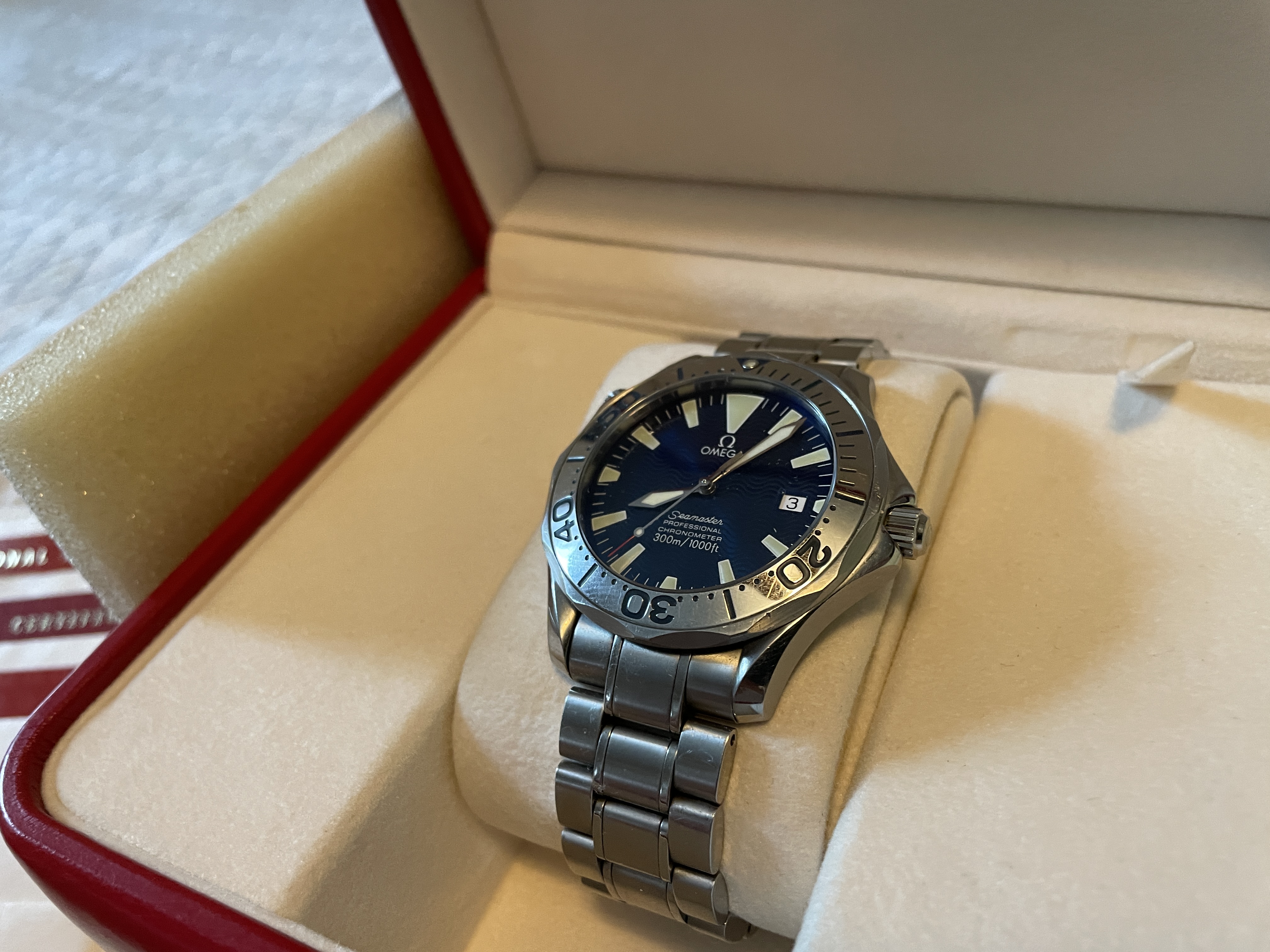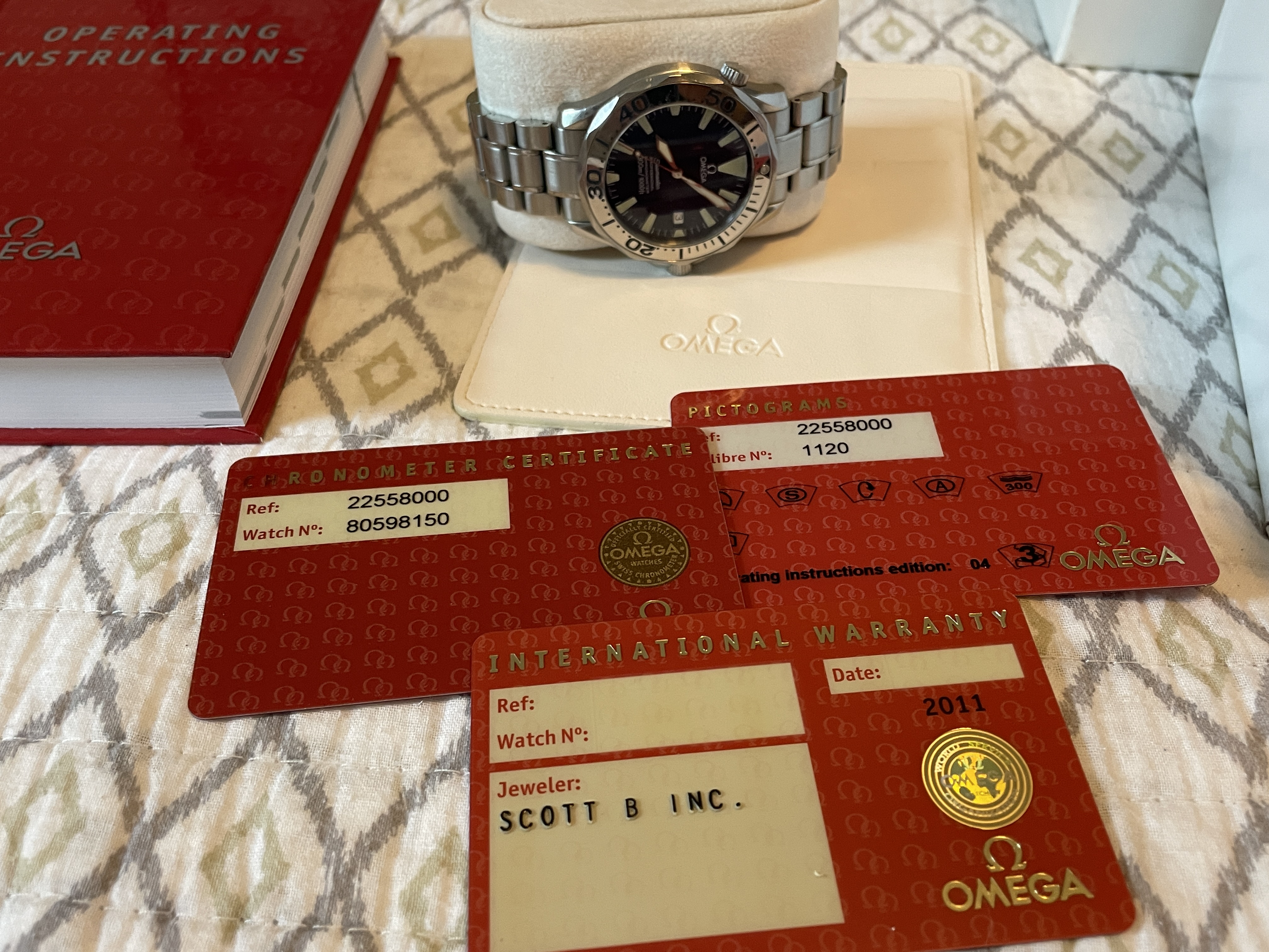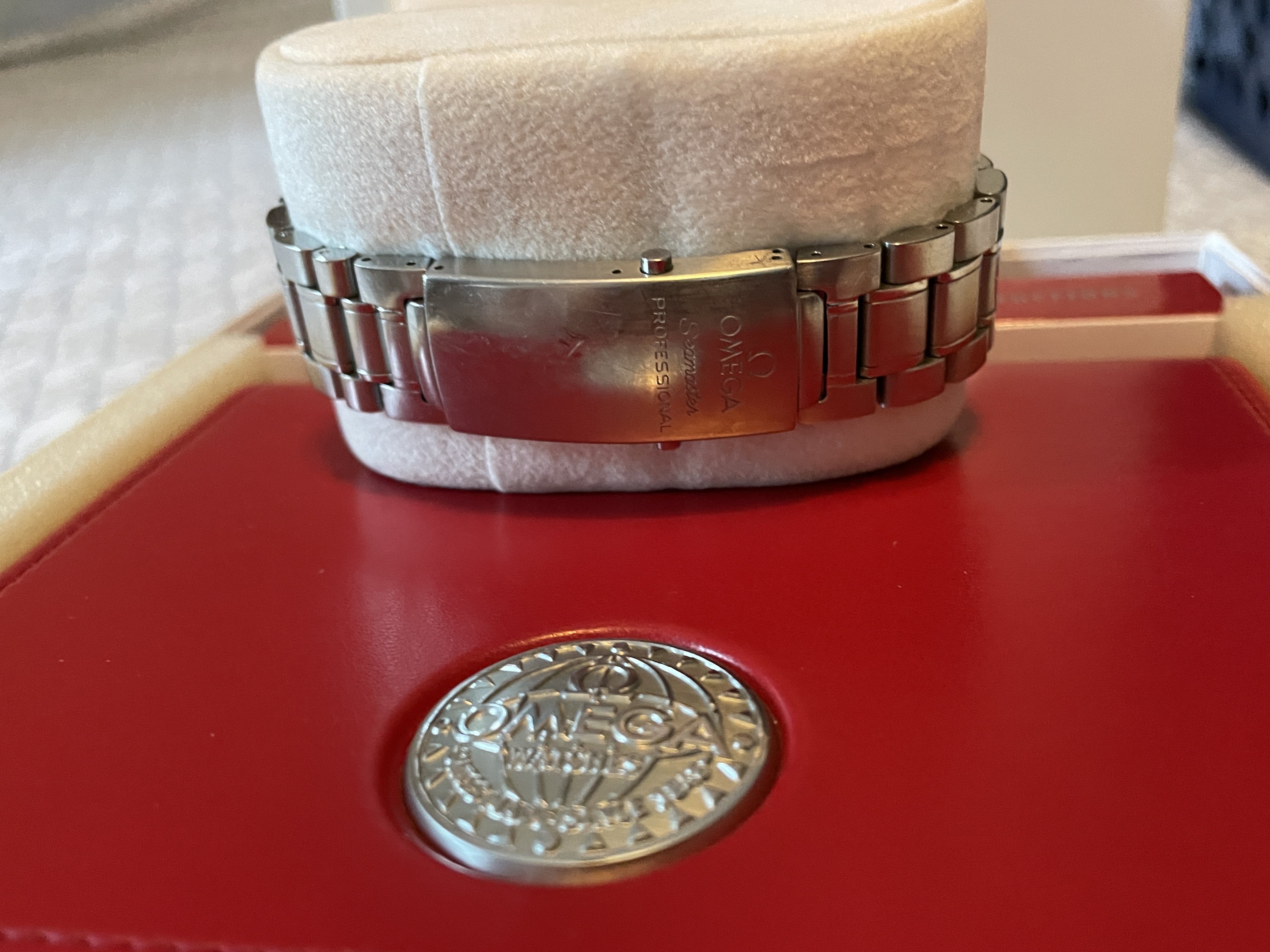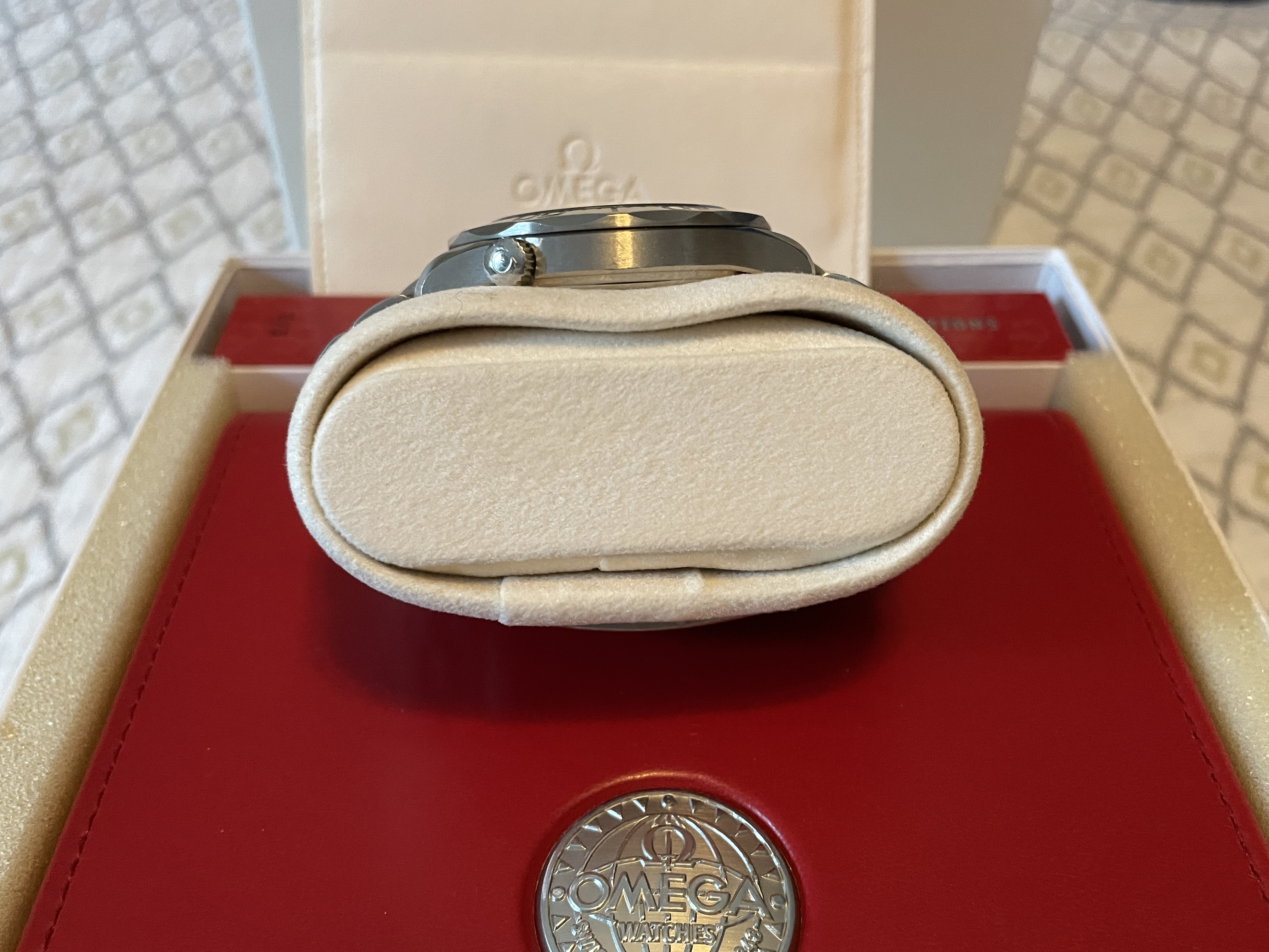 The watch comes complete with all three red OEM omega cards, OEM box, OEM white box, OEM instruction manual. The condition of the watch shows signs of regular use, light swirls on the clasp from desk diving. There are no cracks on the sapphire, it looks beautiful in person!