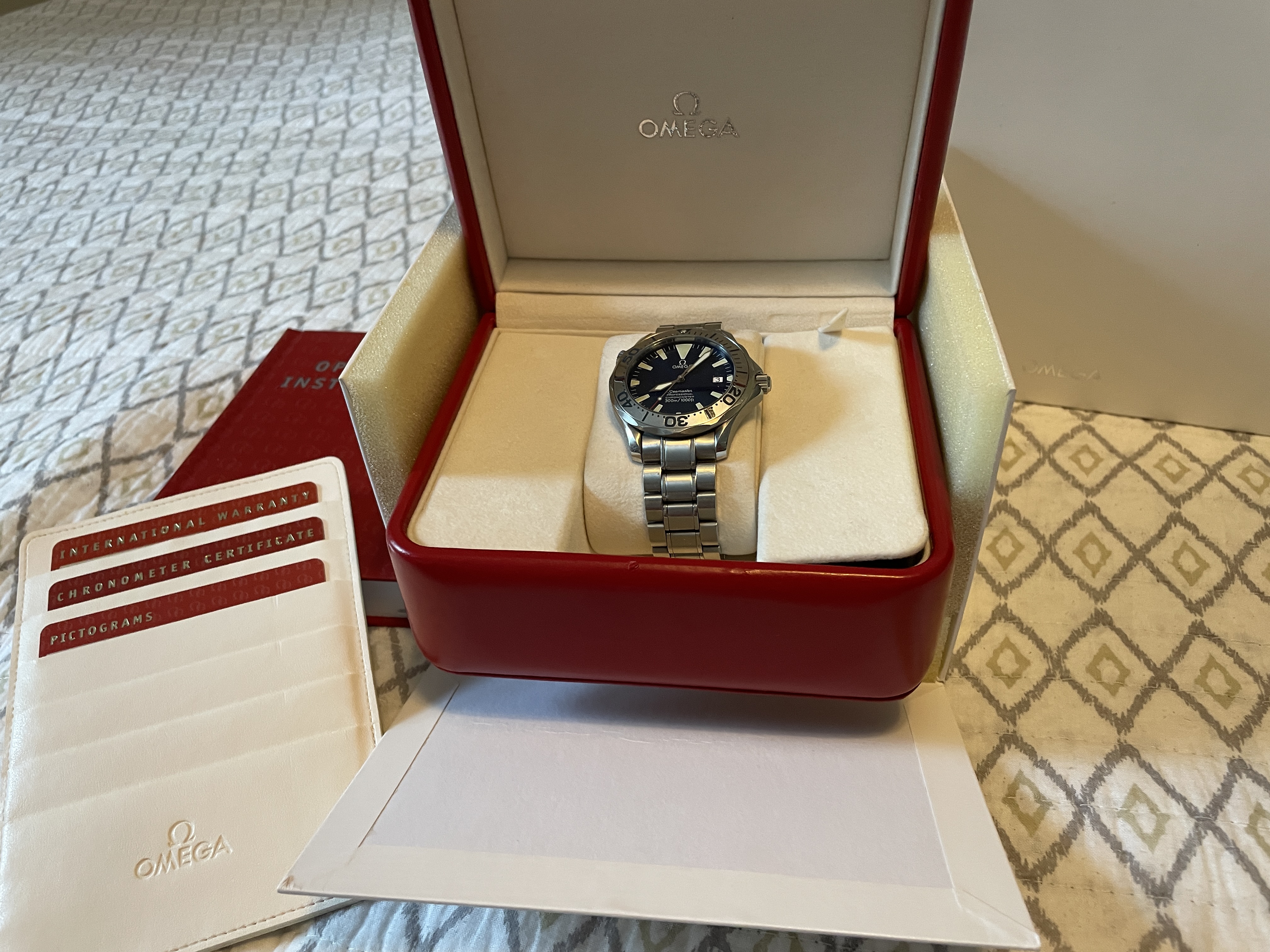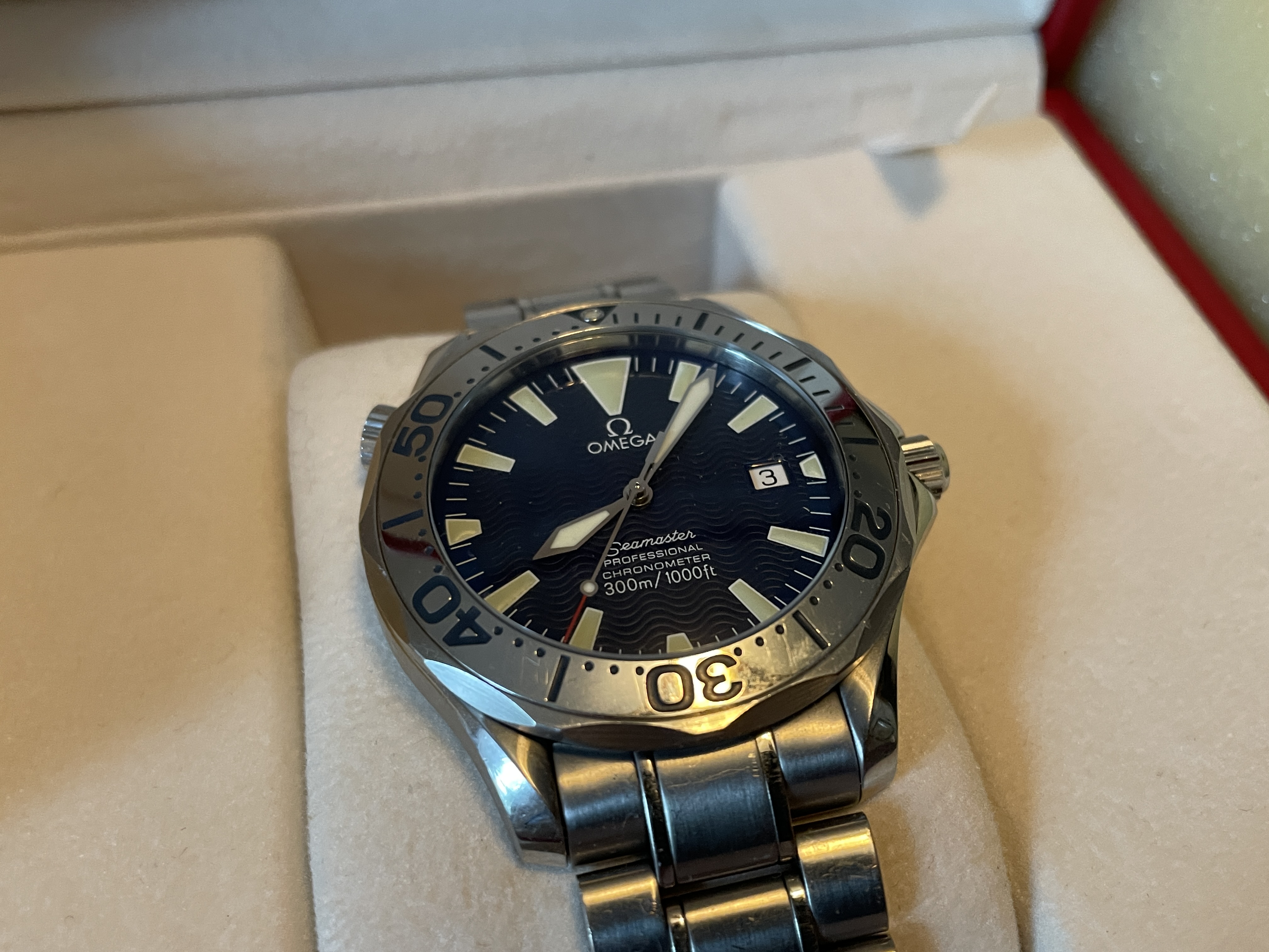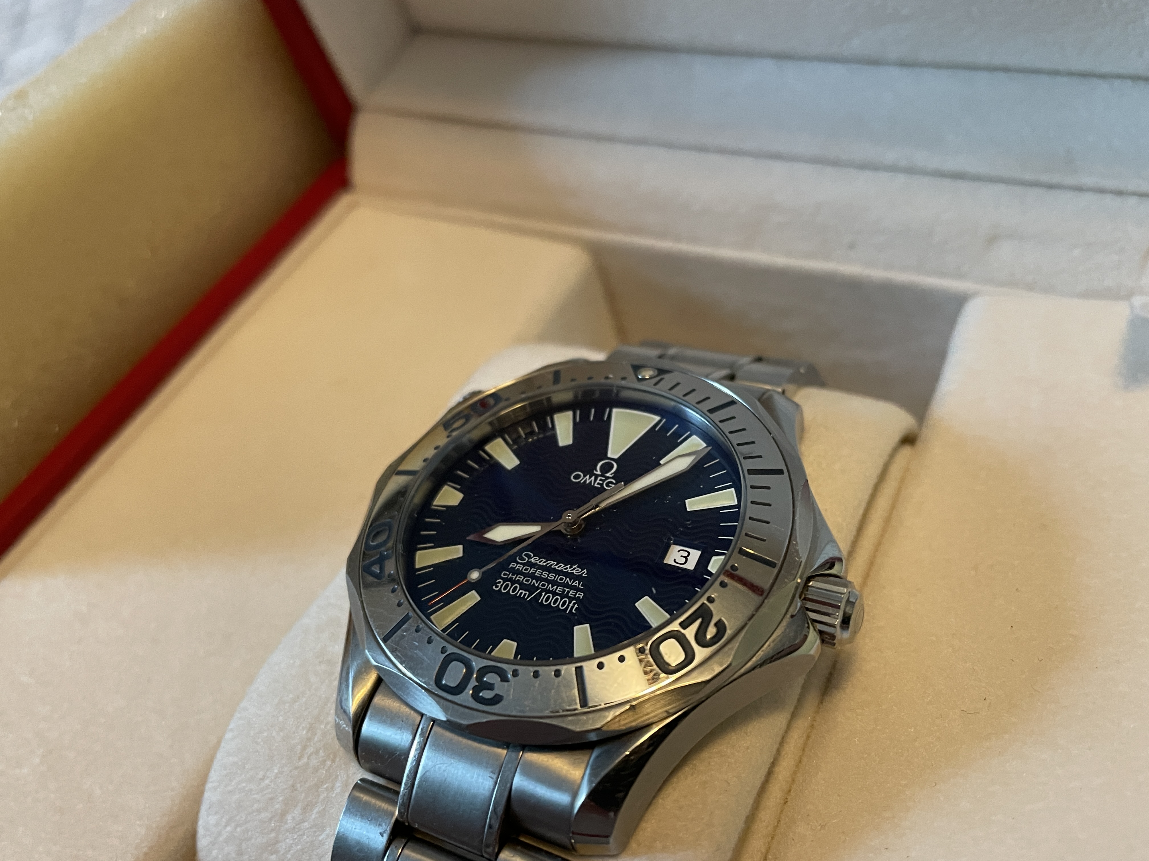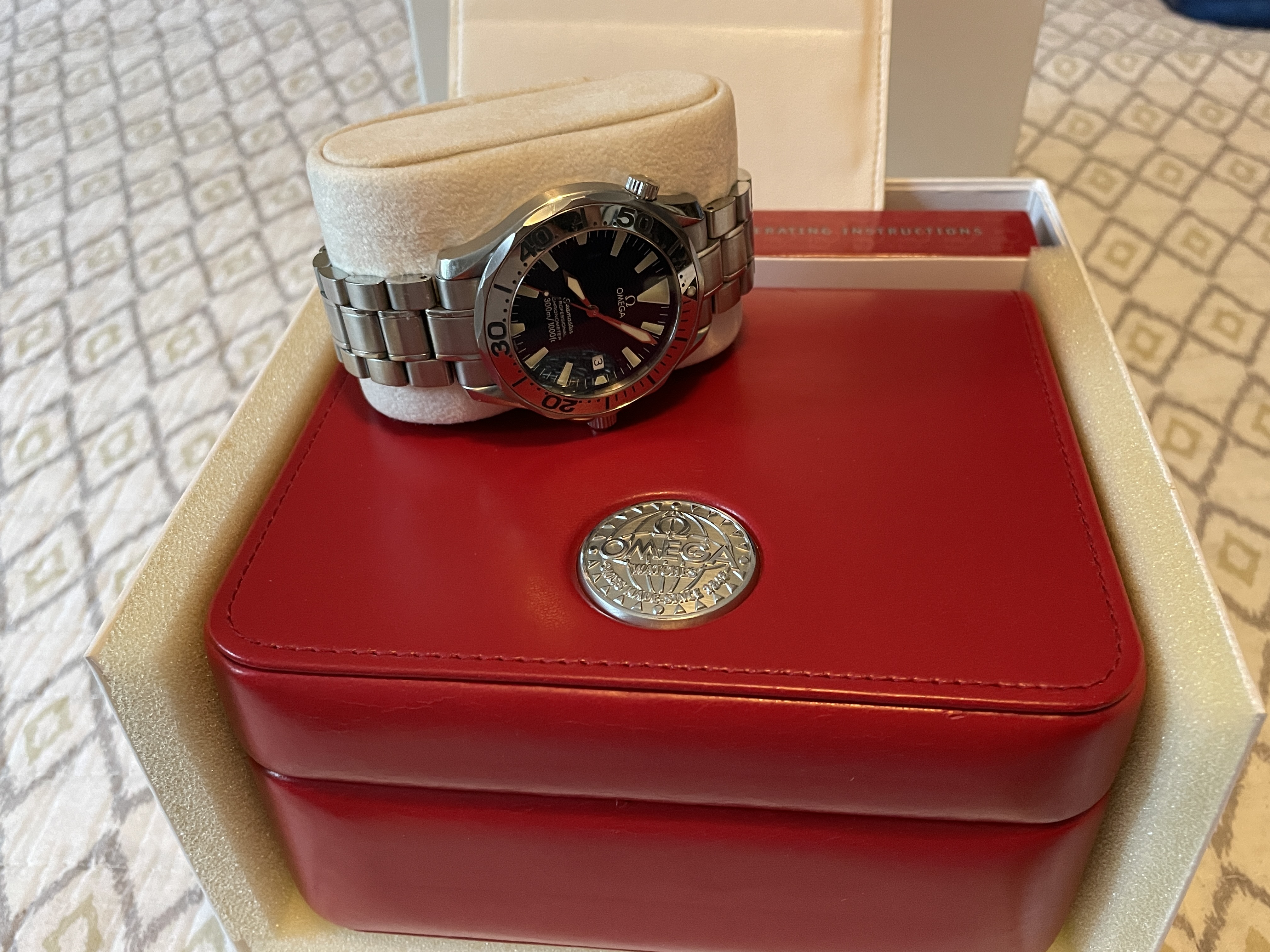 The watch comes complete with all three red OEM omega cards, OEM box, OEM white box, OEM instruction manual. The condition of the watch shows signs of regular use, light swirls on the clasp from desk diving. There are no cracks on the sapphire, it looks beautiful in person!