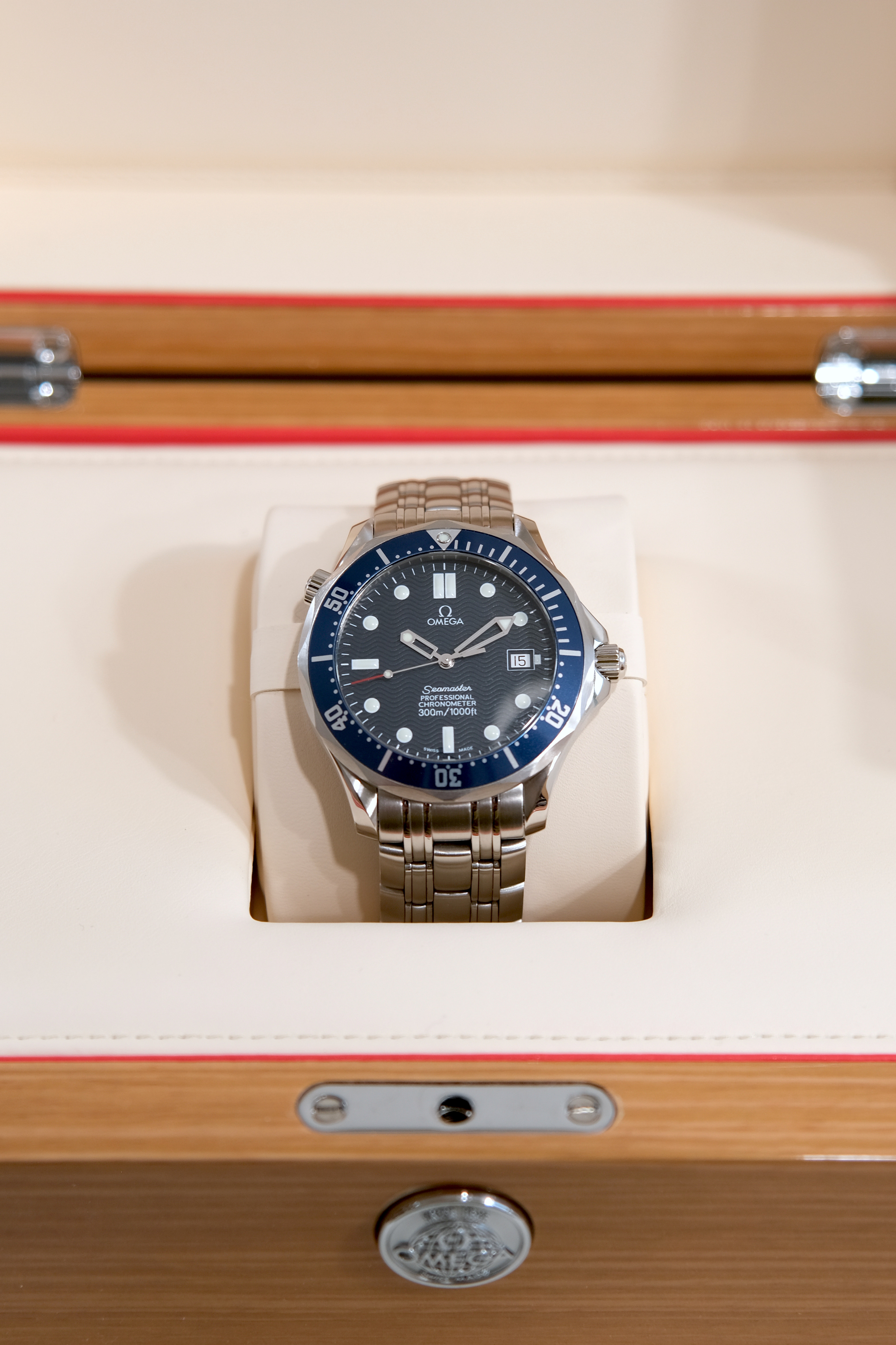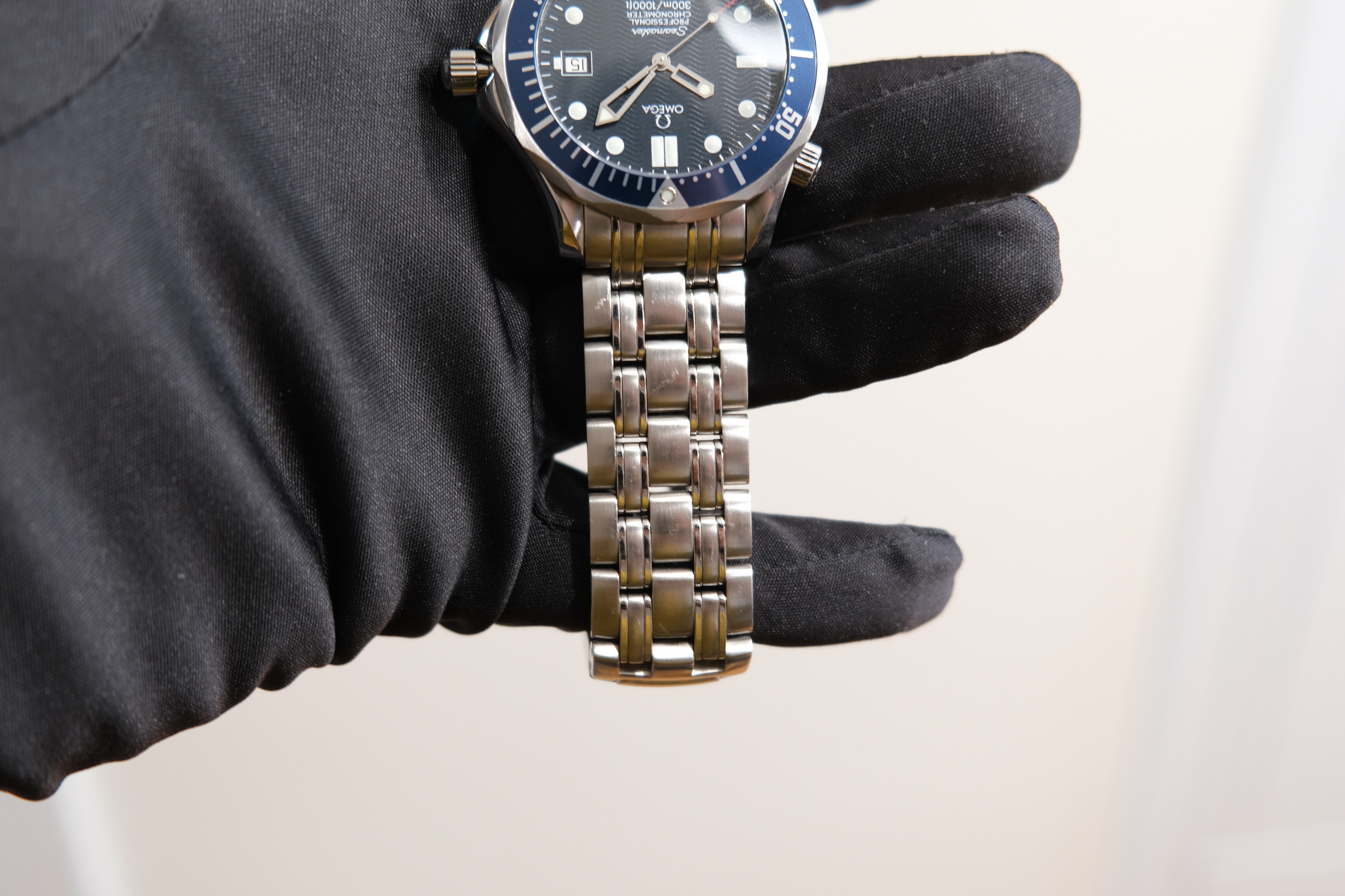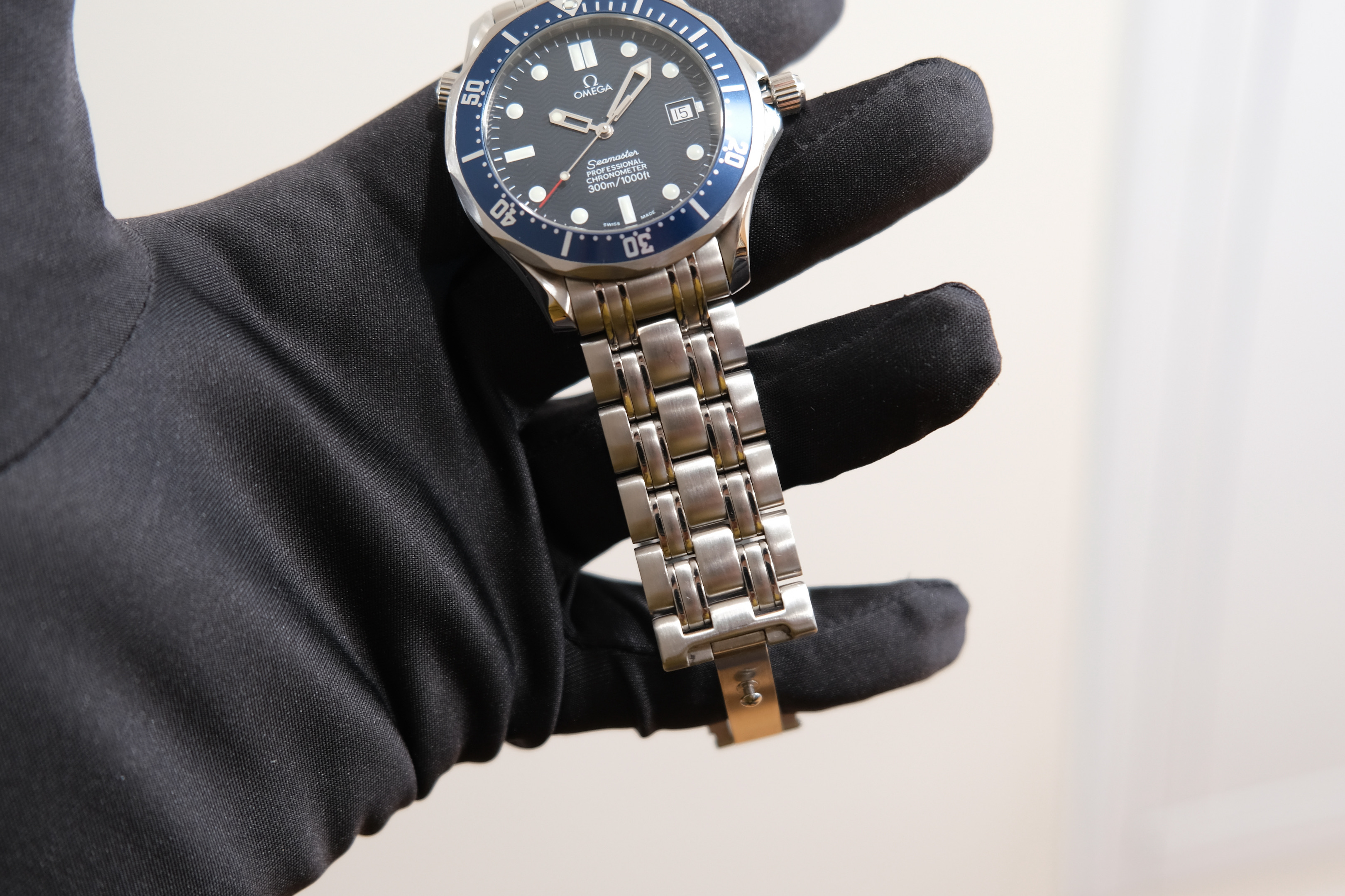 Up for sale is my much loved Omega Seamaster Professional, reference number 2531.80. It was serviced last year and the paperwork is dated 1/5/2021. There are superficial marks on the bracelet and clasp, which could easily be polished out if one was so inclined. The bracelet is currently sized for my 6.75 inch wrist, but comes with two additional full and two additional half links. The crystal and bezel insert are without blemish. There are some minor signs of wear on the periphery of the bezel. As I frequently changed straps on this watch, the backs of the lugs exhibit scratches that are not amenable to removal with a light polish. Also included is an OEM blue rubber strap with an older style OEM deployant clasp. The original red faux-leather box has long since disintegrated, so this watch will come with the OEM lacquered wood box instead.